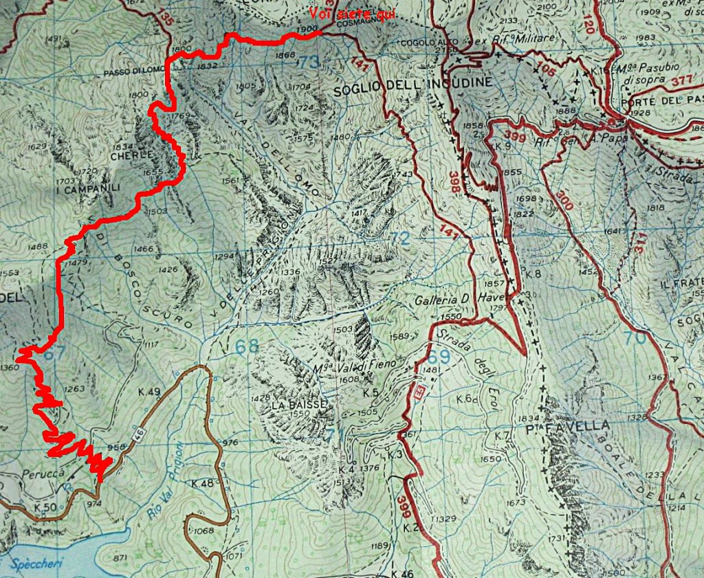 Provvedo a documentare questo sentiero in quanto e parte integrante del Val delle Prigioni-Passo del Lomo , e risulta un pò complessa la sua individuazione Questo sentiero e quello che io ho utilizzato per rientrare dal passo del Lomo , ci sarebbe il 135 che scende ai Raossi , ma però ti porta molto fuori da dove si mette l’auto per salire la Val delle prigioni e ti costringe a fare a piedi la strada della Vallarsa che risulta abbastanza stretta , invece con questo sentiero e possibile rientrare non troppo lontani dall’auto . Il sentiero sale a sinistra del passo del Lomo , per alcuni tratti e molto poco segnalato , ma in lontananza si vedono sia i muretti di contenimento che il continuo zig zag dello stesso , e abbastanza lungo da discendere ma e l’unica via più corta , la parte più difficile e quella vicino al passo dove dopo essere saliti per circa 10 minuti si inizia a scendere per un piccolo vajo , per poi mantenendo la destra raggirare le roccie e passare sul crinale , da questo crinale si può notare il sentiero già più calpestato e si inizia a vedere la strada della Vallarsa ; nel caso lo si volesse praticare