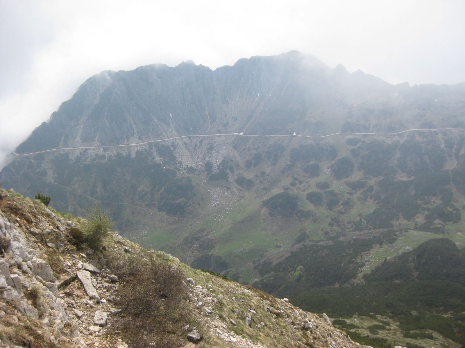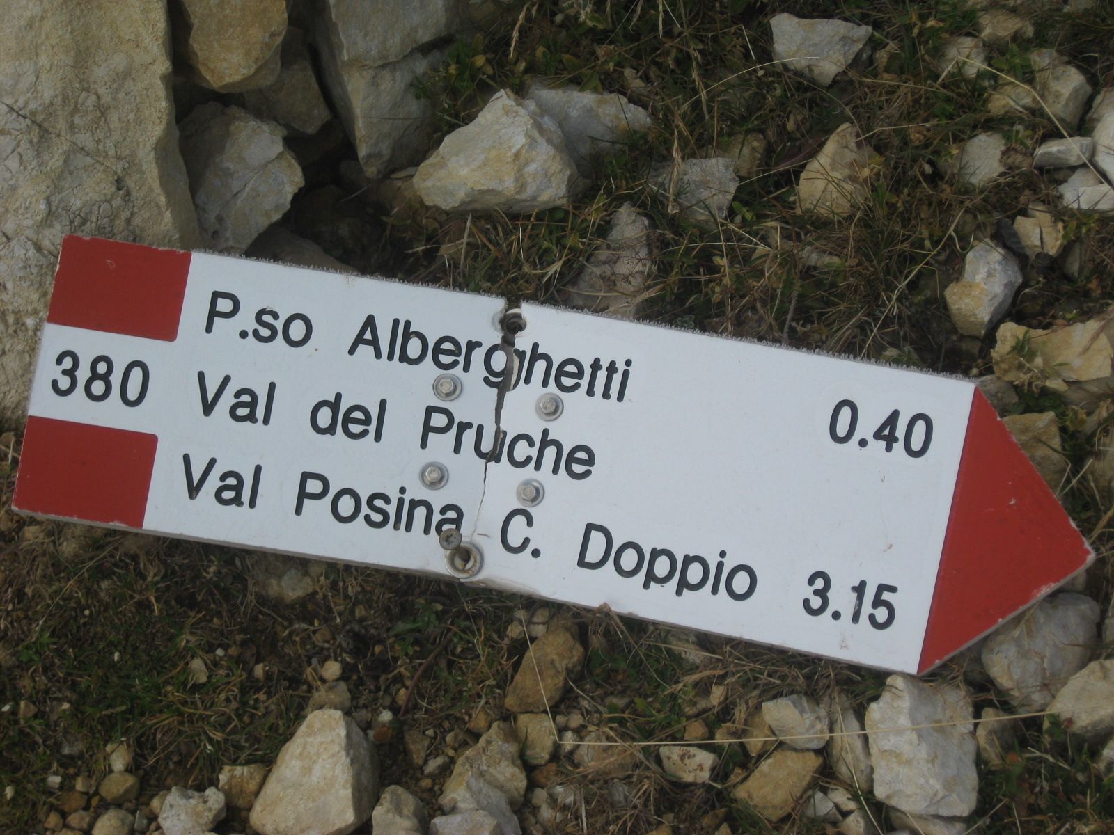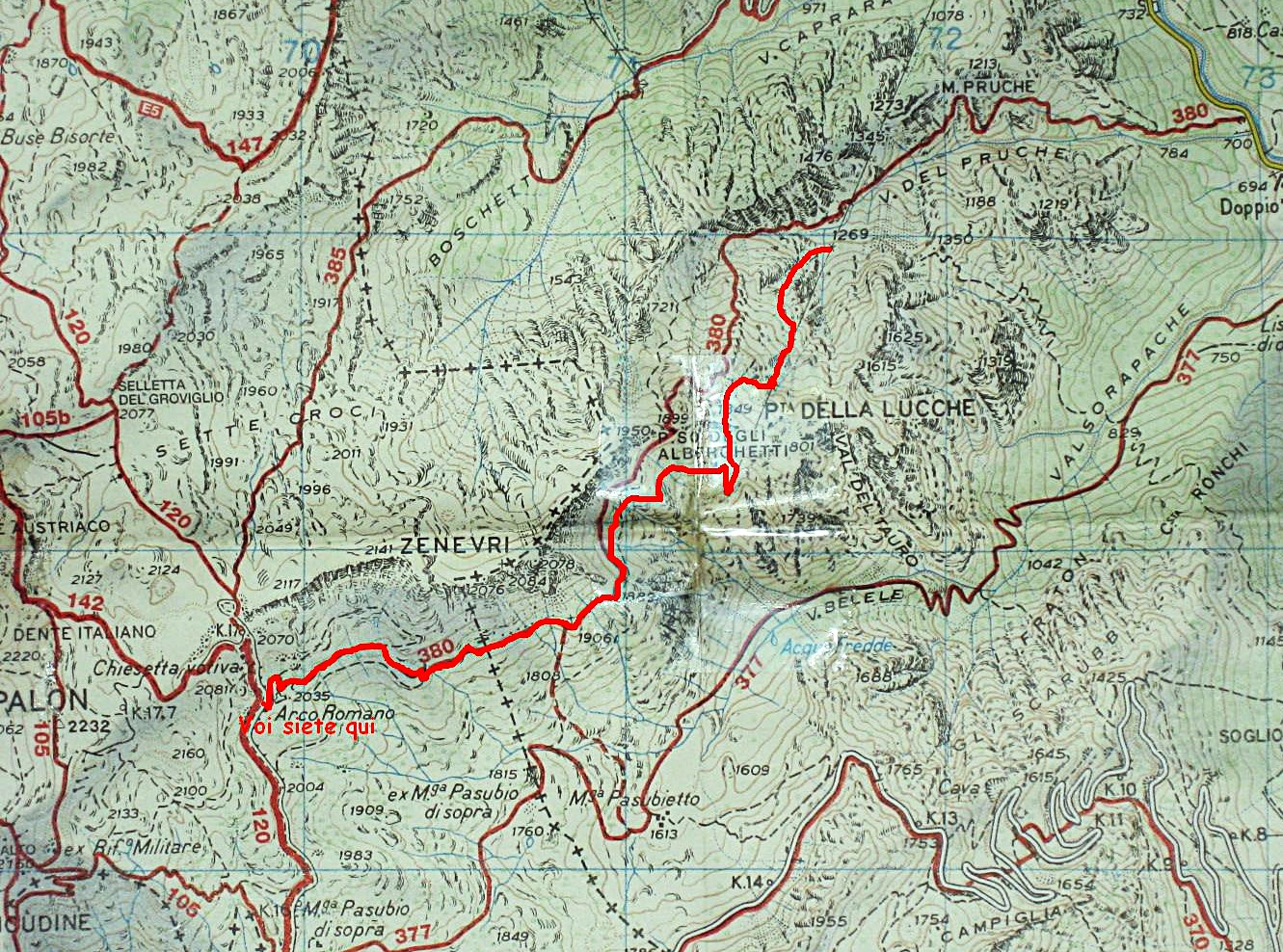 Dopo essere salito nei pressi dell’arco romano si prende a destra il sentiero 380 che porta a passo degli alberghetti , che poi porta a val pruche , ad un certo punto poco distante dal passo si può notare una carrareccia con terreno erboso che prosegue in basso , dopo averla imboccata si prosegue fino ad arrivare nella cava , poi nel frantoio e nella stazione della funivia , prendendo il sentiero sopra si possono travare i resti degli alloggi dei lavoratori della cava , mentre si può notare sulla cresta opposta il traliccio di passaggio per la discesa di val pruche , proseguendo per il sentiero , visibile anche su tratto erboso si scende fino alla trincea finale che domina la valle verso il passo della borcola , la risalita del sentiero si ripete parte del percorso fino al traliccio per poi proseguire per il sentiero più alto e tornare all’arco romano (tale sentiero nella parte iniziale può essere percorso nelle trincee e ricoveri situati in cresta )