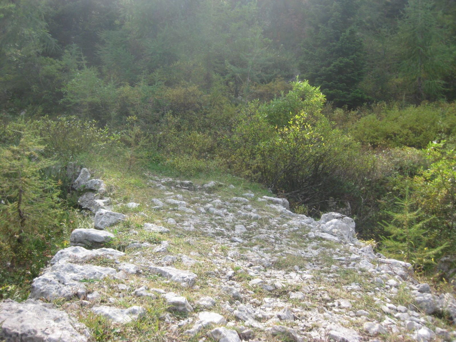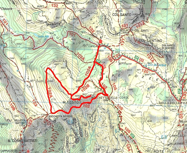 Sentiero molto bello con poco dislivello l’ideale da percorrere partendo dal rifugio Lancia , anche perchè la salita per arrivare alla bocchetta Foxi si dovrebbe fare o dal 122 Corno Battisti oppure dal 102 Val di Foxi e quindi richiederebbe un certo impegno fisico , la maggior parte dello stesso e tra i pini mughi e prato erboso privo di difficoltà e che ci permette di arrivare sul monte Testo ad ammirare lo splendido panorama verso il corno battisti e la val grobbe , molto belle e completamente aperte le gallerie di ricovero e postazioni sotteranee situate sul monte Testo , da li dopo averle visitate si ridiscende verso il rifugio Lancia e prendendo poi il 102 passando per la bocchetta delle corde si prosegue verso la bocchetta foxi scendendo per il sentiero 102 per la val foxi fino all’abitato di Anghebeni ,il tempo di percorrenza e di circa 6h , il sentiero si può anche prendere dal rifugio Lancia rientrando attraverso il 102 per bocchetta delle corde , in quanto si tratta di un anello .E INDISPENSABILE L’USO DELLA TORCIA O DELLA LAMPADA FRONTALE