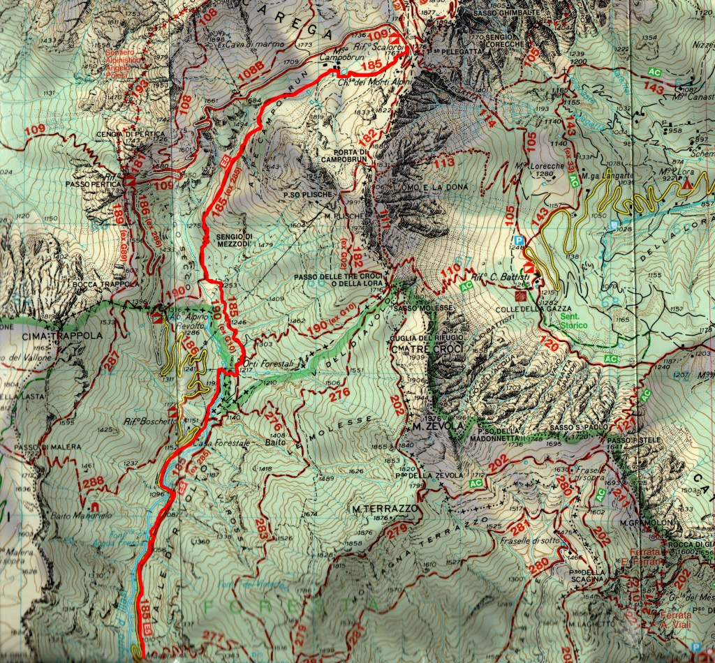 L’ideale per salire dal rifugio Cesare Battisti e salire il 110 fino al passo tre croci , poi prendere il 190 per scendere a lago secco e poi il 185 e salire fino al rifugio Scalorbi e scendere fino all’auto attraverso il 113l’omo e la dona , volendo lo si può fare anche al contrario ma è molto più bello salire il 185 che non il 190 Passo tre croci ( vedi descrizione )