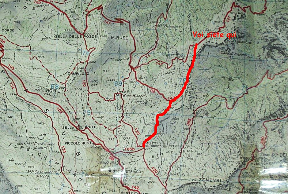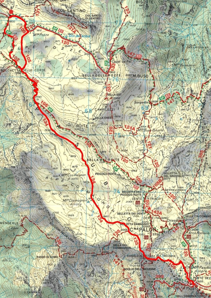 Dopo aver preso la statale che da Piovene Rocchette porta all’abitato di Arsiero si prende la destra per salire verso Tonezza e i Fiorentini , alla prima curva si prende a sinistra verso l’abitato di Posina , si prosegue fino al passo della Borcola che separa la val di Posina dalla Val terragnolo.Arrivati al passo si lascia la macchina e si prosegue a piedi fino ad incrociare il sentiero 147 a sinistra , non presenta difficolta tecniche , ma ci vuole un buon passo per arrivare al rifugio Lancia una preparazione abbastanza buona visto i continui saliscendi , e spettacolare dal punto di vista naturalistico e presenta delle varianti molto interessanti sotto il profilo storico perchè portano direttamente sulle fortificazioni Austroungariche situate sulla selletta del groviglio quota 2059 , da dove si può vedere la linea di fuoco italiana nella parte bassa dei roccioni (vedi variante Zenavri)raggiunta la quota sella delle pozze 1200 metri , prendendo sulla destra in circa 20 minuti di cammino si arriva al rifugio Vincenzo Lancia .