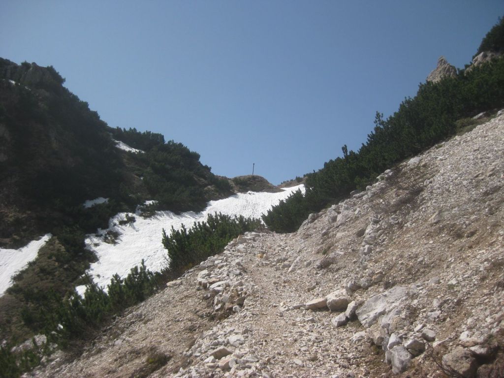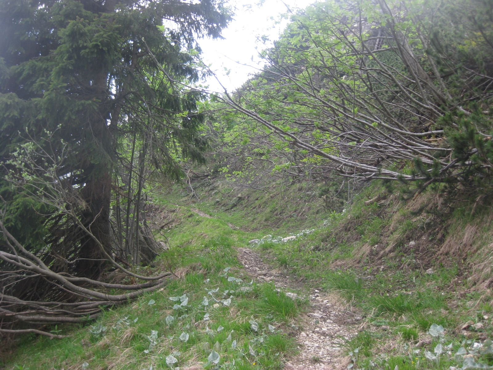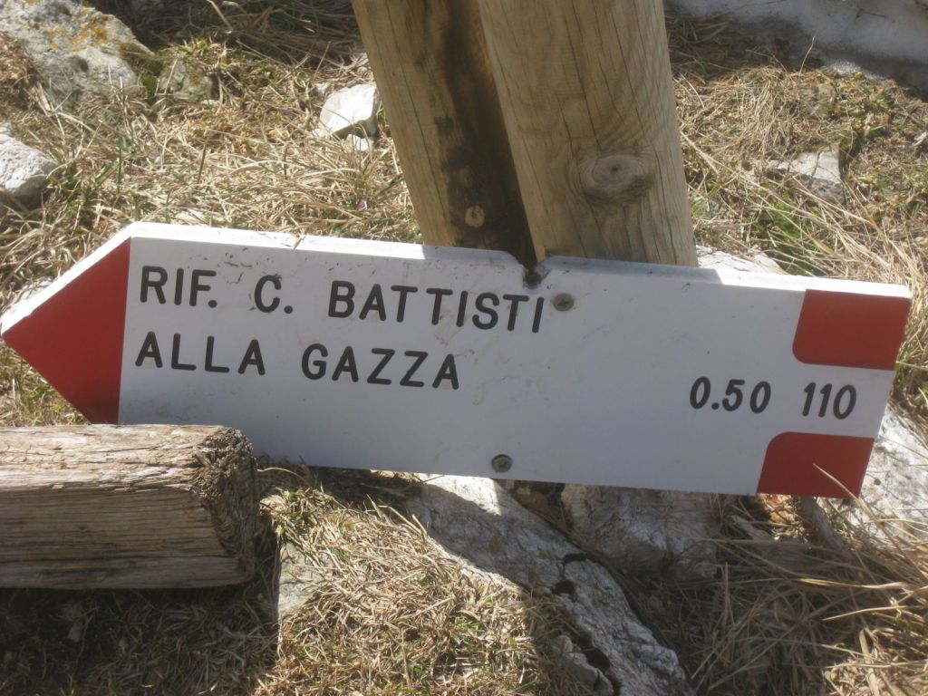 Questo itinerario parte dal Colle della Gazza, percorso molto interessante e panoramico, alcuni tratti verso la sommità su roccette e risalti anche se privi di grosse difficoltà lo rendono incredibilmente bello, si parte dal posteggio situato presso il rifugio Cesare Battisti 1265 m, si prende dapprima il sentiero n.105, che porta verso al Vajo Pelegatta e Vajo Scuro, si transita per Malga Lorecche 1280 m, mentre sulla sinistra inizia il sentiero con una salita abbastanza lieve inizialmente che continua a salire con i suoi zig zag, aumentando sempre più la quota e divenendo leggermente più difficoltoso. La maggior parte del sentiero si sviluppa in mezzo a mughi ed il panorama e molto bello verso il versante del Vajo Pelegatta. Si continua su ghiaie detritiche di grosse dimensioni, in cui prestare molta attenzione, si prosegue a salire mentre i massi e roccette si presentano più grandi e si intravedono i due roccioni dell’Omo e la Dona. A quota 1831m, incrociando il n.111 del Forcellin del Plische, che non è altro che un sentiero di raccordo di un certo impegno, e tutto su terreno ghiaioso, dopo aver passato il percorso in mezzo alle rocce si esce sulla Porta di Campobrun 1831 m, dove il sentiero entrerà nel n.182, a circa 20 minuti dal rifugio Scalorbi 1767 m. Normalmente questo percorso viene maggiormente accoppiato al n.110 che verrà usato per la discesa.