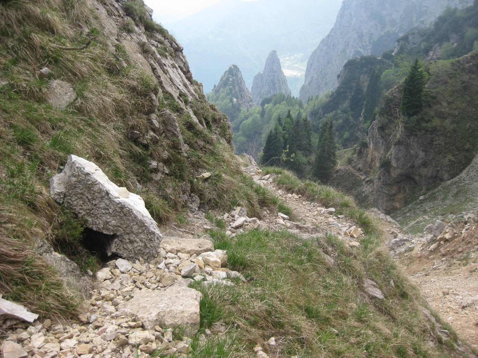 Sentiero molto bello che si inerpica per uno stretto vallone e costeggia il famoso campanile , tecnicamente e fisicamente non molto complesso anche se con buona pendenza , la visuale nella salita e molto bella se si trova una bella giornata . E INDISPENSABILE LA TORCIA PER LE GALLERIE SE SI VUOLE ANDARE AL RIFUGIO PAPA . La discesa può essere fatta per la val canale molto bella (poi io di solito imbocco il canale fluviale )fino ad incontrare il sentiero di raccordo per Pra dei Penzi