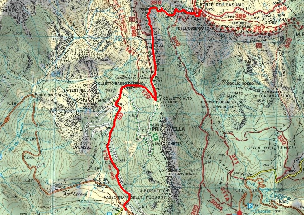 Arrivati in località Pian delle Fugazze sul posteggio situato a destra dove si può mettere la macchina , da li parte la Strada degli Eroi che porta al rifugio Papa alle porte del Pasubio , antico confine austroungarico , nel basso si possono ritrovare anche gli antichi Ceppi di confine, la strada e percorribile anche con la MTB e nel periodo estivo funziona anche un bus navetta , e abbastanza semplice non presenta grosse difficoltà , e la sipuò percorrere interamente oppure attraverso alcune scorciatoie ben segnalate , così facendo si risparmia un pò di strada visto la sua lunghezza a causa di molti tornanti circa 10 km , arrivati alla galleria D’Havet che va ad attraversare le creste che portano all’incudine , si può vedere uno scenario mozzafiato (tempo permettendo )della val Canale e del rifugio Papa , come anche del resto la strada delle 52 gallerie , la direttissima val Canale , il soglio dell’uderle ,il boale dei cavi , il boale d’inverno. La discesa può essere fatta dallo stesso sentiero o per persone un pò più esperte il 300 Val Canale per poi rientrare al pian delle Fugazze passando per la chiesetta e la Colonia di San Marco