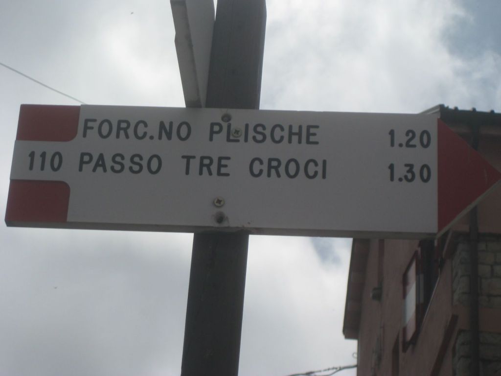 Arrivati sul colle della Gazza si prosegue verso il rifugio , e si imbocca questo itinerario segnalato con il n.110 , il percorso è semplice, poco impegnativo, privo di difficoltà che porta l’escursionista al Passo Tre Croci o Passo della Lora, il sentiero sale in maniera abbastanza lieve e con tornanti visibili anche da fondo dello stesso, si tratta di un percorso molto ghiaioso e detritico a causa delle pareti del Sasso delle Molesse 1801 m che lo sovrastano sulla sinistra soggette a continua erosione, e movimentate dagli agenti atmosferici. Si parte da una quota di 1265 m, man mano che si sale il percorso si rende più impegnativo e i detriti aumentano, superato il Sasso delle Molesse si prosegue verso destra fino a raggiungere il bivio di raccordo con il n.111 Forcellino del Plische, circa 1650 m, si attraversa verso sinistra culminando così sulla cima del Passo Tre Croci 1716 m, proprio al di sopra della Val del Diavolo , imboccando il sentiero n.202 a sinistra si può proseguire verso il Passo della Scagina, mentre sulla destra attraverso il n.182 si prosegue verso il rifugio Scalorbi .Normalmente questo sentiero viene usato per il rientro in quanto poco difficile. Se si prosegue per il n.182 passando per il Passo del Plische e successivamente sulla Porta di Campobrun fino a raggiungere il Rifugio Scalorbi .