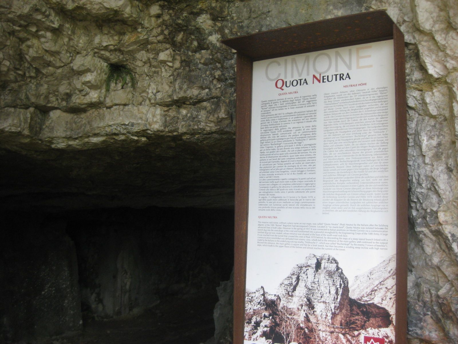 Questo massiccio torrione di roccia chiamato Quotoa Neutra perche era rimasto isolato dopo che i Rainer salisburghesi avevano conquistato il Cimone . Nella primavera del 17 fu collegato alle posizioni italiane situate sul Cavioio Tramite il grande camminamento laterale situato ad ovest . Oltre all’ingresso , la galleria e diritta e pianeggiante per un breve tratto , ma poi diventa tortuosa e molto ripida , sale con gradini alti e stretti quasi fino alla sommità del torrione . Ha una decina di diramazione secondarie che portano nel complesso sistema sotteraneo composto da ricoveri , una vasca per il recupero dell’acqua , 6 osservatori , due postazioni per cannoni calibro 65 , otto mitragliatrici distribuite su vari piani.