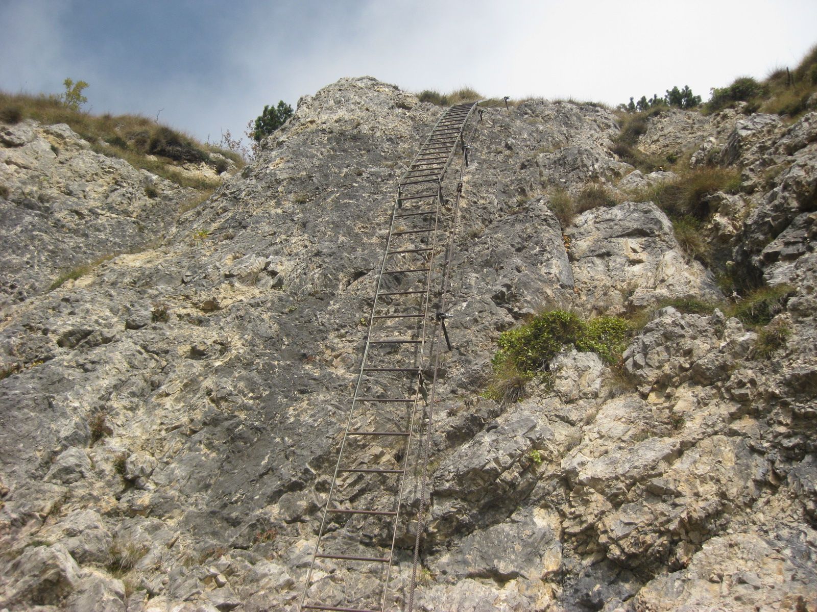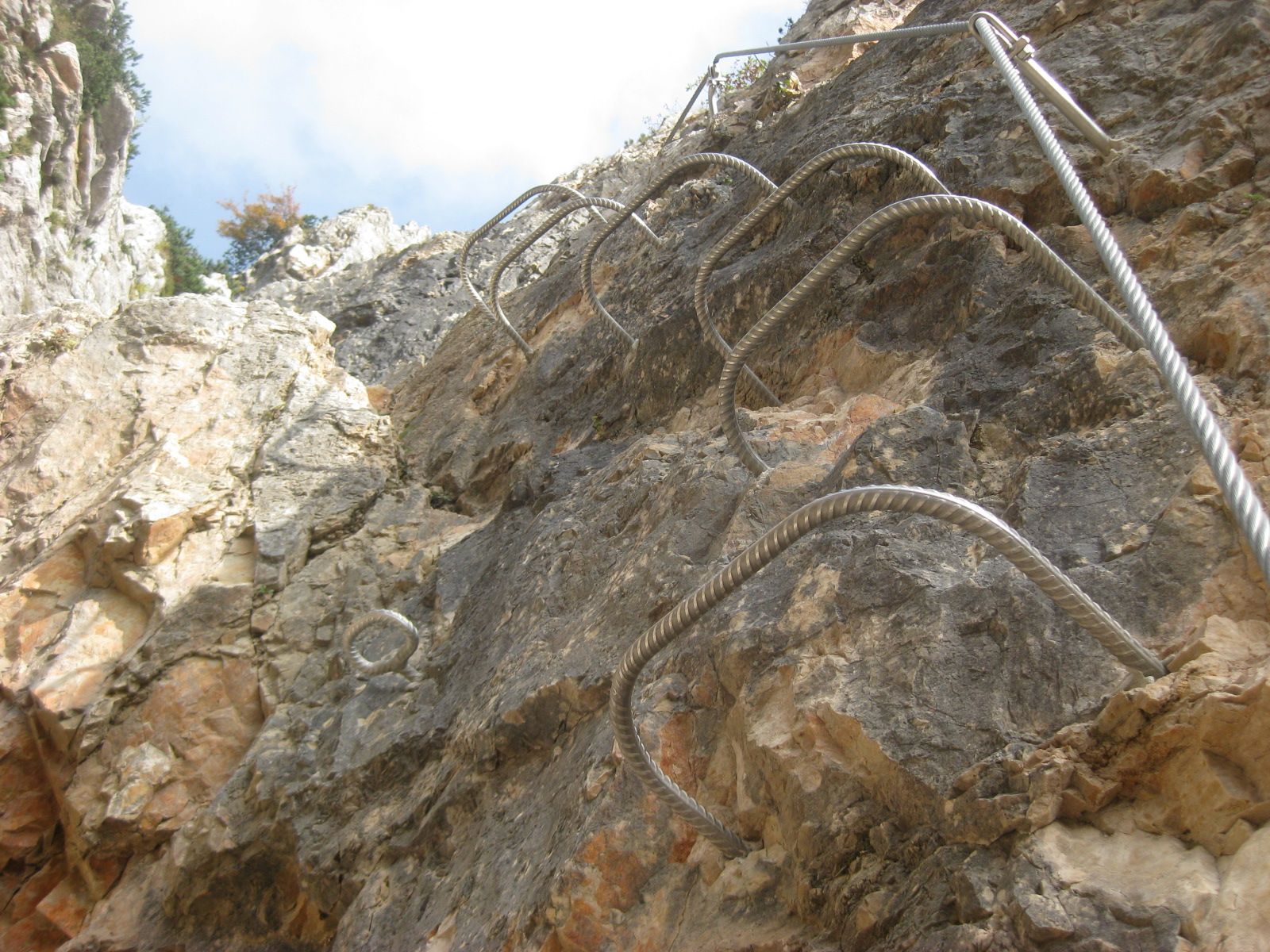 La ferrata è stata richiodata , per il problema di scariche di sassi in quanto passava nel canalone detritico , quindi risulta essere leggermente più complessa in quanto il primo pezzo la si percorre in una scala leggermente piegata all’indietro , in cui si usano più la forza delle braccia , ma superato questo ostacolo la restante risulta abbastanza semplice e bella da percorrere , salendo fino ad arrivare ad incrociare il 202 sentiero delle creste che porta a Campodavanti e Montefalcone .