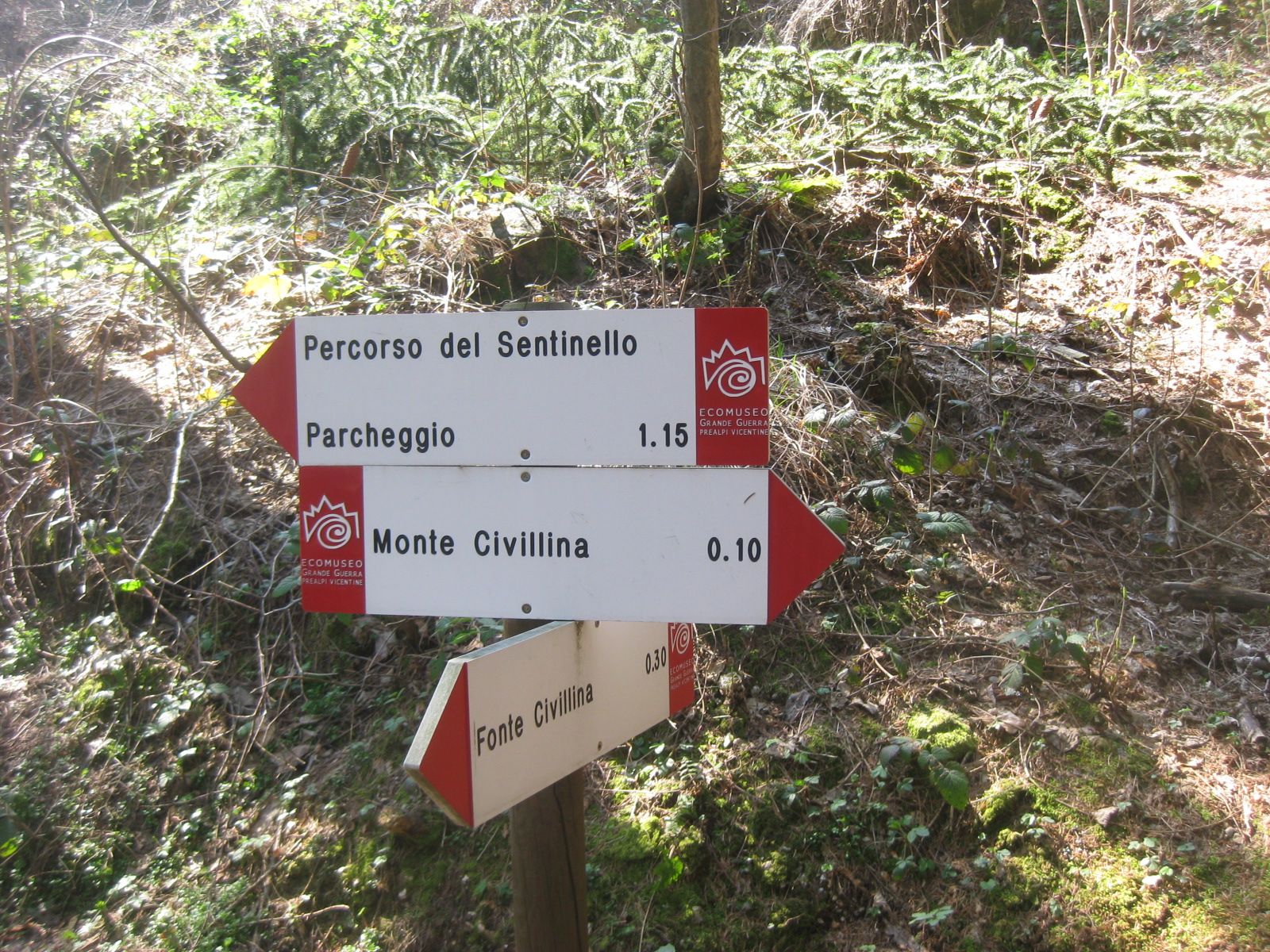 Il tratto del sentiero del sentinello , iniziava dal torrente Agno dov’erano istallate 6 mitragliatrici a difesa del fondovalle e si arrampicava verso la Contrada Fracassi dov’erano posizionato un ricovero per 60 uomini , per poi proseguire fino alla cima Civillina lungo la dorsale ricavando piccole postazioni per armi automatiche e alcuni ricoveri per ospitare le truppe , mentre nel lato sud della dorsale saliva la mulattiera per l’approvvigionamento dei viveri e materiali.