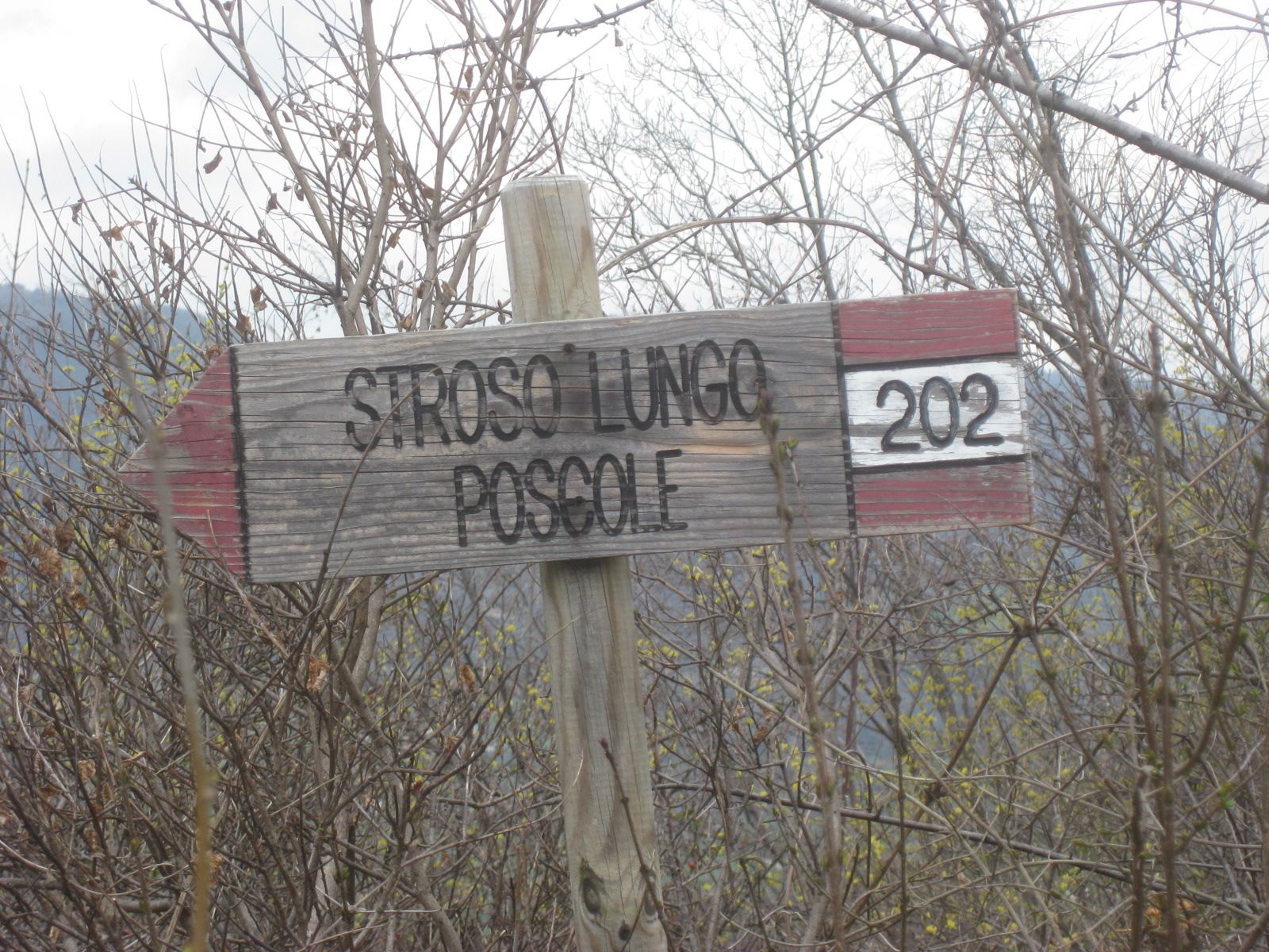 Si parte dalla zona industriale di Castelgomberto , si può anche volendo partire proprio dal centro , si prende la via che costeggia la Poscola , arrivati al ponte dove parte il sentiero 300 delle Poscole si procede per circa 150 metri e si scorge un sentiero a destra che sale 202 Stroso lungo (non segnalato ) delle poscole fino ad arrivare al Col del Peraroli , prendendo la prima a sinistra si prosegue per il sentiero 202 che sale verso il monte Grega , arrivati sulla strada asfaltata si può notare sulla destra il monumento ai caduti di Montepulgo , si prosegue a sinistra per la contrada Carletti e si continua diritto fino al bivio che svoltando leggermente a destra prosegue nel nostro itinerario incrociando il 203 Val di Barco è molto utile per accorciare il percorso ( in quanto scende direttamente sulla Val di Barco , la casa Rossa con il forno del pane ) nel nostro caso si prosegue il percorso fino ad arrivare in un grosso cancello in ferro battuto , da li si prosegue a sinistra lungo la recinzione fino a trovare un passaggio abbastanza visibile nel bosco adiacente alla proprietà e passante sul confine della proprietà stessa , si continua fino ad ritornare nel bosco e scendere al suo interno fino al raggiungere i campi sottostanti per poi risalire nel bosco e passare sulla fontana Checca ed arrivare alla Casa rossa Val di Barco per proi proseguire per la mulattiera fino ad ritornare al col dei Peraroli dal sentiero 203 . Superando il bivio con il 202 lungo la mulattiera prendere il primo sentiero a destra che porta alla chiesa di Santo Stefano per poi da li scendere dalla rivetta fino ad arrivare nella Villa Piovene da Schio per poi risalire la Poscola fino ad arrivare nella zona di partenza (o in Zona Industriale o in centro Castelgomberto )