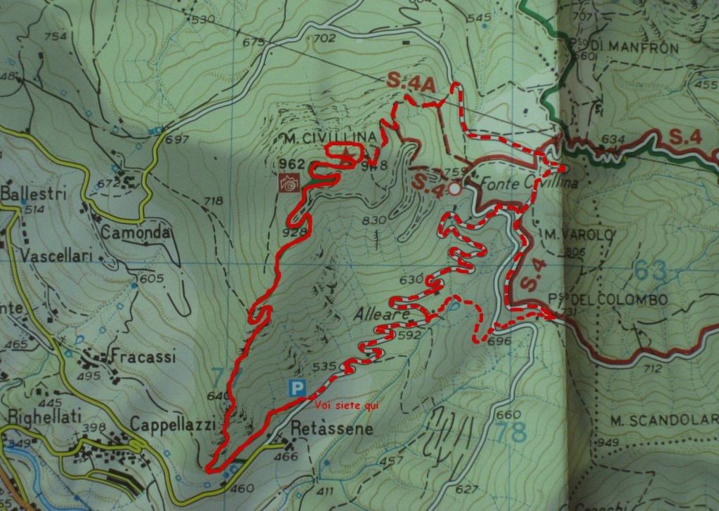 Uno dei sentieri molto belli da percorrere sia come trekking che come running , si sale in auto fino ai Bonomini poi si prende la strada per l’abitato di Rovegliana e si sale fino ad arrivare in contrada Retassene , da li superata la contrada esiste un posteggio dove mettere l’auto , poco sotto al posteggio c’è il segnavia del sentiero , molto bello e panoramico sale con una certa ripidità ma non e fisicamente difficile , consiglio portare con se una torcia elettrica per visitare le postazioni e inoltre di percorrerlo visionando tutte le opere militari giunti sulla cima del monte si possono visitare tutte le postazioni e trincee che circondano la sommità del Civillina. La discesa può essere fatta dal sentiero S4A fino a fonte Civillina per poi scendere attraverso la mulattiera fino in contrada Retassene .
