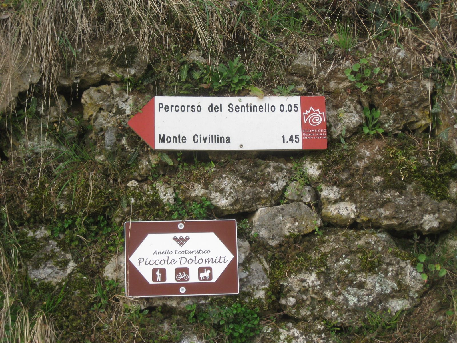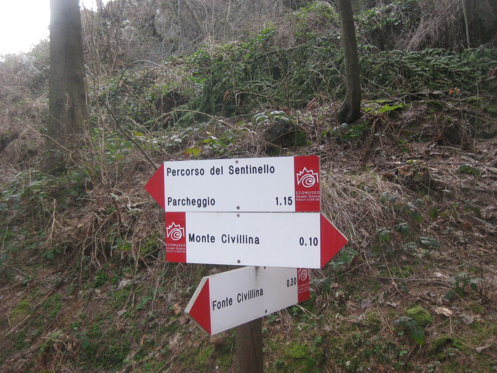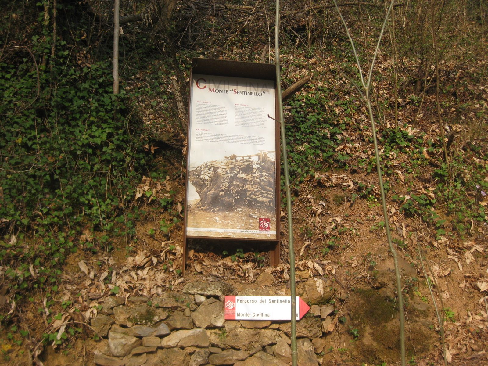 Il tratto del sentiero del sentinello , iniziava dal torrente Agno dov’erano istallate 6 mitragliatrici a difesa del fondovalle e si arrampicava verso la Contrada Fracassi dov’erano posizionato un ricovero per 60 uomini , per poi proseguire fino alla cima Civillina lungo la dorsale ricavando piccole postazioni per armi automatiche e alcuni ricoveri per ospitare le truppe , mentre nel lato sud della dorsale saliva la mulattiera per l’approvvigionamento dei viveri e materiali.