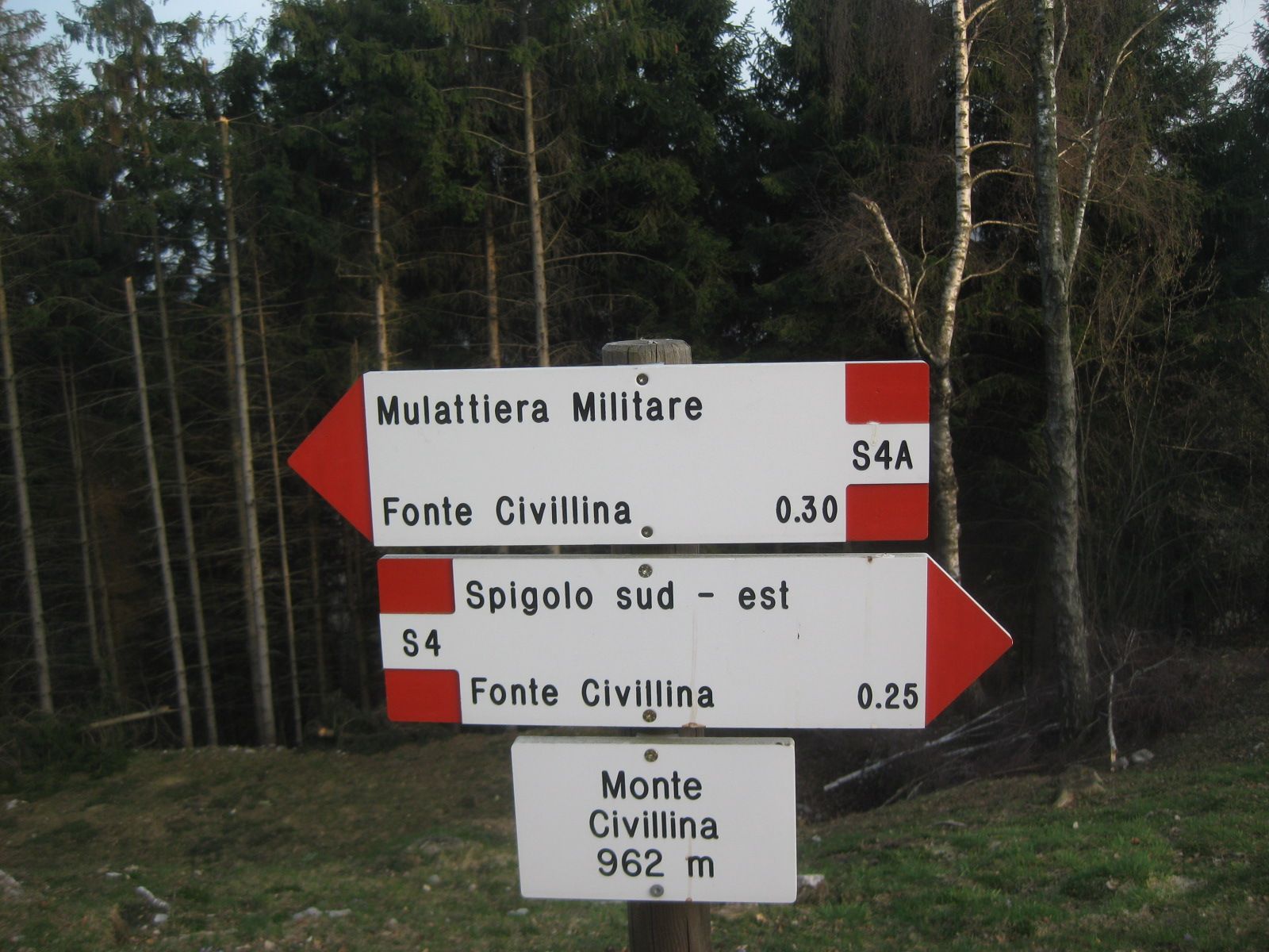 Uno dei sentieri molto belli da percorrere sia come trekking che come running , si sale in auto fino ai Bonomini poi si prende la strada per l’abitato di Rovegliana e si sale fino ad arrivare in contrada Retassene , da li superata la contrada esiste un posteggio dove mettere l’auto , poco sotto al posteggio c’è il segnavia del sentiero , molto bello e panoramico sale con una certa ripidità ma non e fisicamente difficile , consiglio portare con se una torcia elettrica per visitare le postazioni e inoltre di percorrerlo visionando tutte le opere militari giunti sulla cima del monte si possono visitare tutte le postazioni e trincee che circondano la sommità del Civillina. La discesa può essere fatta dal sentiero S4A fino a fonte Civillina per poi scendere attraverso la mulattiera fino in contrada Retassene .