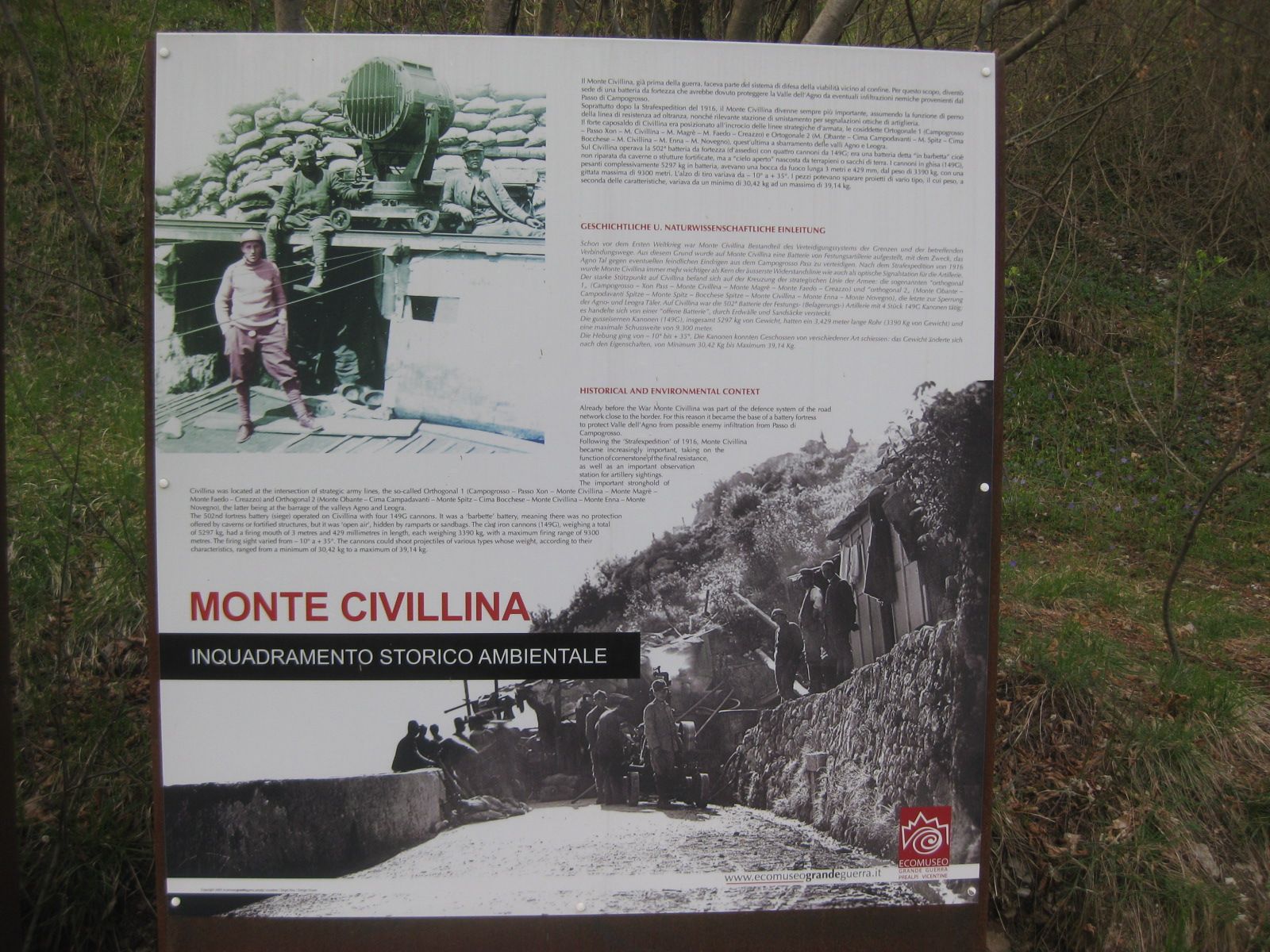 Il monte Civillina era servito da una camionabile che portava alla batteria dal Passo Zovo verso Castrazzano .Sulla cima protetta da diversa trincee situate tutto intorno al monte oltre alle postazione dei cannoni situate sulla parte più alta esistevano molti depositi e riservette di munizioni , una polveriera e i ricoveri adibiti agli artiglieri che presidiavano la posizione , costituito da la compagnia 2-3 del 6° Reggimento Artiglieria da Fortezza.La guarnigione di Civillina ususfruiva dell’acqua portata su dalla Contrada Retassene attraverso un acquedotto di sollevamento .Per cause sconosciute la Polveriera di Civillina esplose il 20 novembre 1915 .Nel 1918 nelle baracche di Civillina erano allogiati anche 157 uomini della 113° Compagnia Genio Zappatori