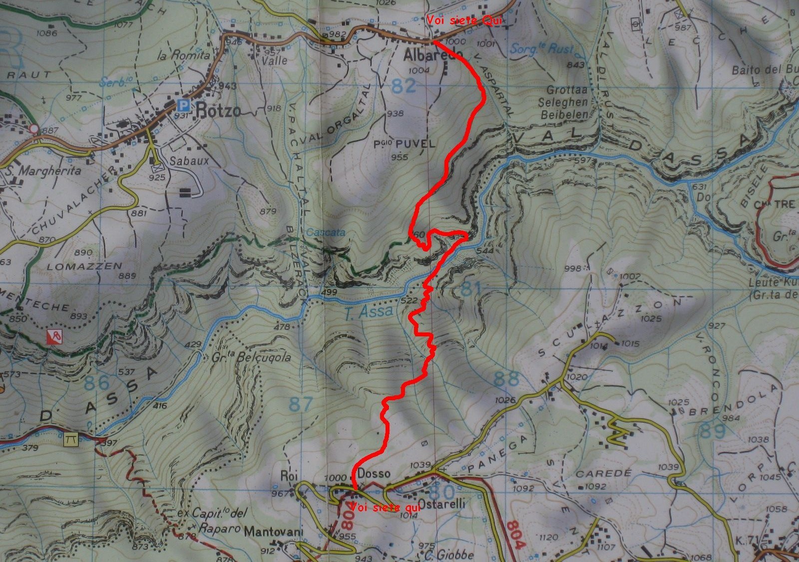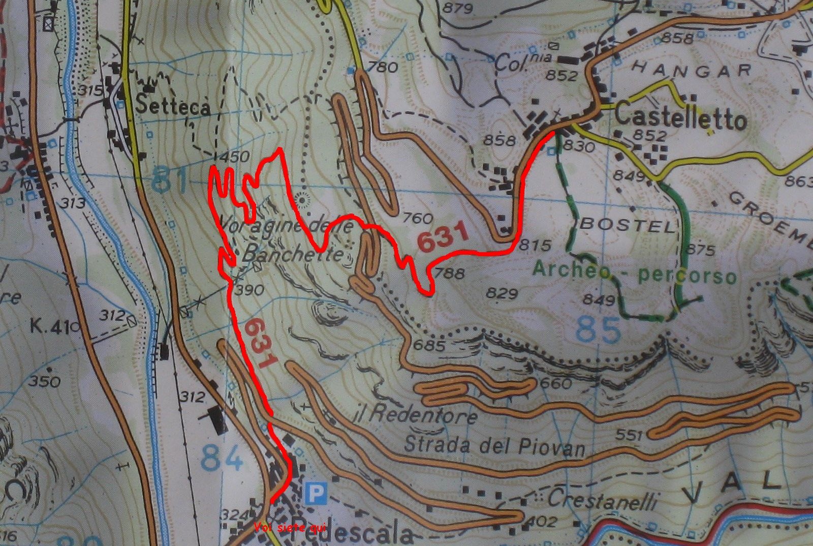 Arrivati al centro di Pedescala con l’auto , si entra nella piazza principale e si nota a sinistra un sentiero che parte a salire , lo si prende e attraverso i suoi 27 tornanti ti porta a Castelletto cento , più che un sentiero è una mulattiera molto bella da percorrere anche per alcuni scorci panoramici che offre , non presenta alcuna difficoltà anche se dopo la discesa dev’essere fatta dallo stesso punto , si potrebbe anche usare parte del 804 da Albaredo fino alla Val d’Assa passando per il sentiero Archeo geologico , per poi scendere attraverso parte del 633 fino al Cimitero di Pedescala (sentiero fatto ma non ancora del tutto verificato)