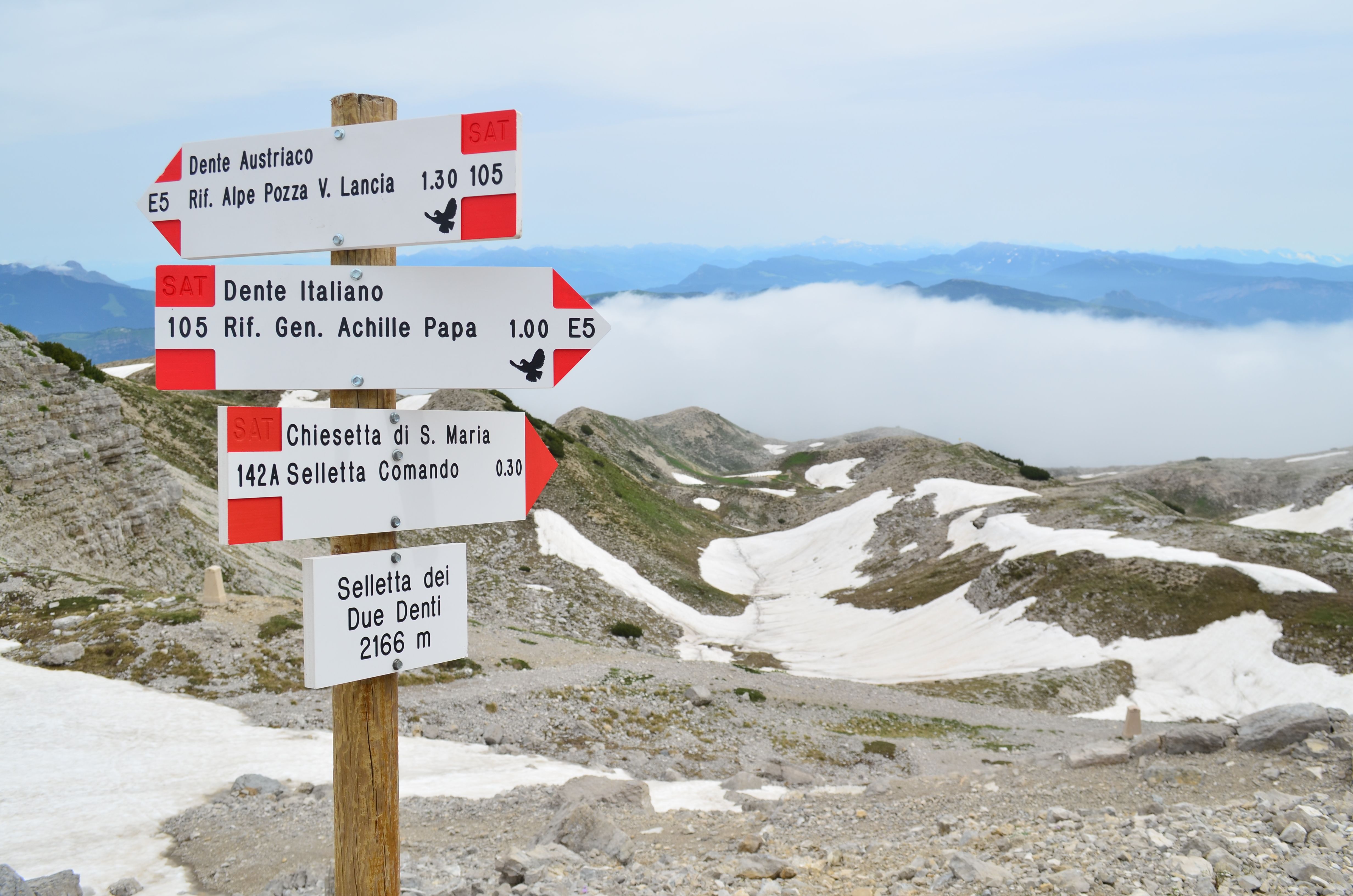Anche se fatto alla rovescia il 105 sentiero delle creste o tricolore che dir si voglia , sentiero molto interessante segue buona parte delle postazioni della grande guerra compresa la galleria Ellison e la galleria Achille Papa , ricordo a tutti che la guerra di mine sui denti fu molto accesa e aspra con diverse perdite da ambo le parti . E che lo scoppio dell’ultima mina devasto parte del dente italiano , resta comunque un percorso da percorrere e dedicare del tempo ad ispezionare e comprendere la vastità e l’importanza di questa parte di fronte conteso e considerato la terra di nessuno , ricordo inoltre che nel periodo della guerra negli inverni rigidi la coltre nevosa arrivava fino a 10 metri rendendo difficoltose anche gli approvvigionamenti delle truppe . dopo aver risalito il monte roite il sentiero costeggia fino ad arrivare alla seletta dei roite e transita passando per il piccolo roite e raggiungendo il dente austriaco che come si può osservare presenta le trincee fortificate con cemento armato , e da li si può vedere molto bene il dente italiano , si scende fino alla selletta dei denti, mentre si sale il dente italiano nella parte devastata dall’esplosione della mina , per poi arrivare alla seletta damaggio e salire a cima Palon da dove parte la galleria Achille Papa che porta alla selletta damaggio da li si può anche notare il camminamento ghersi che porta alla chiesetta di santa maria , nel nostro caso si prosegue per il cogolo alto e poi si scende fino al rifugio Papa , da li prendendo il segnavia 300 si può scendere fino ad arrivare al rifugio Balasso dove si ritrova l’auto