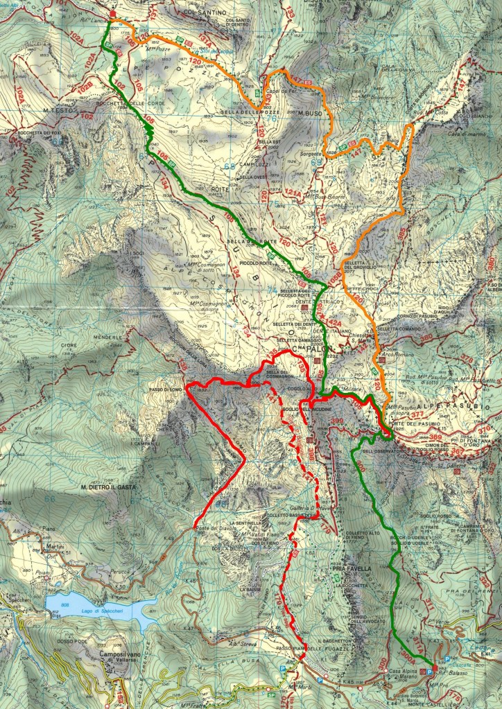 Questo itinerario e dedicato alle mie amiche e compagne di trekking Antonella e Paola. Paola mi chiede : mi fai un itinerario da percorrere in 2-3 giorni con la possibilità di avere dei rifugi di appoggio . Tra le tante peripezie è uscita una cosa molto interessante sia sotto il profilo tecnico che fisico , il tracciato che percorre anche alcune zone poco conosciute e molto interessante , a partire dalla Val delle prigioni fino a percorrere la prima linea di fuoco austriaca situata sul crinale della selletta del groviglio , e per completare l’opera il 105 sentiero delle creste o tricolore .