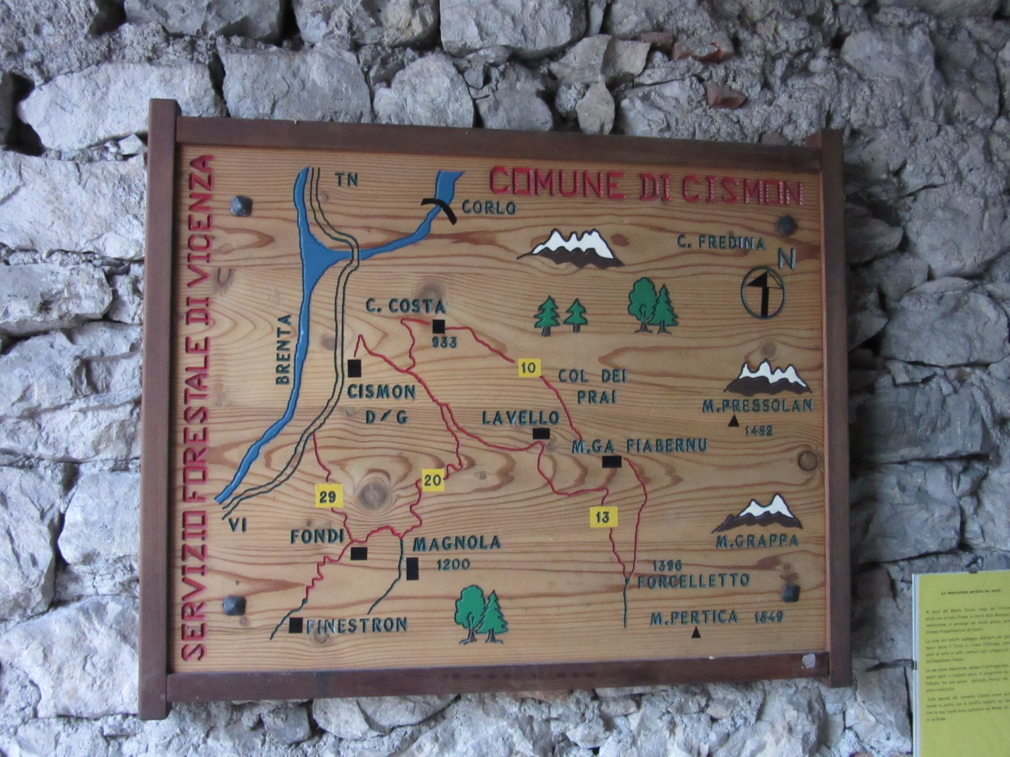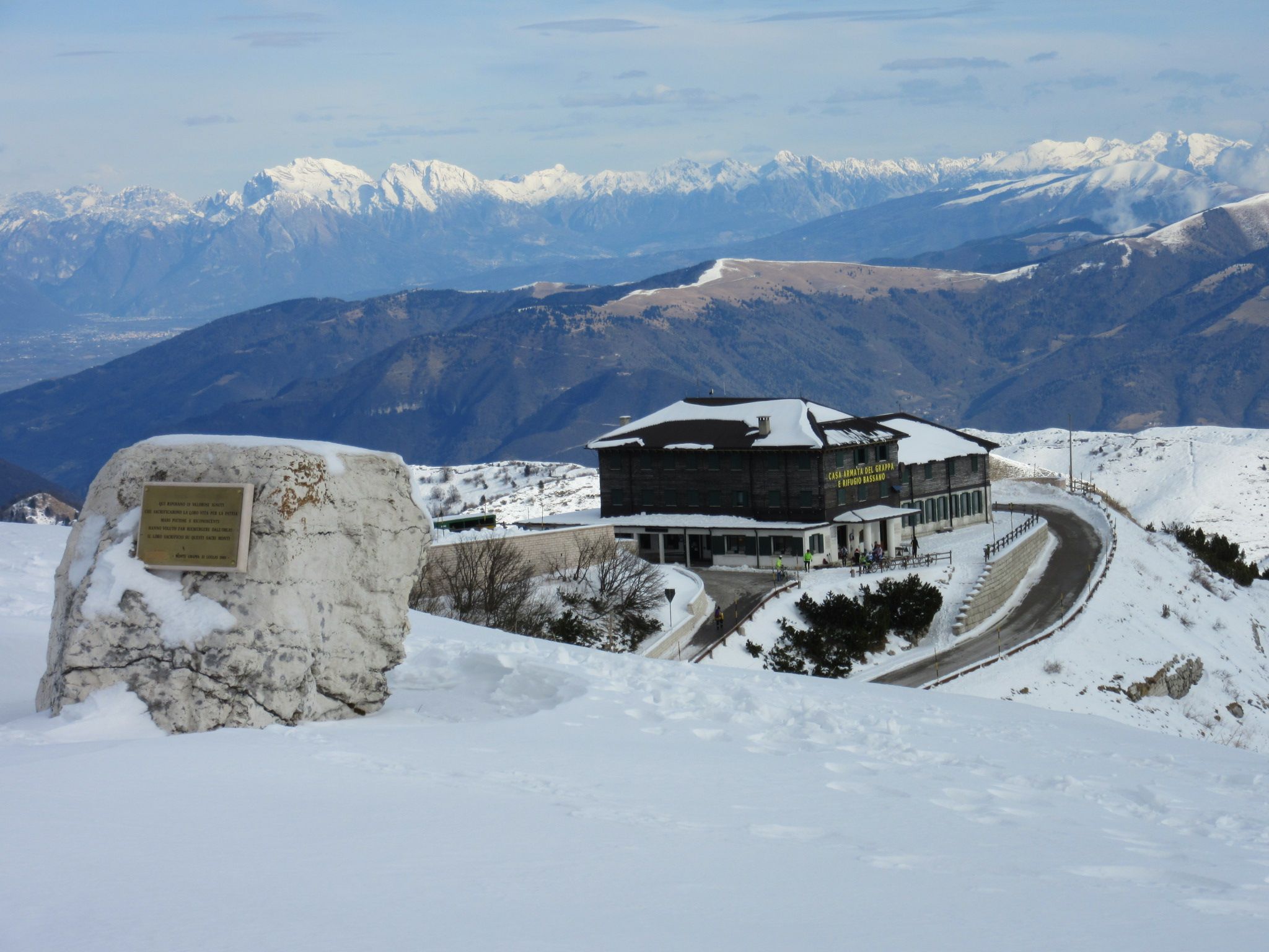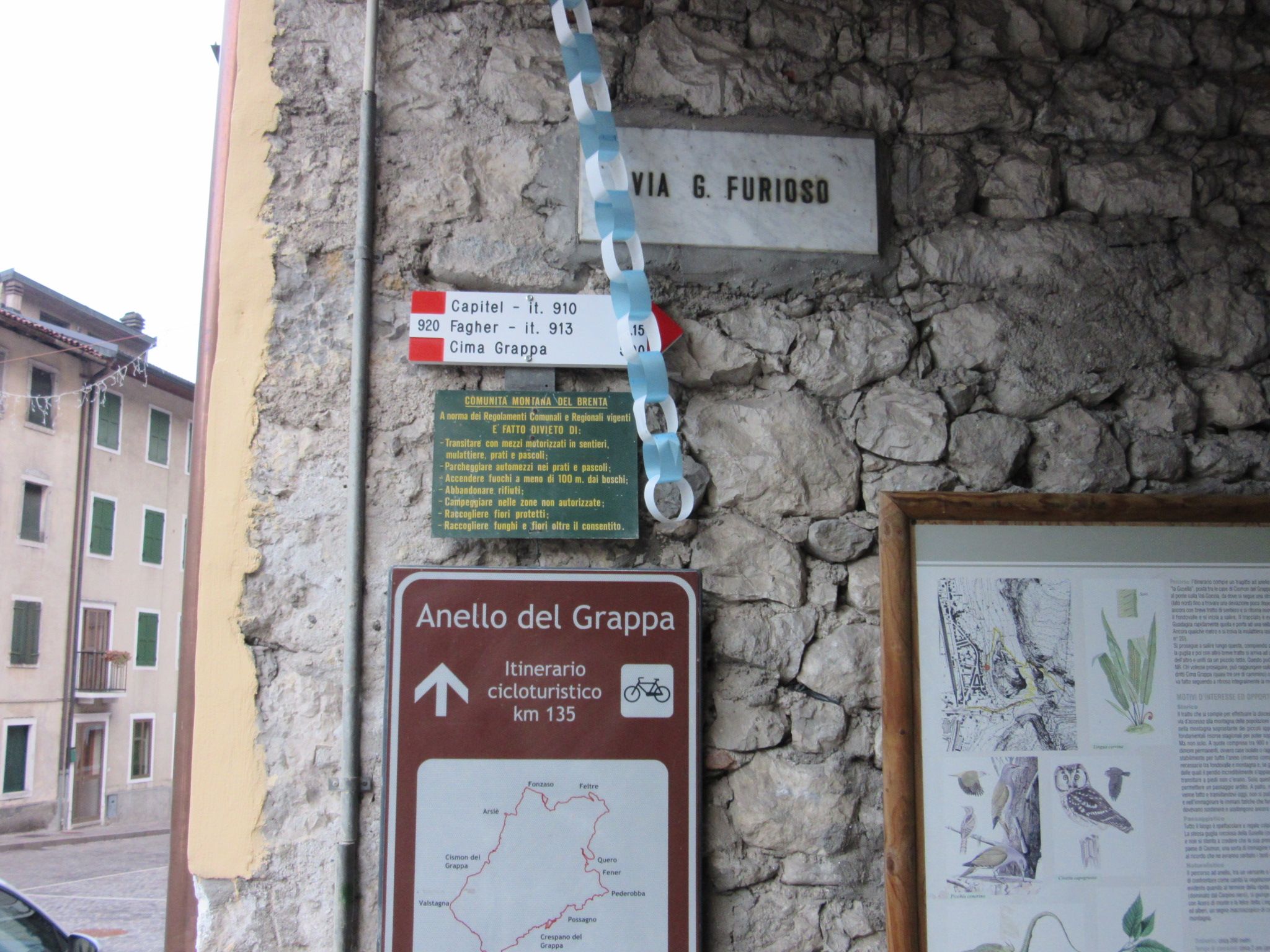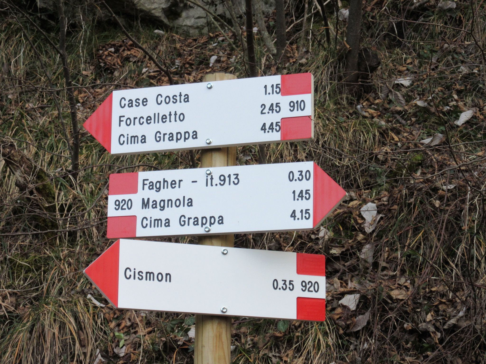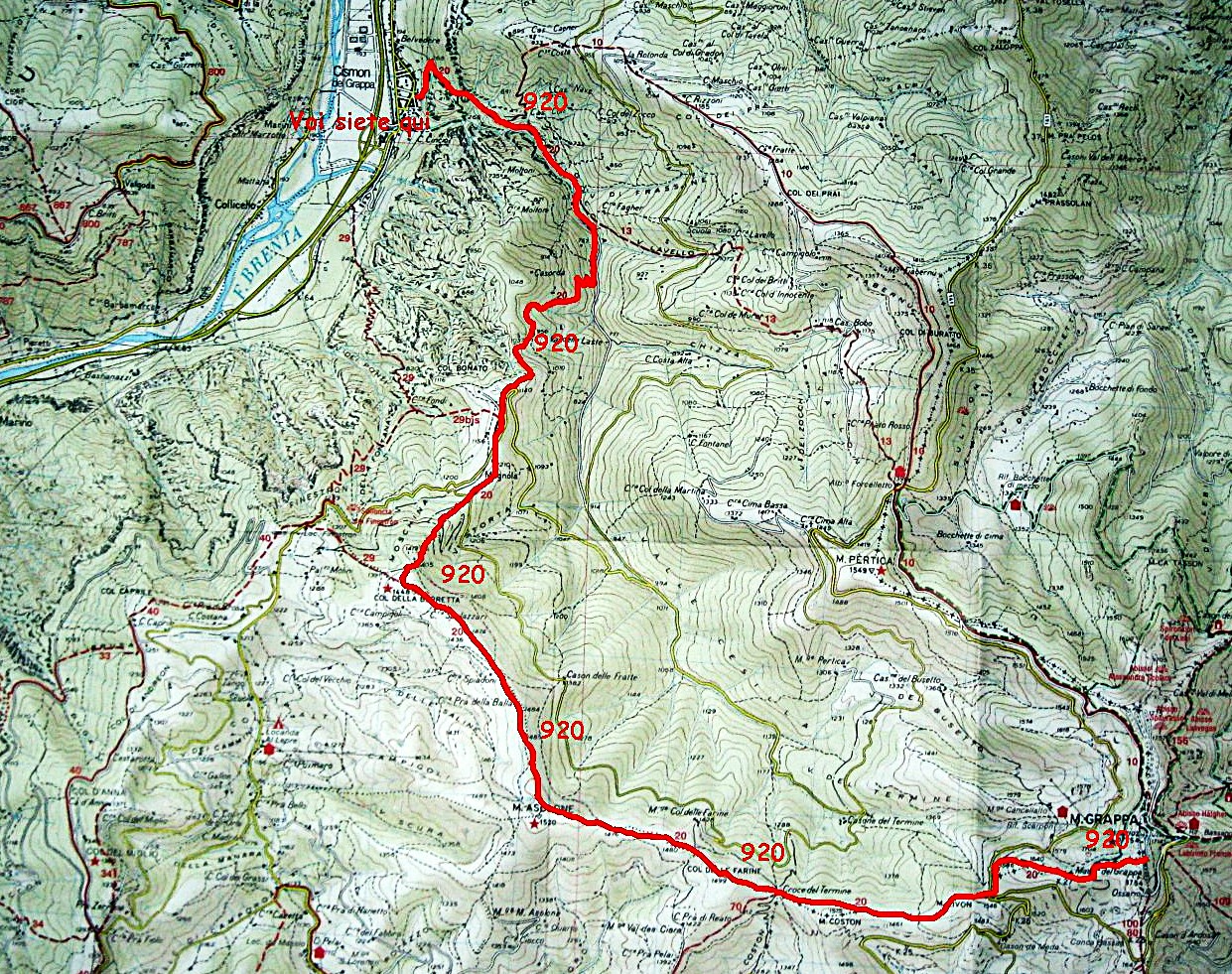 Da Bassano del grappa prendendo la Valstagna si sale fino in località Cismon del Grappa , in centro del paese si mette l’auto e si prosegue in mezzo alle case fino ad arrivare in un portico con il segnavia 920 ( ATTENZIONE LE NUMERAZIONI DEI SENTIERI SONO STATE CAMBIATE DALLA CARTINA ORIGINALE 20 E STATO SOSTITUITO DAL 920 ) . Questo itinerario e molto bello ed interessante sotto il profilo storico e panoramico , il sentiero e fatto in gran parte di ciotolato con scalini bassi e protetti dai massi laterali , in molti casi protetti anche da dei parapetti , la salita presenta discretamente impegnativa , e per arrivare in cima al Sacrario del monte Grappa la distanza e molto lunga anche se presenta all’altezza del Col delle Farine la possibilità di tagliare il percorso e collegarsi all’itinerario del 910 ex 10 dal quale si può scendere di nuovo fino a Cismon del Grappa , per chi invece possiede la preparazione fisica per fare tutto l’itinerario completo li rimando ad un altro post percorrendo il segnavia 920 in andata e il 910 per il ritorno , ma invito tutti a valutare bene questa cosa in base alla propria preparazione , anche se non e una cosa impossibile da fare , inoltre salite con umilta e rispetto questo grande massiccio , e quando affronterete ogni singolo colle ricordate di quanti hanno perso la vita su questi prati e su queste rocce che conservano la storia
