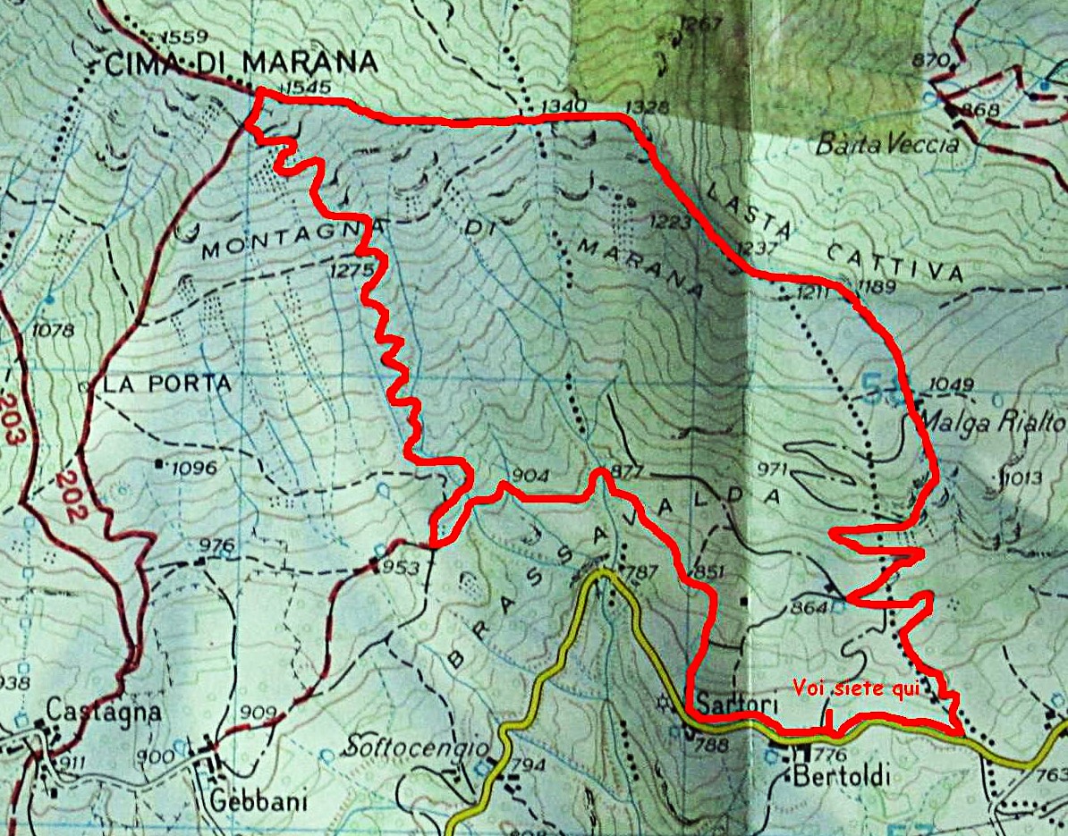 Si sale in auto fino a Zovo di Castelvecchio e si prosegue verso localita Marana , arrivati ad un certo punto in località Bertoldi ( per i Valdagnesi all’ex Miramonti ) si può posteggiare l’auto e si prosegue a piedi fino a contrada Sartori , a questo punto si svolta a destra in una carrarreccia che porta nel bosco al primo bivio si prende la sinistra e poi si sale fino alla malga situata sopra i Gebbani , da li inizia il percorso più bello e con panorami molto interessanti , si sale fino alla croce situata sulla cima , inoltre e presente anche piccolo bivacco gestito da volontari , che si presta per eventuali variazioni climatiche . Da li si scende dalla dorsale opposta che porta fino a Bocchetta di Marana dove e presente un bivio molto importante , da cui si possono prendere diverse direzioni quello di sinistra porta a Fongara attraverso il sentiero dei pascoli , quello dritto poco conosciuto porta alla croce dei Castiglieri per poi poter scendere verso la val del Boia ( oppure per chi volesse allungare l’anello fino alla Baita vecia , poi in contrada Tomba per poi ritornare al punto di partenza attraverso la strada asfaltata ) mentre quello di destra che fa parte di una gara che viene fatta in questi sentieri porta prima a malga Rialto o Realto , per poi scendere allo Zovo di Castelvecchio Questo anello e molto bello ed interessante non presenta difficoltà tecniche alpinistiche e non richiede una grande preparazione , tempo permettendo risulta anche molto panoramico .