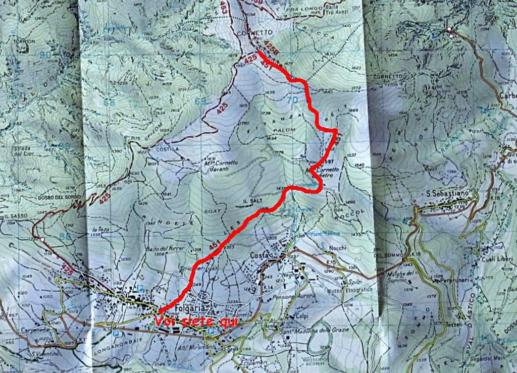 Per arrivare a questo sentiero un pò fuori portata , si sale con l’auto fino a Folgaria , cittadina molto bella , per raggiungerla ci sono diverse strade tutte però con diversi km di strada di montagna , io ci sono salito da Tonezza del Cimone . Comunque credo che la via migliore sia la Valdastico passando per Lastebasse e Carbonare . Arrivati in centro si prosegue per il campo sportivo , li si puo mettere l’auto oppure nel primo posteggio che si trova , io l’ho messa in via del parco ( dove si trova un parco per bambini ) posteggio gratuito , visto che era anche a metà strada tra il sentiero 425 e 451 , tornando in dietro si trovano le segnalazioni per il sentiero risalendo prima una valle , e poi attraverso una carrareccia si entra nella parte boschiva , per poi uscire in un zona prativa adibita a piste da sci , ora in disuso , da li si sale con facilità il sentiero e molto bello e poco difficile anzi molto rilassante , anche se ovviamente in salita , si passa vicino ad una fontana molto carina e ad un bivio che porta al rifugio Paradiso gia segnalato in un ‘altro post , si continua a salire fino a monte cornetto , dove tempo permettendo si offre un panorama incredibile a 360 gradi , da li si può salire ancora oppure discendere per il 425 che va chiudere ad anello il percorso .