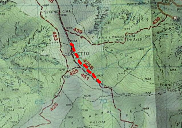 Questa e una variante del 425 , ma solo nella parte alta cioè nel tratto che porta dal monte Cornetto al Becco di Filadonna che viene presa solo salendo dal 451 , oppure in discesa dopo aver percorso il 425 Folgaria monte Cornetto Becco di filadonna , permette di deviare il percorso scendendo dal Becco di Filadonna senza passare per il monte Cornetto . Salendo dal 425 a mio avviso non conviene prenderla perchè per imboccarla non si riesce passare per il Monte Cornetto.