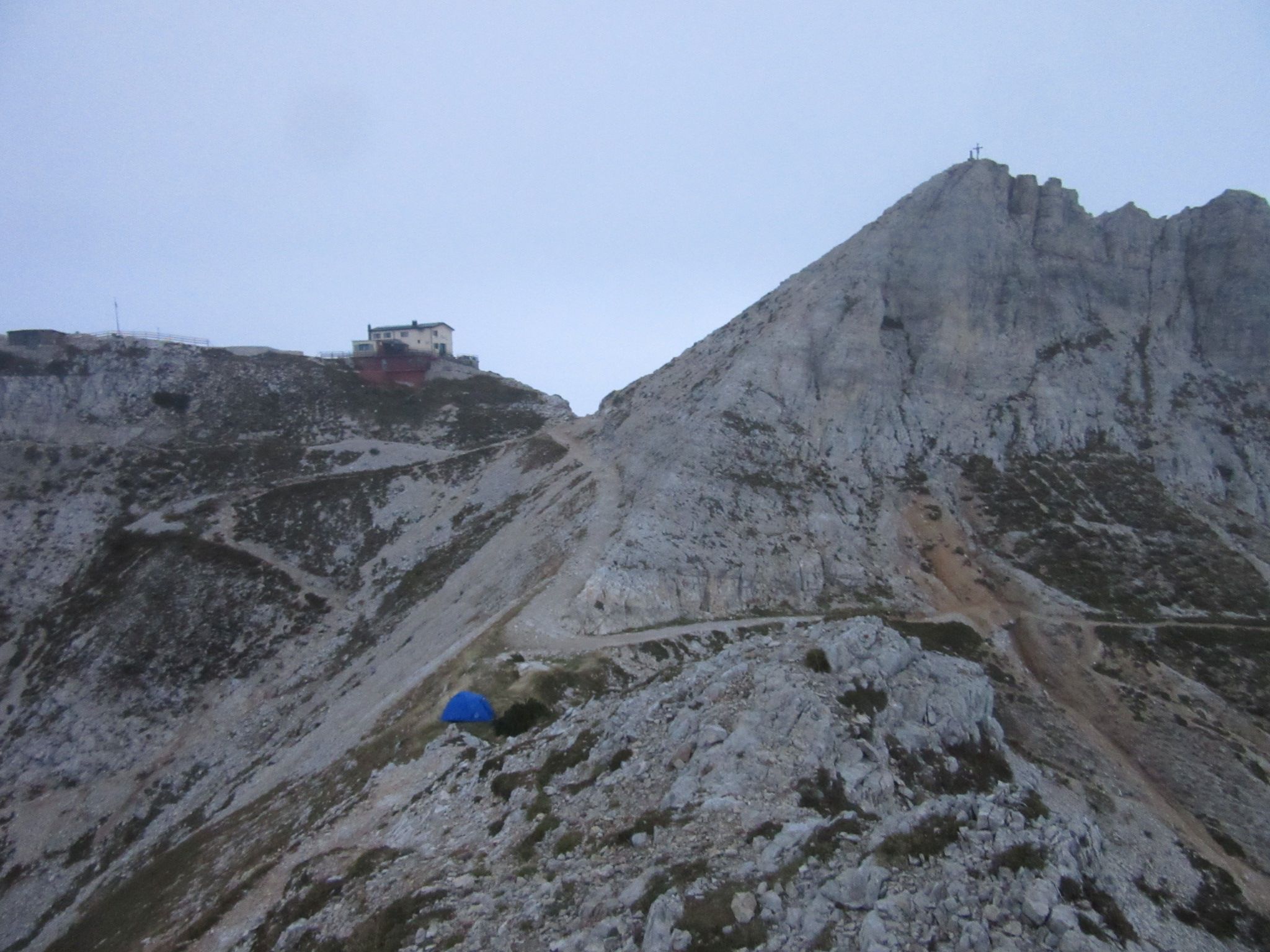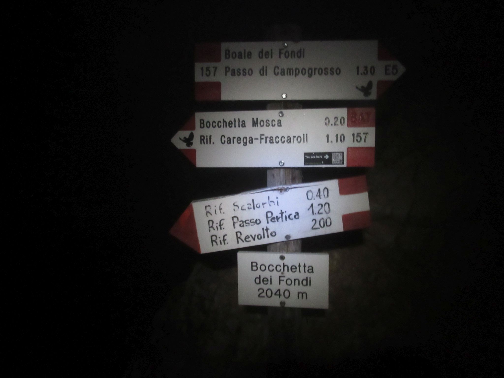 Ore 23 Campogrosso , ho deciso di salire da Bocchetta Fondi sentiero 157 con lo zaino tutto il necessario per la notte , salgo con tranquillità ad un certo punto le luci della città non si vedono più vengono nascoste da una nebbia folta e umida , si sente il silenzio , il fruscio delle foglie mosse dal vento mi fa compagnia , salendo penso a dove posizionerò la mia tendina , microscopica nella grandezza della montagna ma unico posto dove poter riposare sentendo solo i rumori attorno , il vento e il totale silenzio . Salgo fino alla curva del rifugio Fraccaroli , non si vede perche coperto dalla nebbia . Eccolo li il posto alla fine della Ferrata Campalani noto il piccolo spiazzo giusto nel crinale , sposto alcune pietre e controllo bene lo spazio ; sono le 00.30 monto la tenda e giro l’apertura dove posso vedere il sole , anche se l’indomani non ci sarà . Mi scaldo un po di caffelatte , e poi a dormire , sono 1.30 prendo sonno e mi lascio cullare dal fruscio del vento , sento il telo che si muove e verso le 4.30 la curiosità di guardare fuori per vedere com’e il tempo , lo smog luminoso pervade anche la montagna ma il vento a svolto il suo lavoro ha fatto sparire la nebbia . Poi torno dentro al mio sacco a pelo , vedo lo schiarire dell’alba ed un flebile sole che compare e scompare dentro un grosso strato di nuvole , ma lo spettacolo non ha prezzo , quello che ieri era tutto nero ora ha preso vita , tutto si vede intorno Cima Posta , il rifugio , bocchetta mosca , e tutto il resto , decido di proseguire per un’itinerario non facile con il peso dello zaino scendo verso la capanna Sinel dove trovo l’unica persona che aveva dormito nel bivacco , ci scambiamo due parole , le persone che salgono in montagna non servono inutili formalismi “ciao come va ? il tempo che tenga? Da dove sei salito ? ” . Questa e la montagna , grande palestra sopratutto per la vita …e non si finisce mai di imparare …Luciano