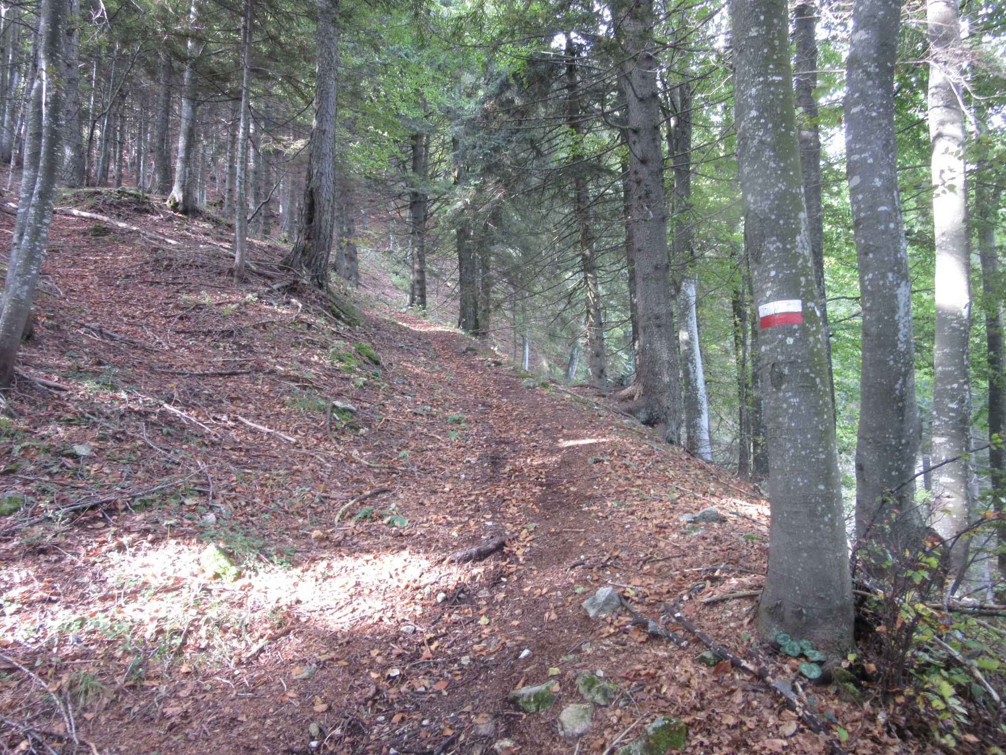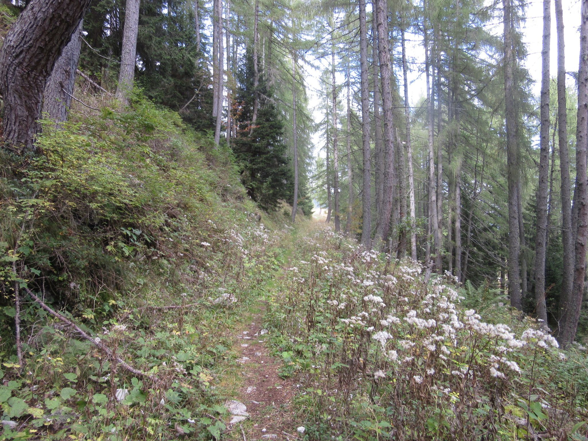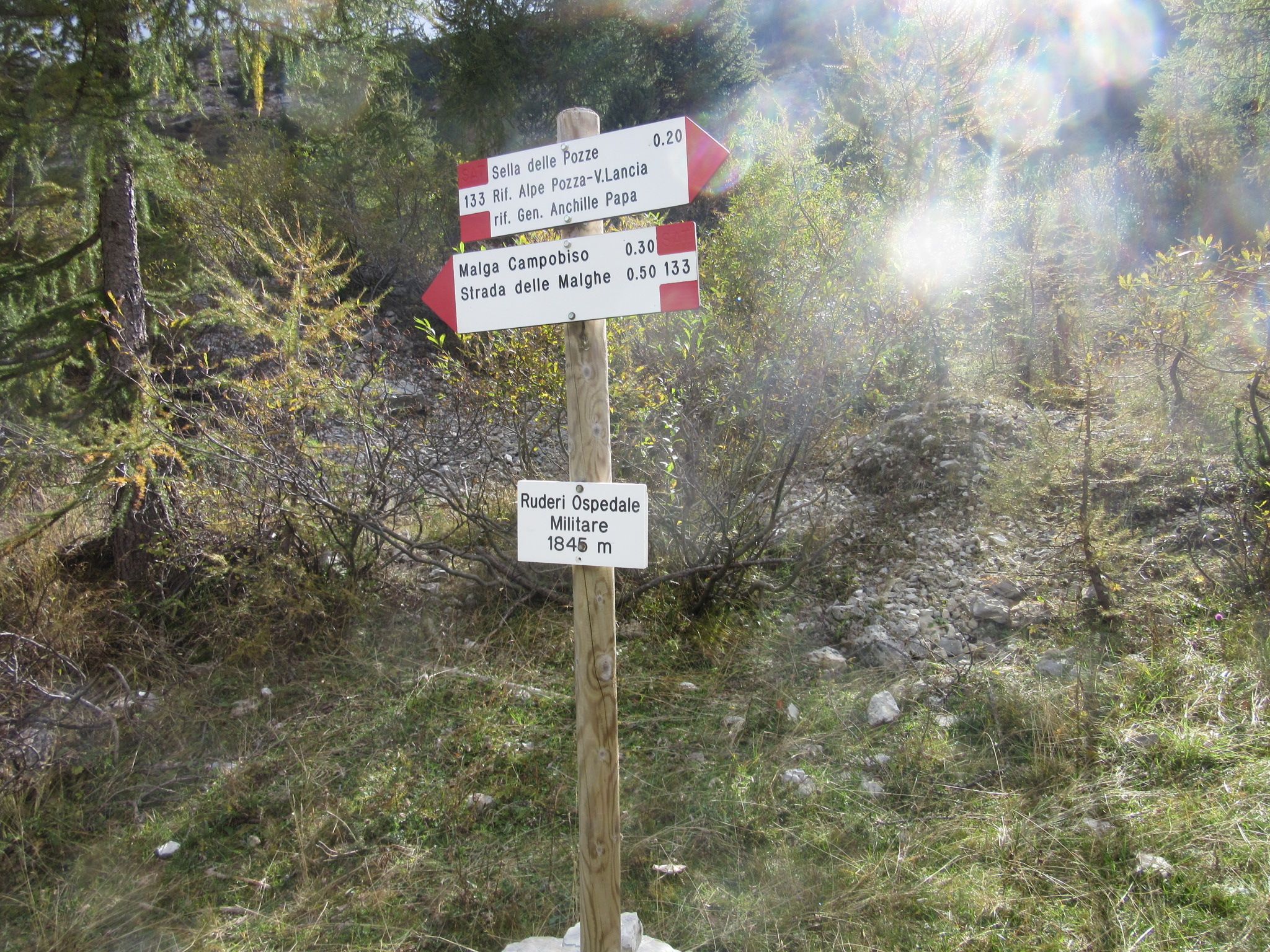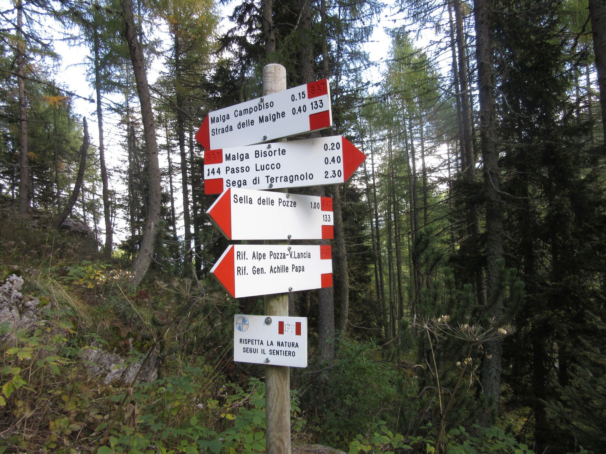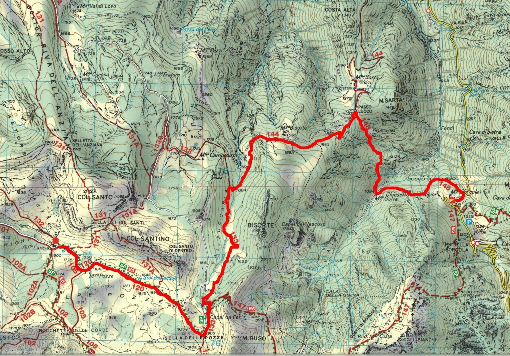 Questo sentiero si prende dal rifugio Lancia , non importa da quale parte voi siete saliti , l’ideale per poterlo apprezzare bene e avere pernottato al rifugio , ma non è detto che chi lo prende da lontano non riesca ad apprezzarne il suo fascino ma pare ovvio che deva misurarsi con la fatica fisica , io sono partito dal Passo della borcola per il 148 e quindi dopo averlo percorso tutto dovevo tenere in considerazione il rientro . Dopo aver lasciato il rifugio proseguite dal 120 verso la sella delle Pozze dopo circa 15-20 minuti di cammino ed aver superato il primo bivio 131 che porta a selletta dei Col Santi si arriva nell’Alpe di Pozze da li parte il 131A che porta prima al Col Santino , la risalita non è complicata molto bello anche il paesaggio e il panorama verso la vetta del Pasubio vista in lontananza , mentre dalla cima, sulla destra si può notare Serrada , il Dos delle Somme , e dove parte la Forra del Lupo ( che vi invito a visitare già documentata in precedenza) il sentiero poi scende fino alla selletta dei Col Santi , per poi se si e stanchi si prende la sinistra e si torna al Lancia mentre se si prende la destra si scende sulle malghe Corona e Malga Costoni , il tratto e molto bello e in mezzo a pascoli e pini , per poi raggiungere una cararreccia che porta a malga Costoni , da qui la strada inizia a salire fino al Col Santo quota 2112 , un po impervia e poco segnalata , ma intuitiva arrivati al Col Santo una visione a 360 ° tutto tondo , come si dice e se il tempo e clemente lo spettacolo sarà unico e incredibile , da li si scende fino alla selletta dei Col Santi , bivio 131-131A per poi rientrare al rifugio Lancia.