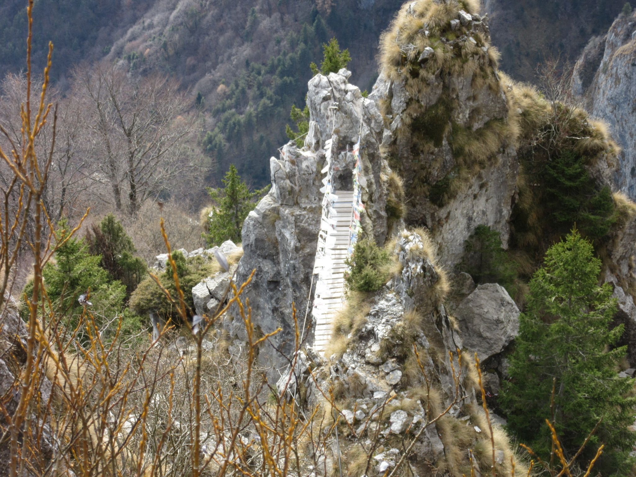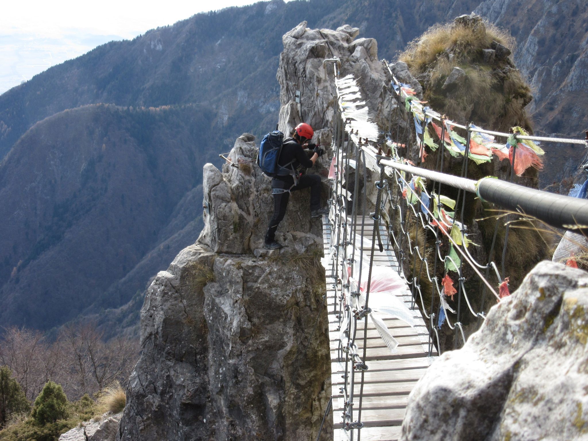 Ripercorsa l’intera ferrata venerdì scorso in totale solitaria, va segnalato che tutta l’attrezzatura è attualmente in perfette condizioni, il ponte tibetano è stato riparato da tempo. Certo i semplici cavi che c’erano al posto della passerella la prima volta che l’ho fatta parecchi anni fa erano più intriganti… ma non è questa la principale attrattiva del percorso.