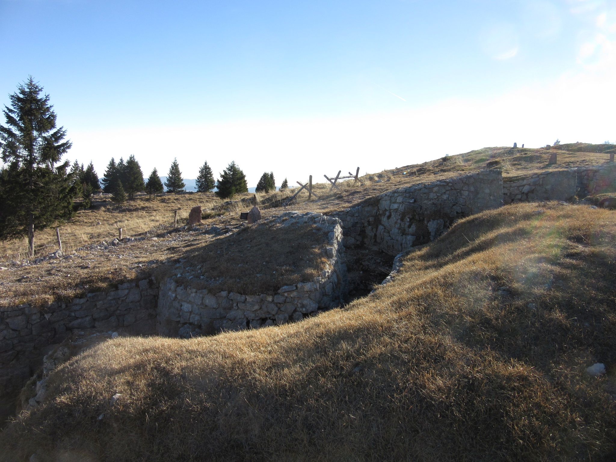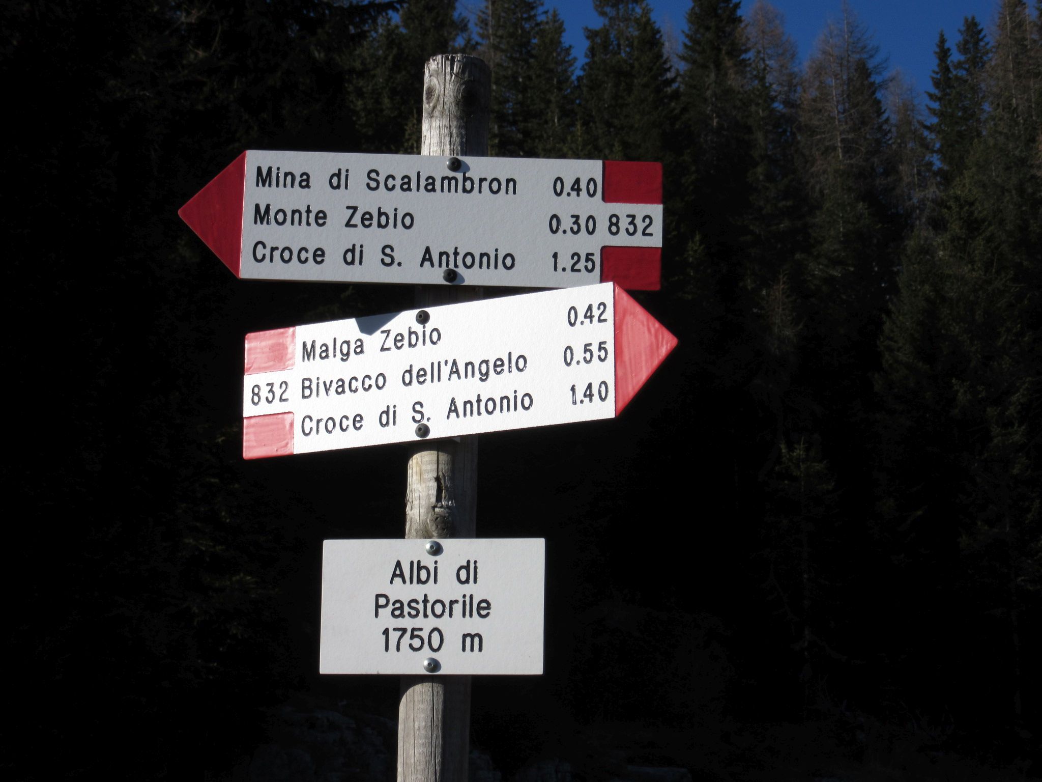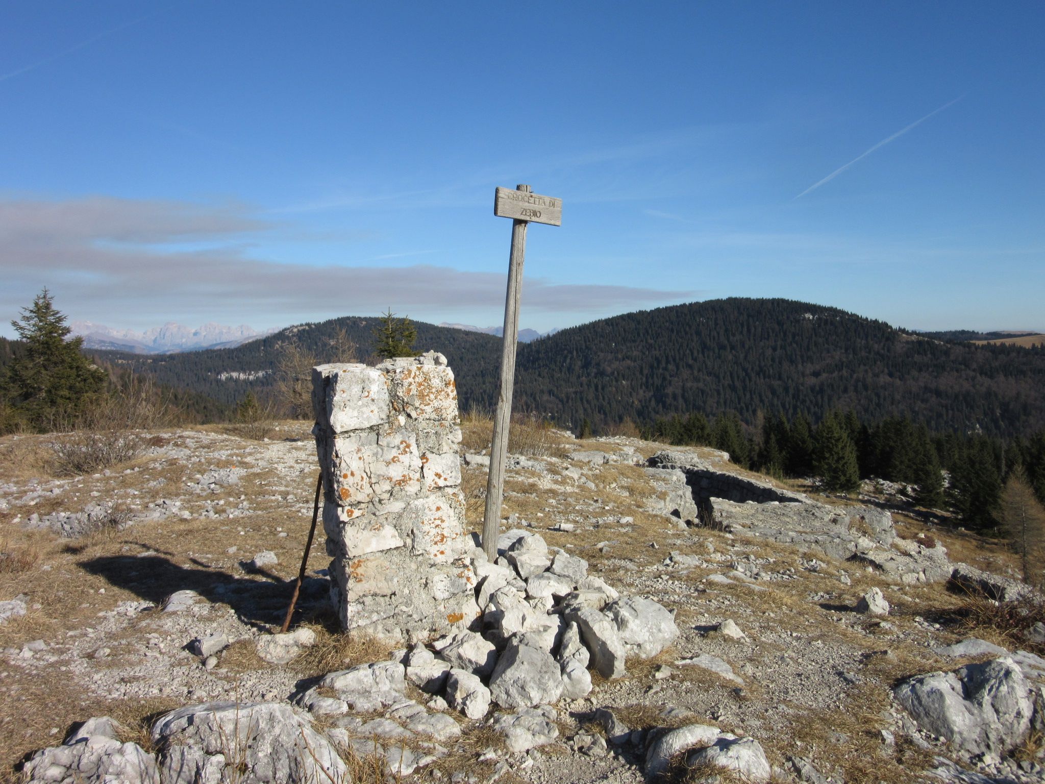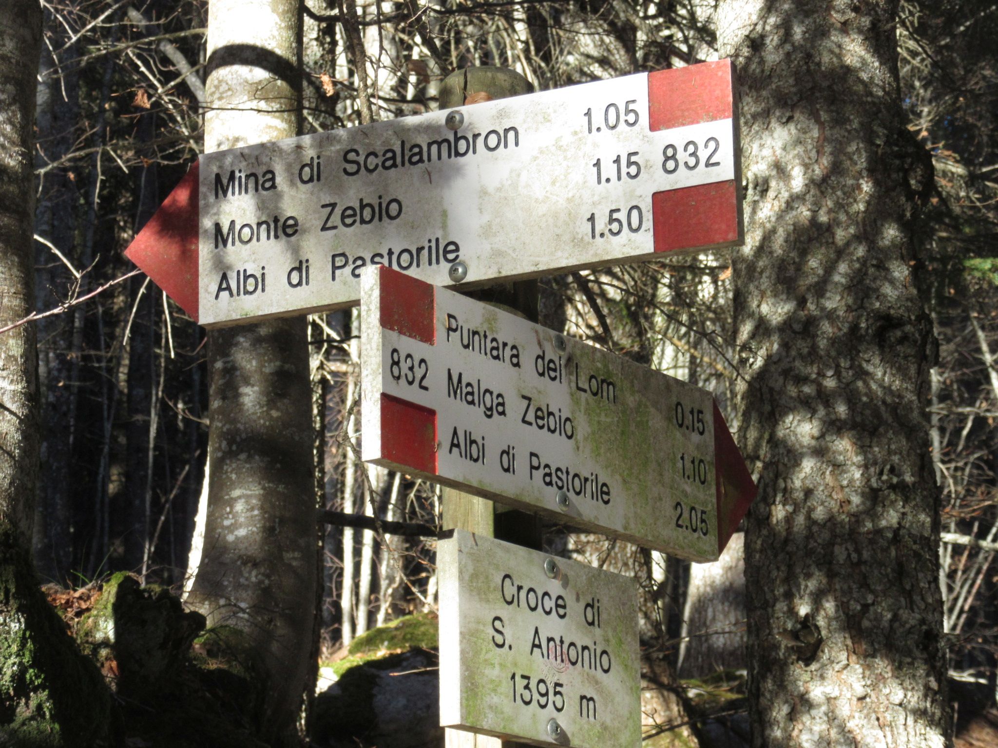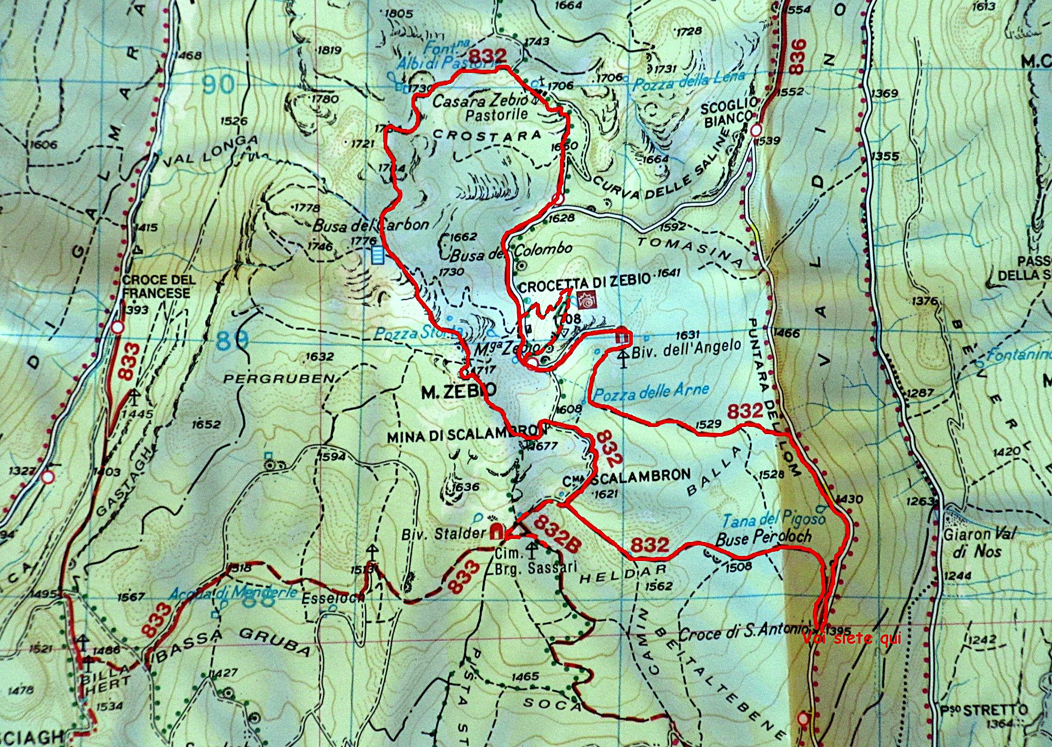 Dopo aver superato Asiago nella zona dell’aereoporto si prosegue fino al bivio Rigoni di Sotto in direzione di Val giardini entrando sulla strada sterrata che porta verso la località Croce di Sant Antonio , da li si trova un posto per mettere l’auto e si sale per il segnavia 832 , essendo il sentiero ad anello si ritorna sullo stesso posto dopo aver completato l’escursione , questo anello molto bello sia per la sua difficoltà ridotta che per i suoi panorami molto belli , propone una visione sotto il profilo storico molto molto importante , sia per il recupero delle trincee del monte Zebio che del Monte Crocetta di Zebio e della Triste vicenda della mina dello Scalabron , ricordo che prima di salire sul Zebio al primo segnavia in quota si può visitare la trincea didattica situata vicino al cimitero della Brigata Sassari e la ricostruzione sul Monte Crocetta di Zebio di tutte le postazioni della 1° linea austriaca compresa una linea di reticolati.
