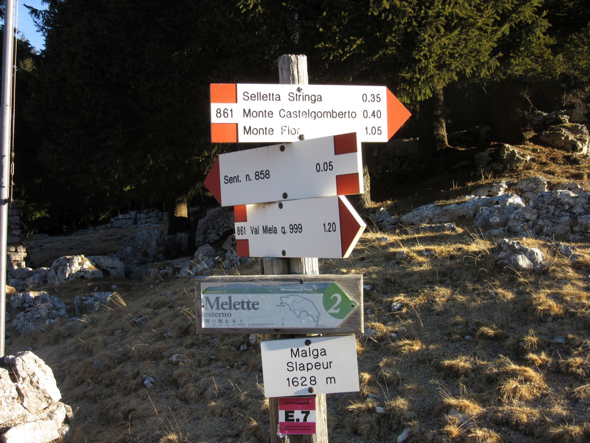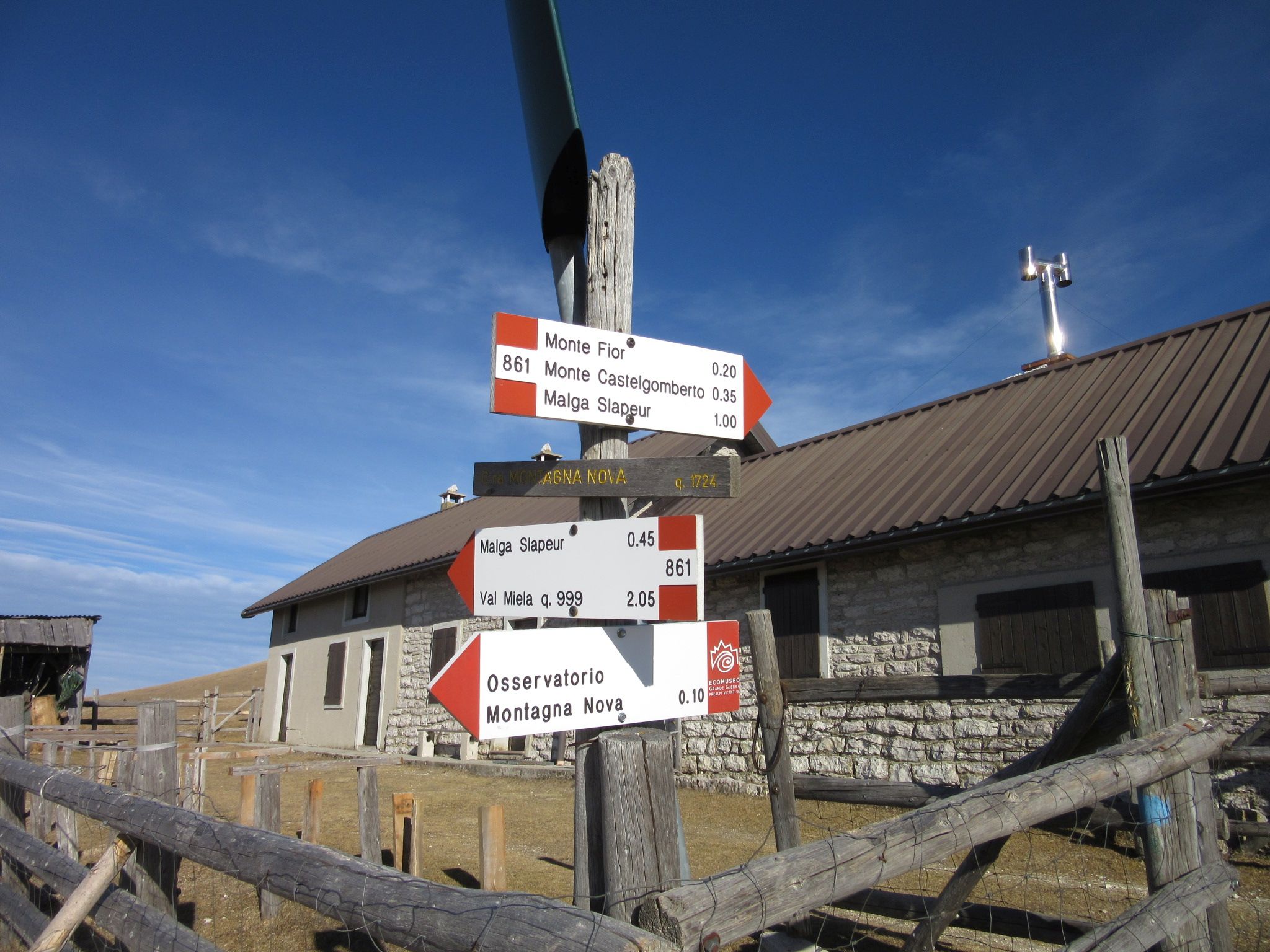 Dopo essere arrivati ad Asiago si prosegue prima verso Gallio e poi verso Foza , arrivati a Località Campanella si supera anche questa località fino ad arrivare in un posteggio sulla sinistra dove si intravede anche il segnavia , il sentiero e molto bello sia quello che sale sulla Val Miela , in buona parte boschivo con discreta pendenza che quello che sale prima sulla selletta Stringa , e dove inizia sia la trincea di Monte Castelgomberto , che consiglio di visitare le trincee in ottime condizioni sopratutto per avere un’idea della drammaticità degli eventi , dove dal cippo del Generale Euclide si può ammirare la Piana di Marcesina e tutti i vari teatri di grandi battaglie Ortigara , Portule , Zebio e tanti altri basta lasciare spaziare l’occhio , poi dopo essere saliti sul monte Fior si scende fino a Malga Nova e si va a visitare l’osservatorio Montagna Nova per poi ridiscendere fino a Malga Slapeur passando per la Citta di Roccia
