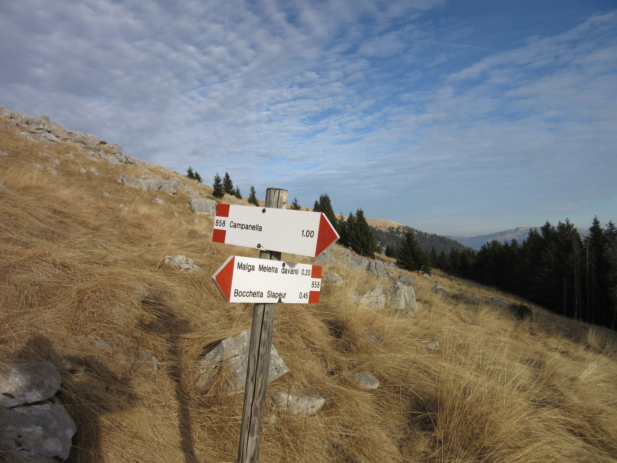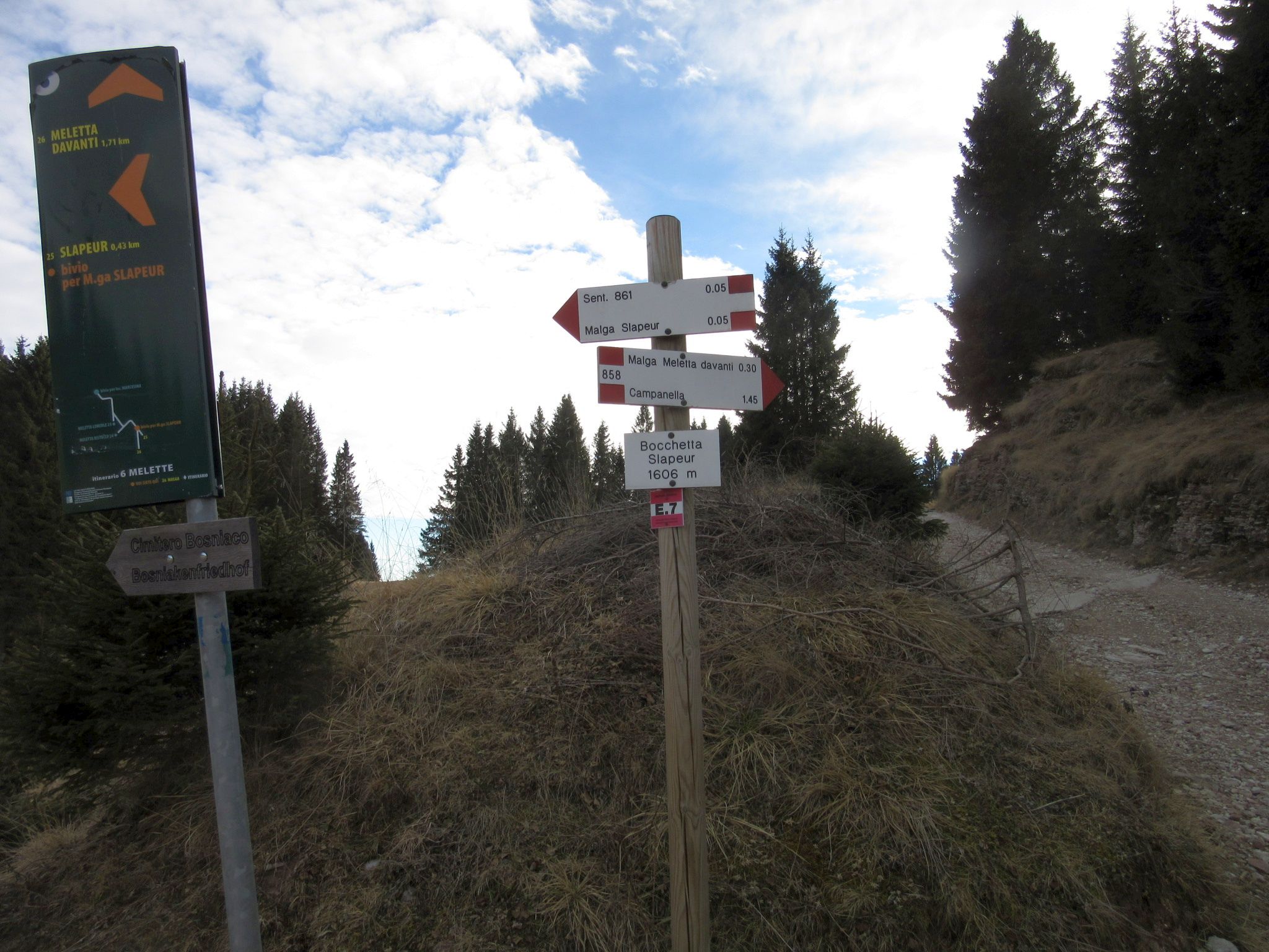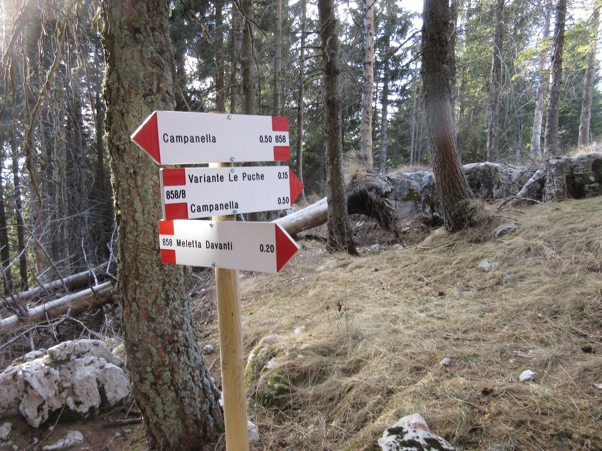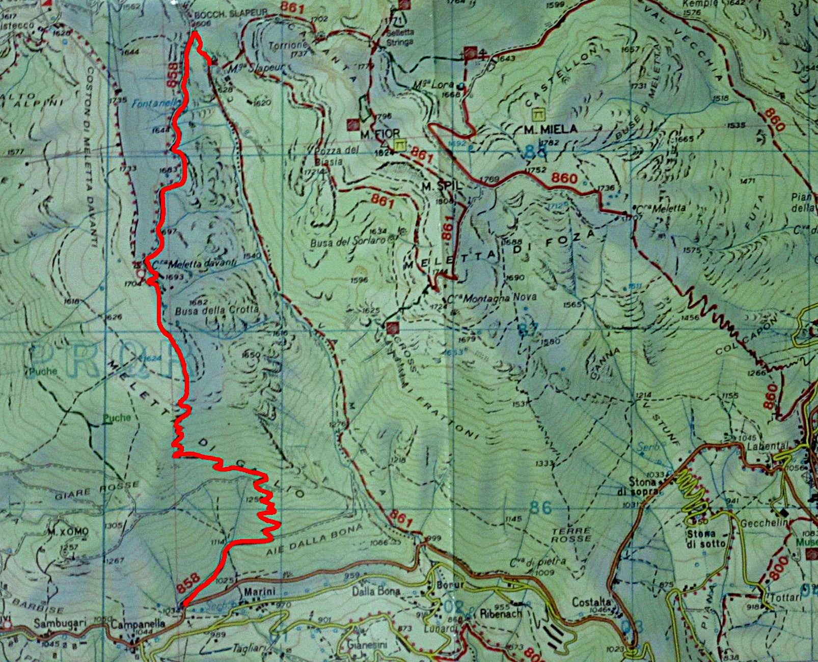 Dopo essere arrivati ad Asiago si prosegue prima verso Gallio e poi verso Foza , arrivati a Località Campanella si nota uno spiazzo sulla sinistra e si intravede il segnavia per il sentiero 858 , questo sentiero a me è piaciuto sopratutto nella parte alta delle Melette di Gallio , attraversa dei pascoli privi di piante passando per Malga Meletta Davanti , molto bella anche la parte boschiva che entra in un bosco tipico di questo luogo , si sale fino alla Bocchetta Slapeur e per poi arrivare alla malga Slapeur , io a dire la verità l’ho usato per scendere dopo essere salito per la Val Miela 861 , giusto per non ridiscendere dallo stesso sentiero , non presenta difficoltà di nessun tipo anche se all’inizio e un po pendente e nella fase del uscita nel prato della malga bisogna guardare bene i segnavia , anche se a quel punto sbagliare e impossibile. Volendo si può anche scendere dalla Val Miela , ma il suggerimento che vorrei darvi è di fare il contrario ed usare 858 per scendere , comunque pressapoco i tempi sono molto simili 1h20 per la 861 Val Miela a scendere e 1h45 per il 858 Campanella , da l’imbocco dei due sentieri ci sono circa 10-15 minuti di cammino su strada asfaltata , anche se poco trafficata .