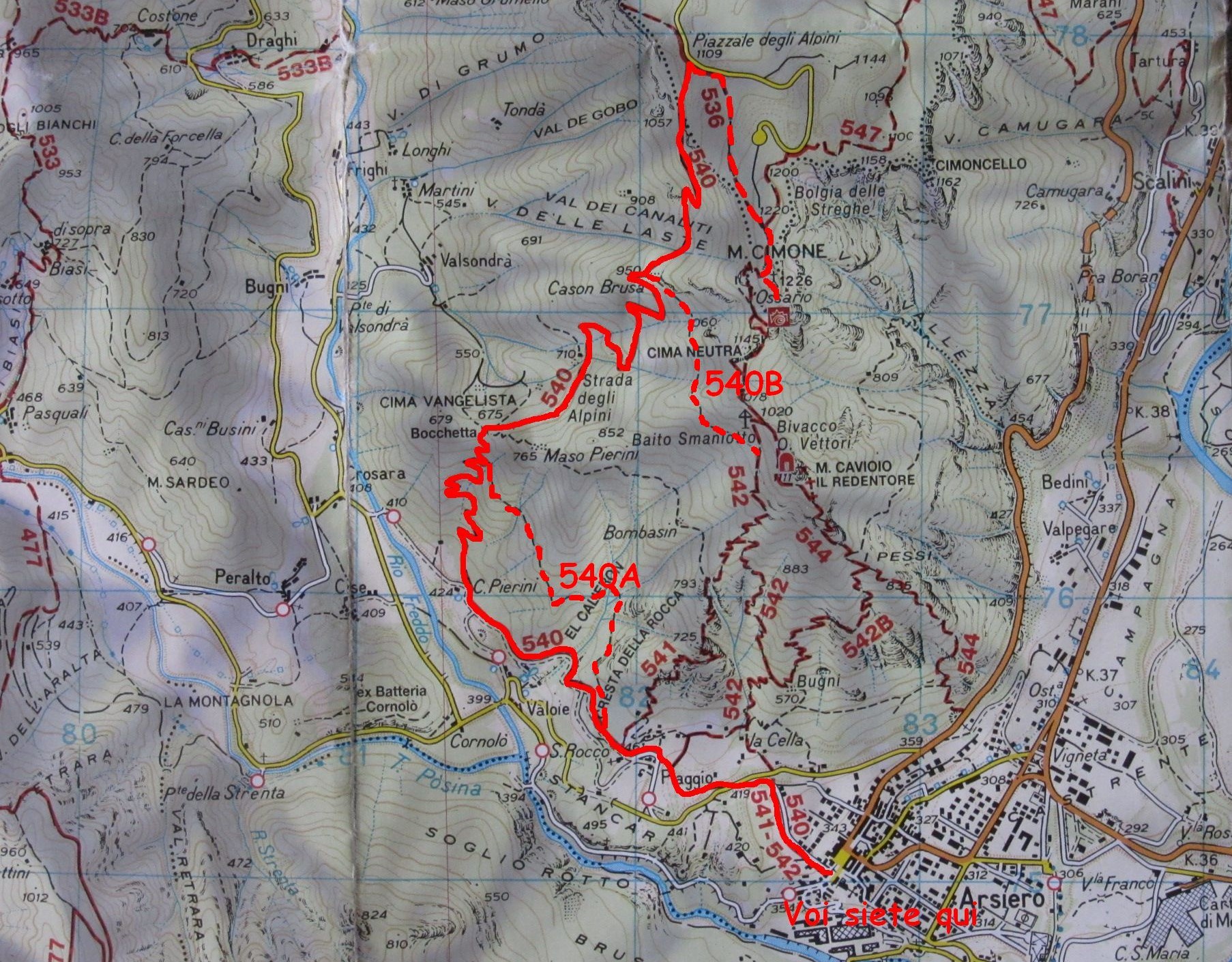 Dopo aver raggiunto l’abitato di Arsiero si posteggia l’auto in centro , a sinistra della piazza si nota una stradina che sale che porta sia alla stazione dei Carabinieri che quella della Forestale , si continua seguendo i segnavia , il sentiero e molto bello e passa per un paio di contrade , e la chiesa di san Rocco , per poi inoltrarsi da Casa Pierini e da li inizia la mulattiera , meglio conosciuta come strada degli alpini , si sale con facilità ed e molto panoramico sulle montagne intorno anche perche salendo sul crinale permette scenari molto belli sulla valle sottostante Rio Freddo si sale in un sottobosco molto interessante e con la possibilità di incontrare camosci ed altri ungulati , fino ad arrivare sul piazzale diegli alpini , il sentiero si ferma qui , ma invito tutti voi a salire prendendo il 536 fino al Monte Cimone , dove si erge un ossario della Grande mina . Esistono anche due sentieri di collegamento che segnalo anche se non ne vedo molto l’utilità il 540A che taglia dalla chiesa di San Rocco al Callieron ( che a quanto sembra qualcuno si sia divertito a togliere il cartello di imbocco ), e il 540B che raccorda il 540 con il 542 all’altezza del monte Cavjoio
