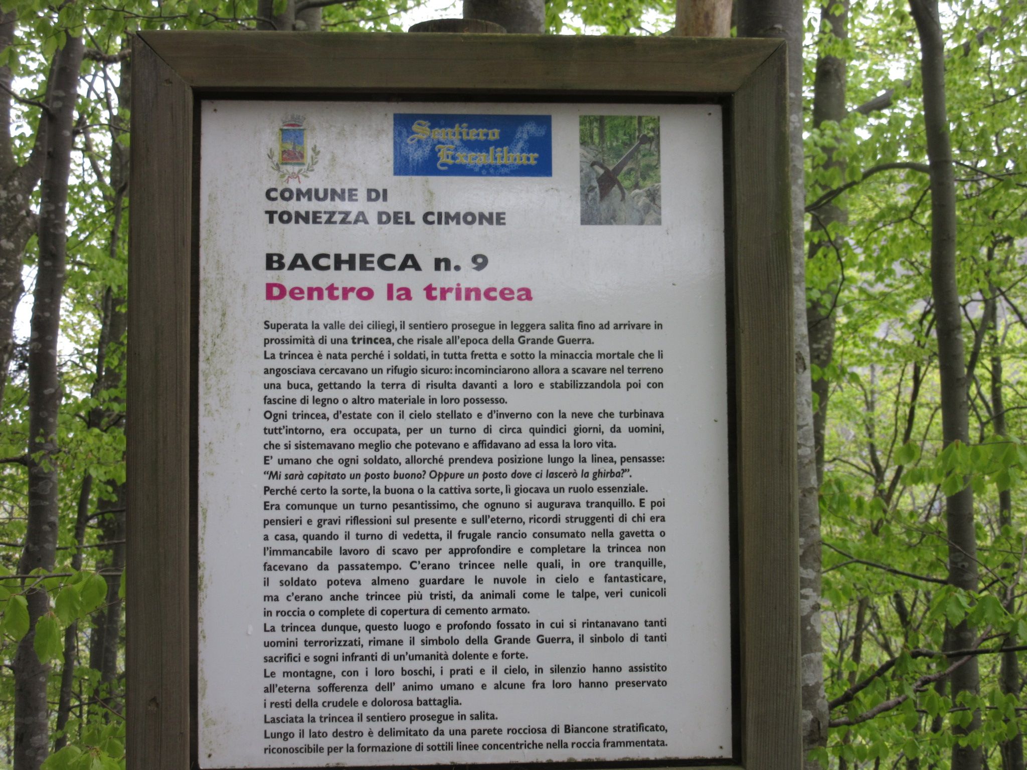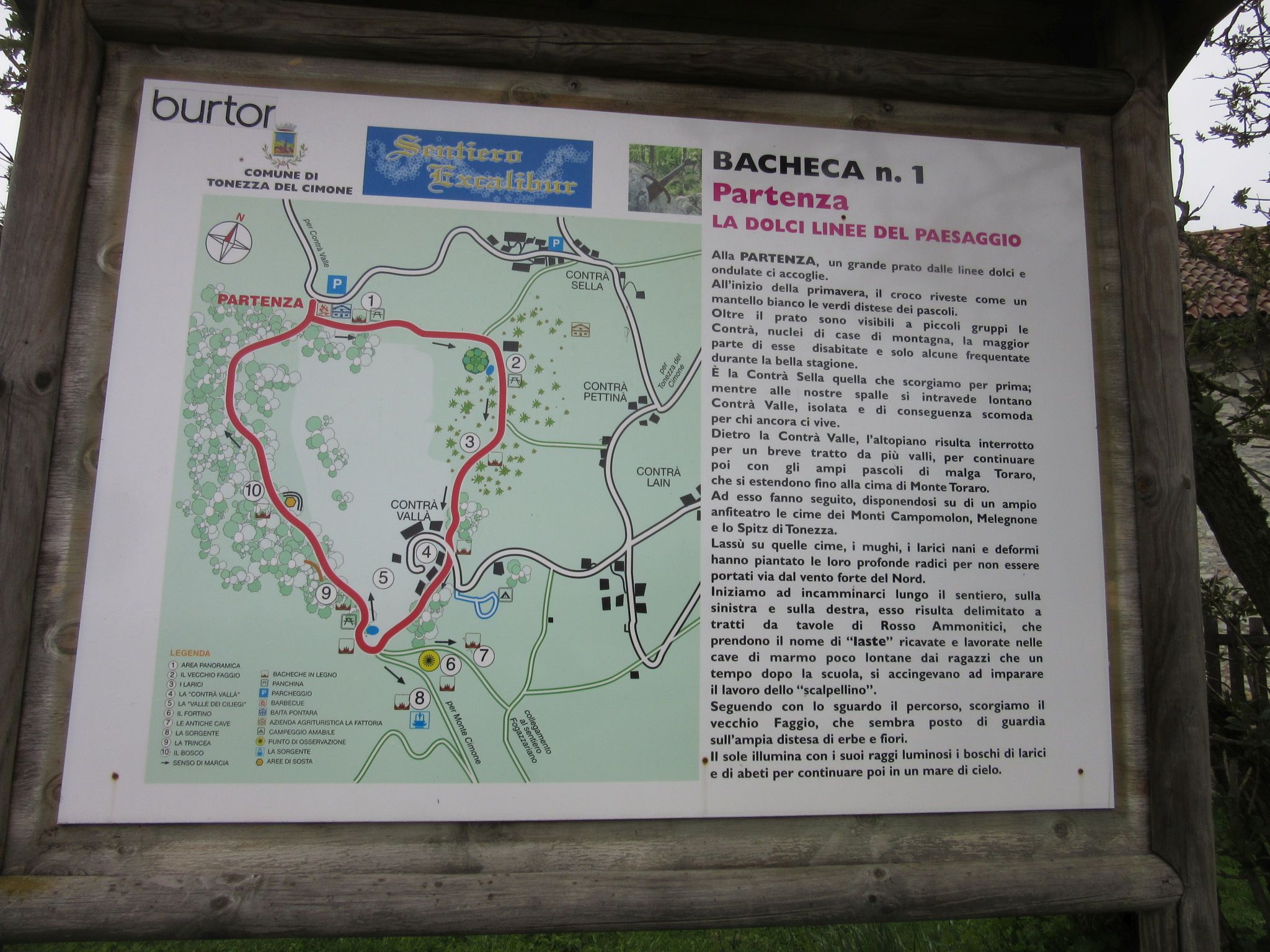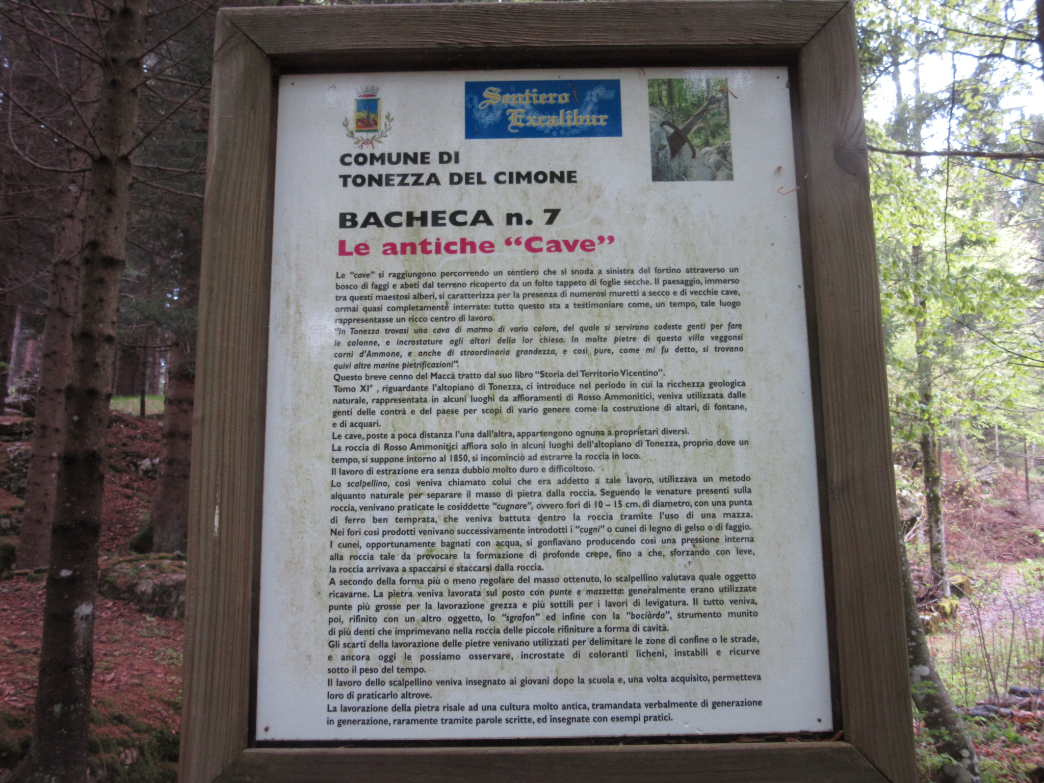 Questo è un sentiero didattico situato sull’altipiano di Tonezza del Cimone , ricordo che questo luogo è stato teatro della grande guerra 1915 – 1918 , molto bello , privo di difficoltà tecniche e fisiche , si presta molto bene ad una semplice camminata all’aperto , ideale anche per famiglie , per poter ammirare questo paese molto piccolo e poco conosciuto se non per la presenza dell’istituto alberghiero di Tonezza molto noto e rinomato , e poi per la presenza del Monte Cimone che fu quasi scoperchiato dalla mina austriaca nel periodo della guerra . Questo territorio ha bisogno di essere valorizzato nella sua semplicità nella sua gente , il sentiero excalibur valorizza questo territorio , con i suoi ampi prati i suoi piccoli sentieri montani collegano le contrade a quel piccolo centro che e Tonezza , non voglio perdere tempo nel descrivere questo luogo , salite , passate , ammirate e lasciatevi coinvolgere dalle emozioni di questo luogo poco distante da casa . Ci sono anche altri sentieri che percorrono questi luoghi , che provvederò a documentare , ma ritengo che le emozioni si possono descrivere , ma viverle e tutta un’altra cosa , le foto possono rendere un’idea , alcuni luoghi non sono stati appositamente fotografati , a voi la scelta .