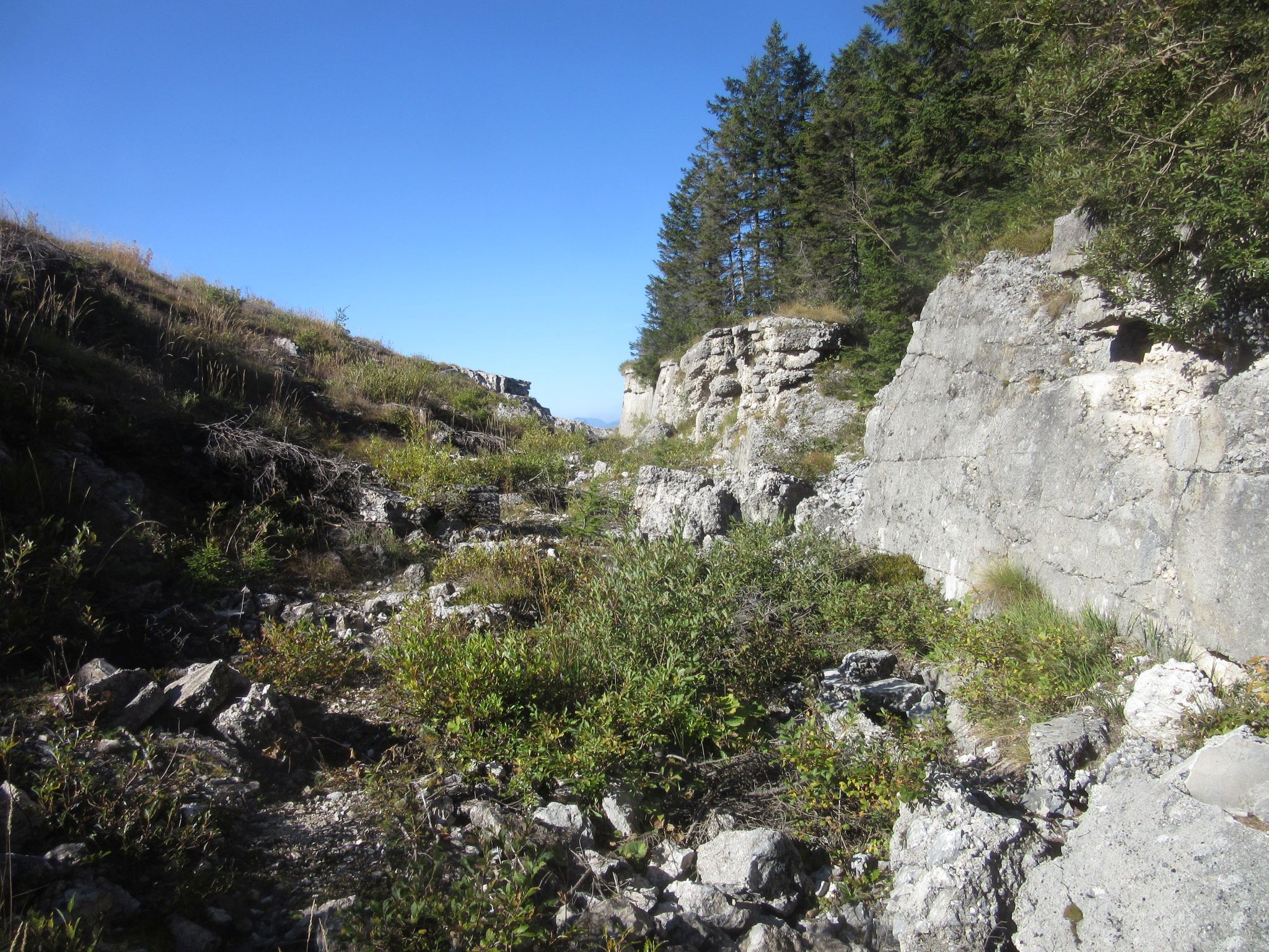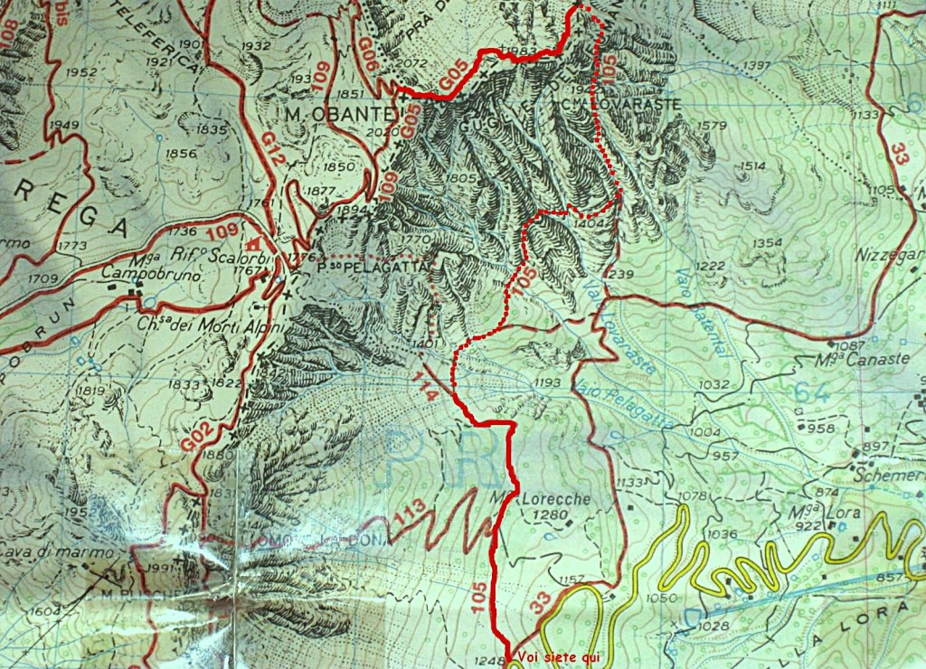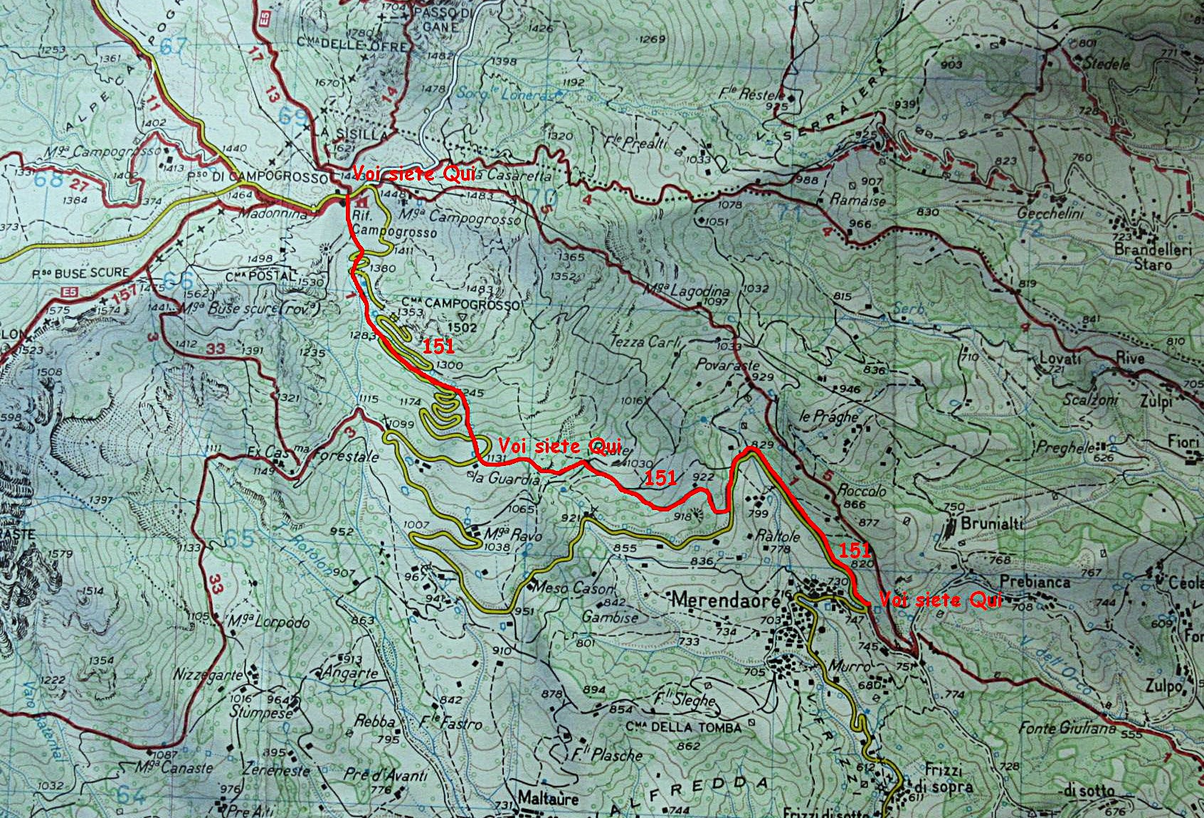Variante facile : per chi non se la sentisse di salire , proseguendo per la selletta dell’Emmele 175 si può scendere fino alla strada del Re , ora attrezzata con un ponte in acciaio per superare la frana e risalire per la restante carrabile fino a Campogrosso. ( rosso tratteggiato) , oppure prendendo quello che scende verso il 170 di malga Boffental (arancione tratteggiato )