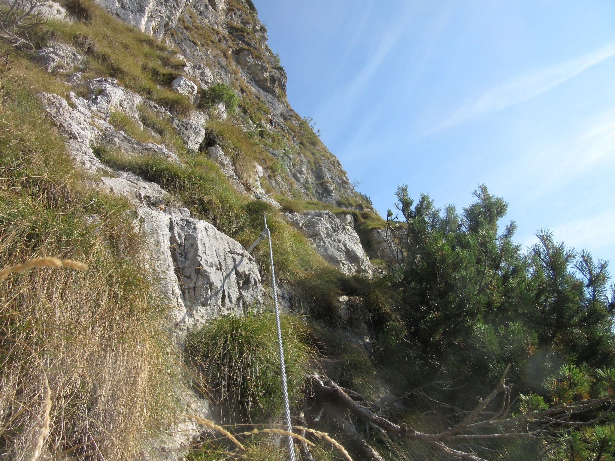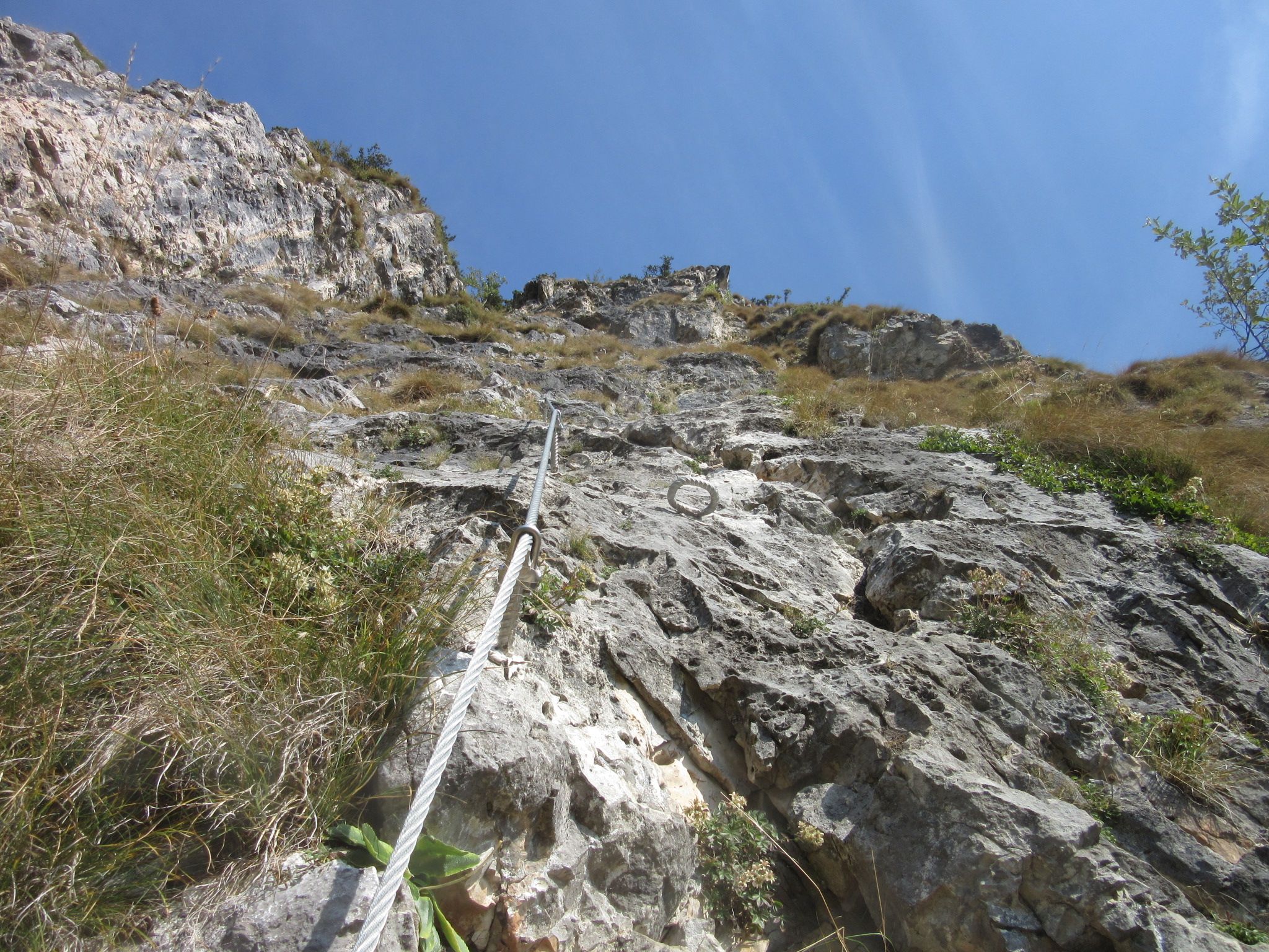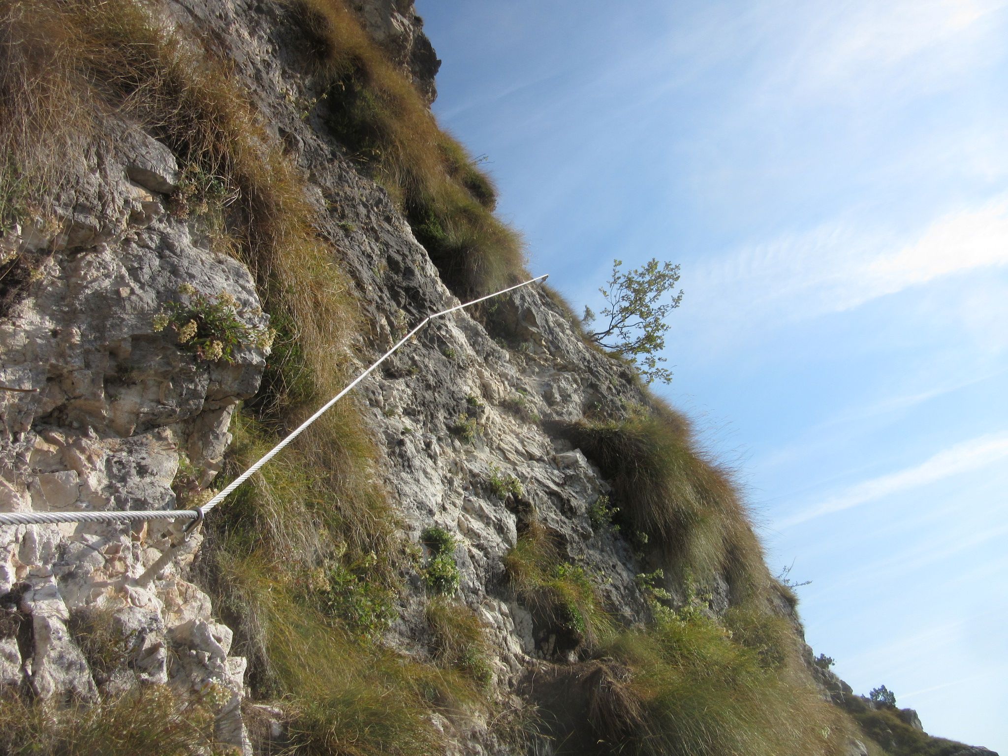 Il sentiero poi prosegue abbastanza regolare , presenta dei passaggi in galleria e passaggi su alcune passerelle prive di pericoli e attrezzate con cavi di acciaio della lunghezza di circa 3-4 metri , visibili nelle foto sotto , fino ad arrivare a Passo degli Onari , questo pezzo chioamato anche sentiero di arroccamento che sale fino ad arrivare in quota al Monte Cornetto e il più bello e fantastico anche sotto il profilo panoramico , sempre tempo permettendo . Giunti sulla Forcella del Cornetto si presenta la ferrata di circa 15 m , non è molto difficile , la roccia presenta appigli molto grandi e non e in verticale .