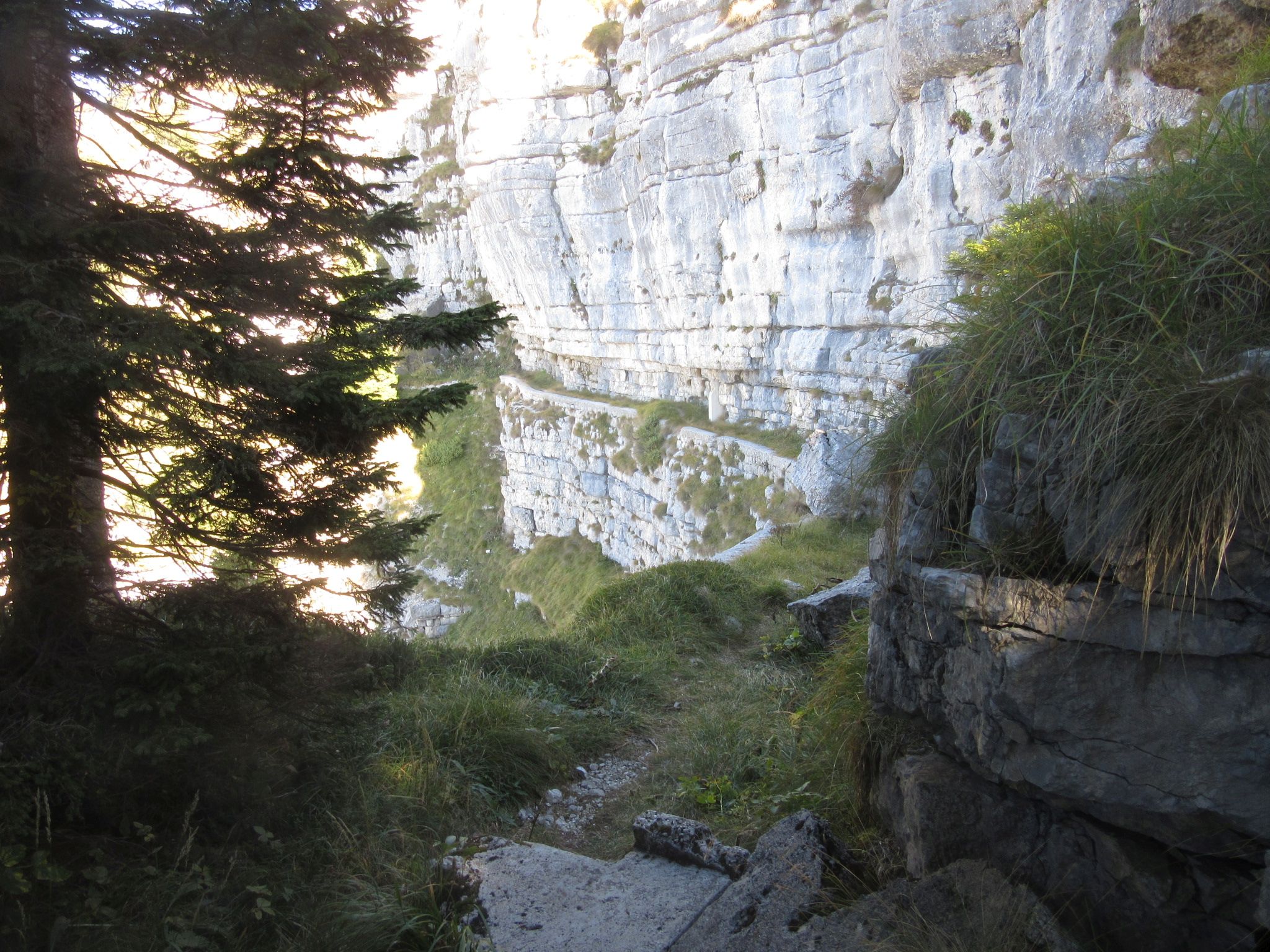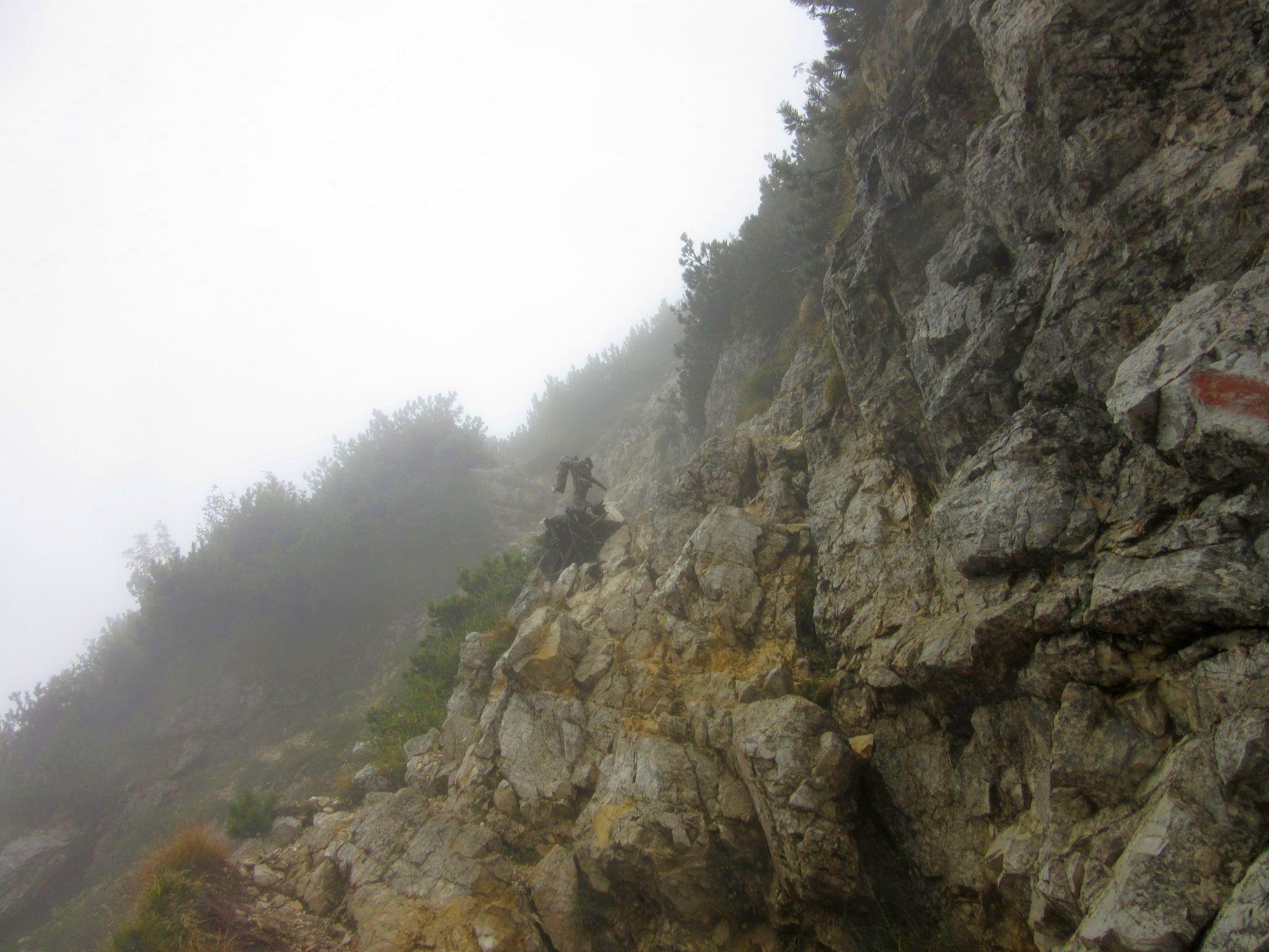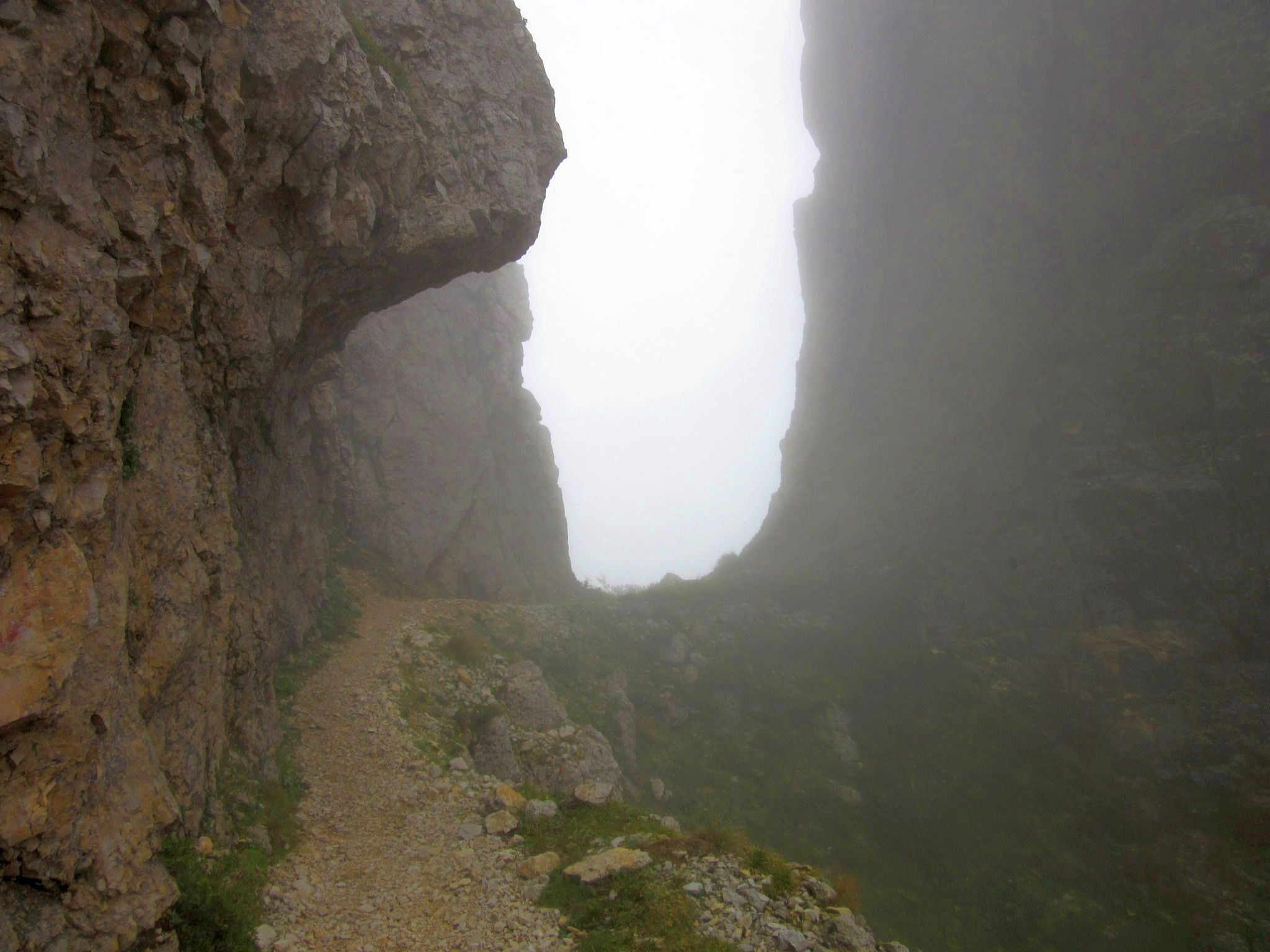 Il sentiero poi prosegue abbastanza regolare , presenta dei passaggi in galleria e passaggi su alcune passerelle prive di pericoli e attrezzate con cavi di acciaio della lunghezza di circa 3-4 metri , visibili nelle foto sotto , fino ad arrivare a Passo degli Onari , questo pezzo chioamato anche sentiero di arroccamento che sale fino ad arrivare in quota al Monte Cornetto e il più bello e fantastico anche sotto il profilo panoramico , sempre tempo permettendo . Giunti sulla Forcella del Cornetto si presenta la ferrata di circa 15 m , non è molto difficile , la roccia presenta appigli molto grandi e non e in verticale .