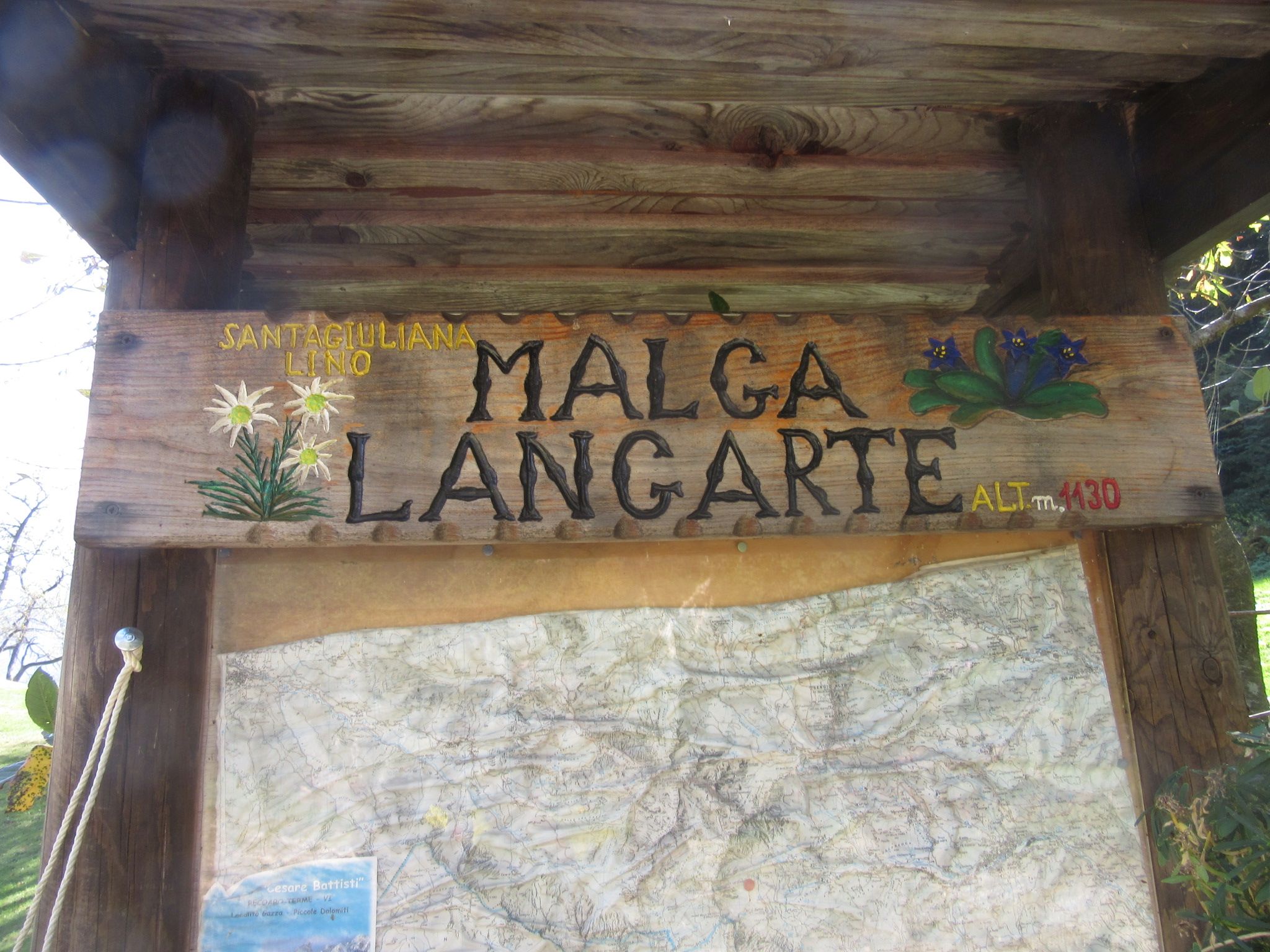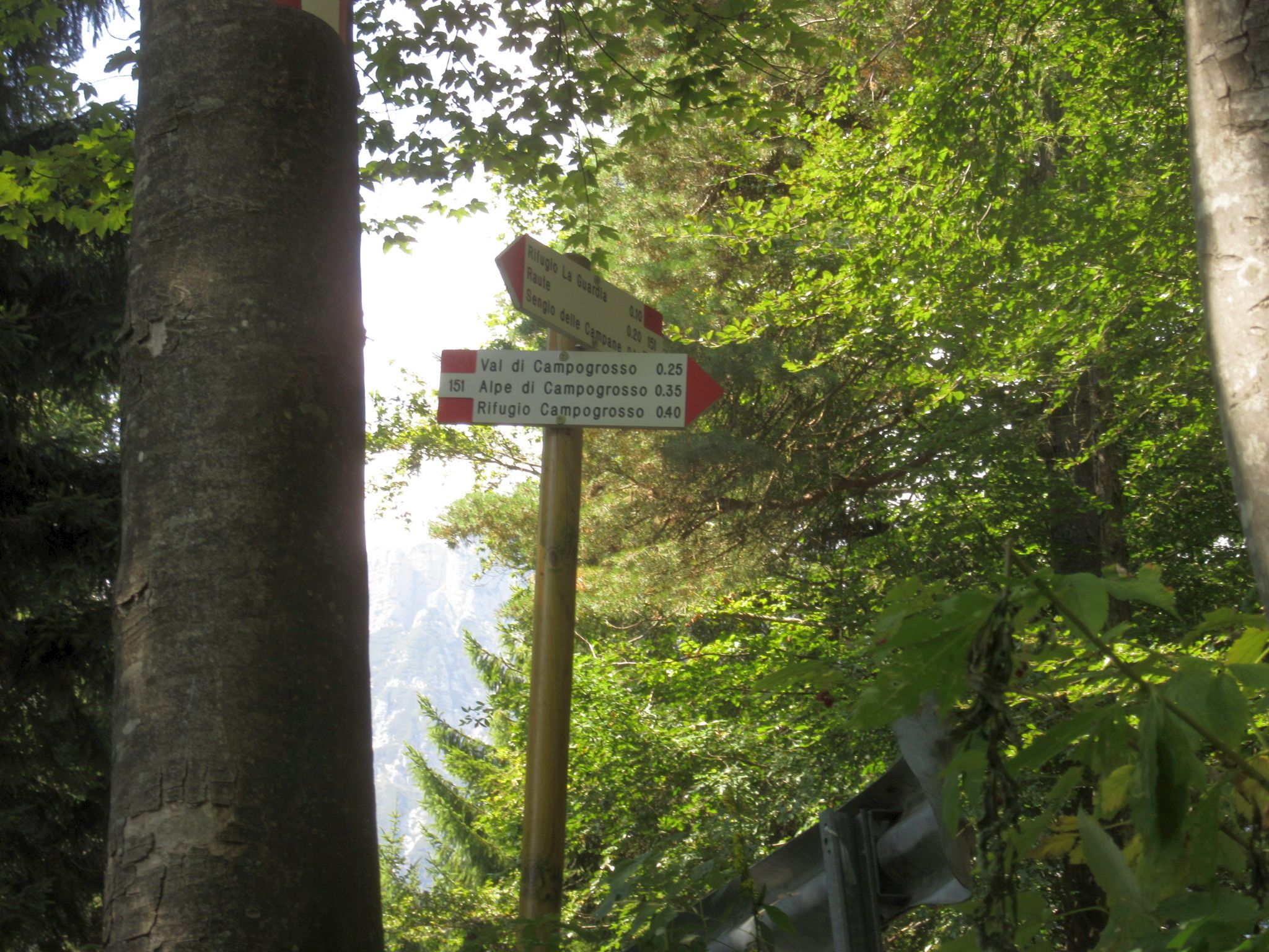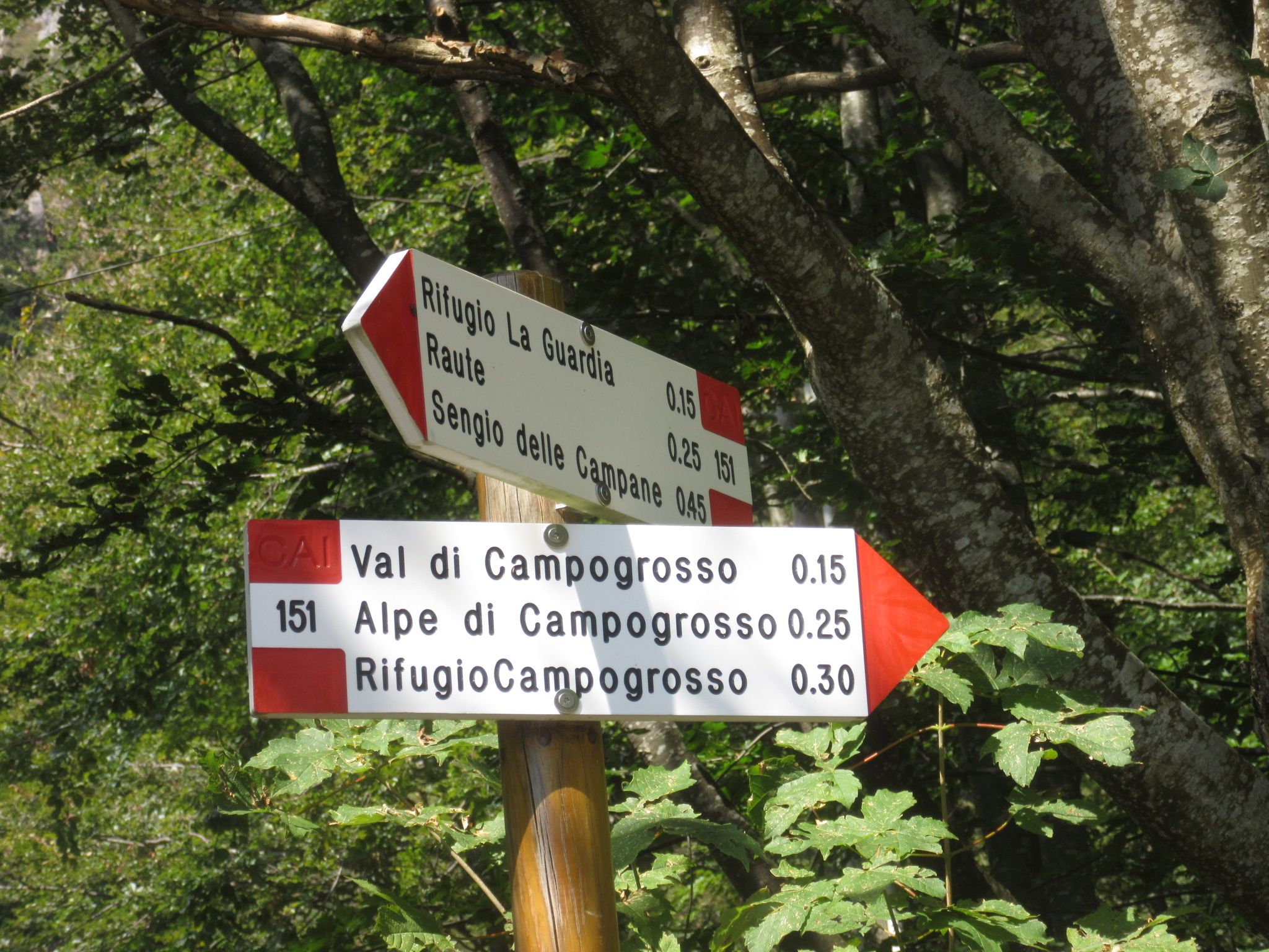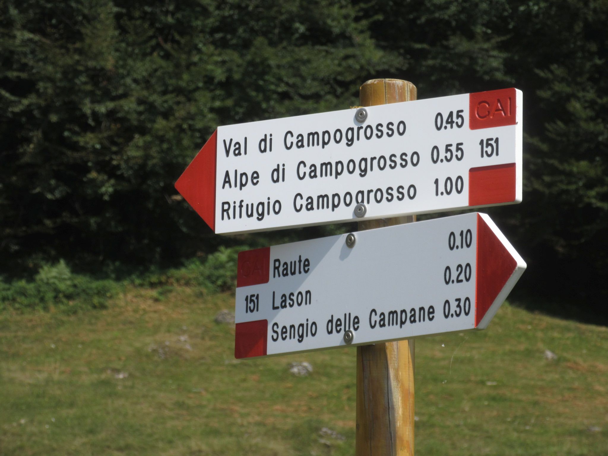 Si imbocca il n.105 superando dapprima il bivio con il n.114 Vajo Pelegatta proseguendo poi per un tratto boschivo si raggiunge un altro raccordo con il n.105 del Vajo Scuro, prendendo la discesa nel tratto boschivo si scende fino al bivio con la Madonna del Sentieri, e si nota anche il sentiero vecchio ed interrotto che scende verso la Malga Langarte 1036 m, purtroppo nn più raggiungibile da qui. Si continua il percorso mantenendo la sinistra, abbassando ancora la quota fino a raggiungere Malga Canaste 1087 m, scendendo in Località Stùmpese 1016 m, poi si transita il Località Angarte 913 m, a pochi minuti dalla prima briglia del torrente Agno, transitando cosi sulla frana del Rotolon. Dopo aver oltrepassato la frana si sale superando alcuni abitati fino a raggiungere la strada che porta al Rifugio alla Guardia e poi Rifugio Campogrosso , poco al di sotto di Malga Ravo 1038 m, si sale un po’ per la strada asfaltata fino al tornante, e si prende il sentiero che permette di raggiungere il Bivio Rao 1099 m, vicino al Capitello della Guardia, da li imboccando il n.144 sentiero delle Mole, si sale fino al Passo del Lupo dove mantenendo la destra si raggiungerà il Rifugio Giuriolo Campogrosso 1481 m, in eventuale si potrebbe anche proseguire fino al Passo Base Scure 1475 m, prendendo a destra e percorrere una piccola parte del n.157 sentiero del Boale dei Fondi, raggiungendo sempre il Rifugio Campogrosso 1464 m.