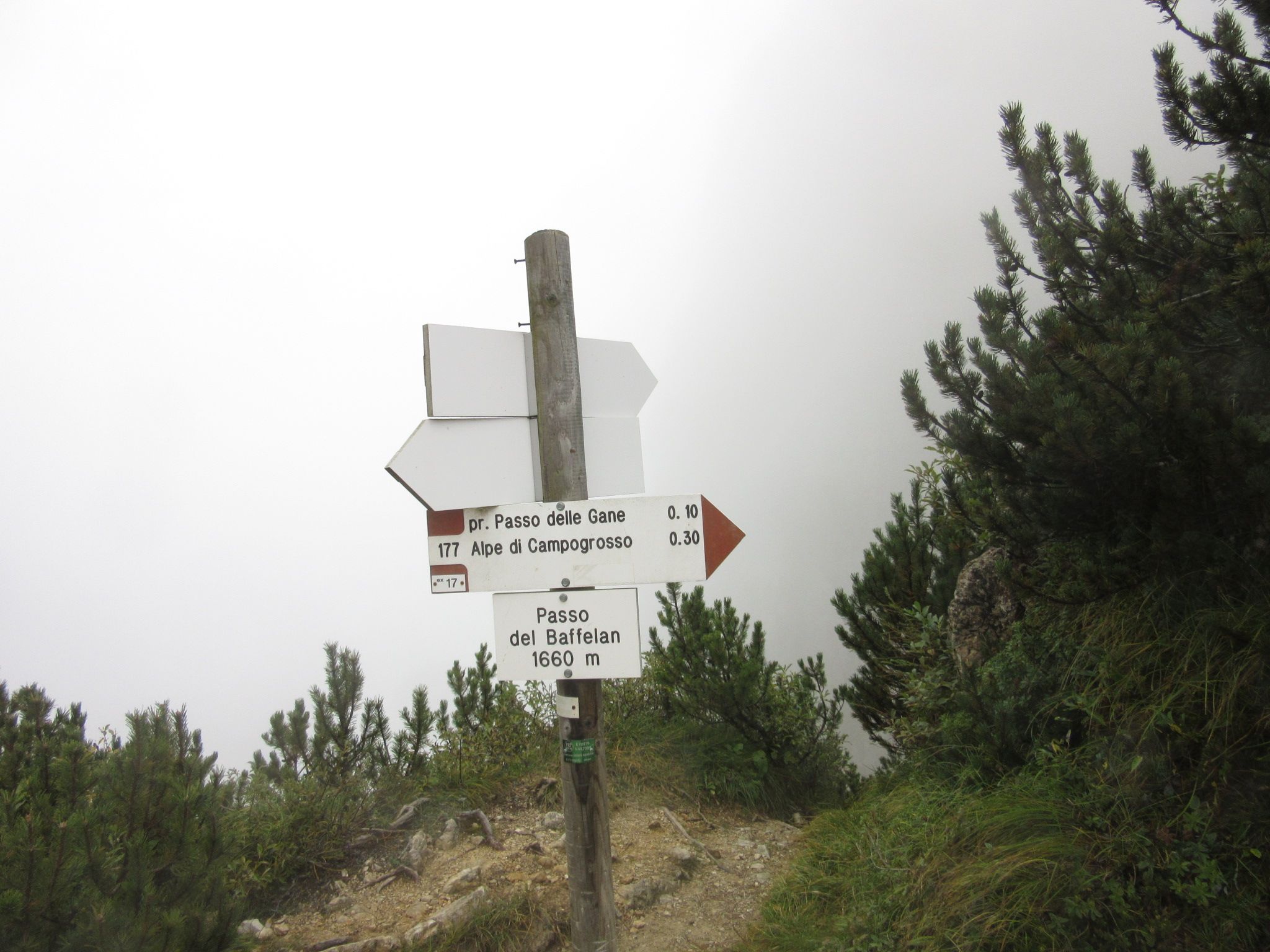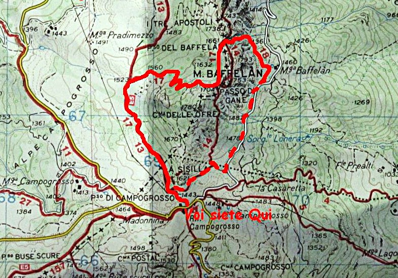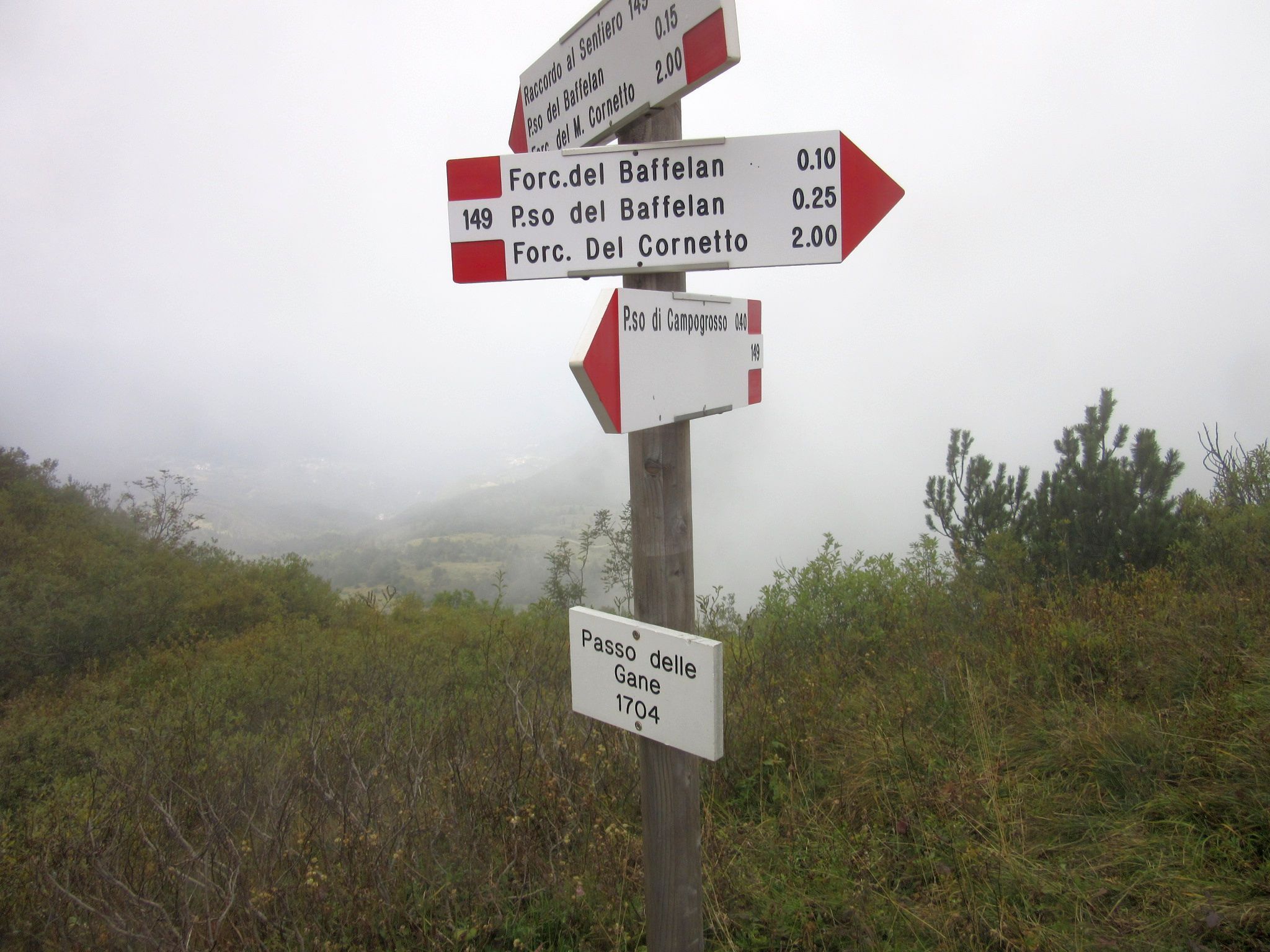 Si prende la strada statale che porta a Recoaro Terme e si prosegue verso la località Merendaore , per poi salire la carrabile fino a Campogrosso dove vicino al rifugio Giuriolo ci sono ampi posteggi per l’auto . Da li proprio davanti al rifugio , sotto la parete della Madonna della Sisilla ( vedi Post) parte il sentiero all’inizio molto pianeggiante , e man mano che ci si inoltra inizia prima a salire abbastanza semplice e privo di difficoltà tecniche ma su un terreno abbastanza ripido , ma che presenta dei panorami notevoli sulla conca di Campogrosso , per poi inerpicarsi nelle creste molto frastagliate mutando continuamente la direzione con continui saliscendi fino al Passo delle Gane , si sale fino alla Forcella del Baffelan , un tratto in discesa su canalone fino ad arrivare al Passo del Baffelan , non e molto pericoloso ma non affrontabile da tutti .