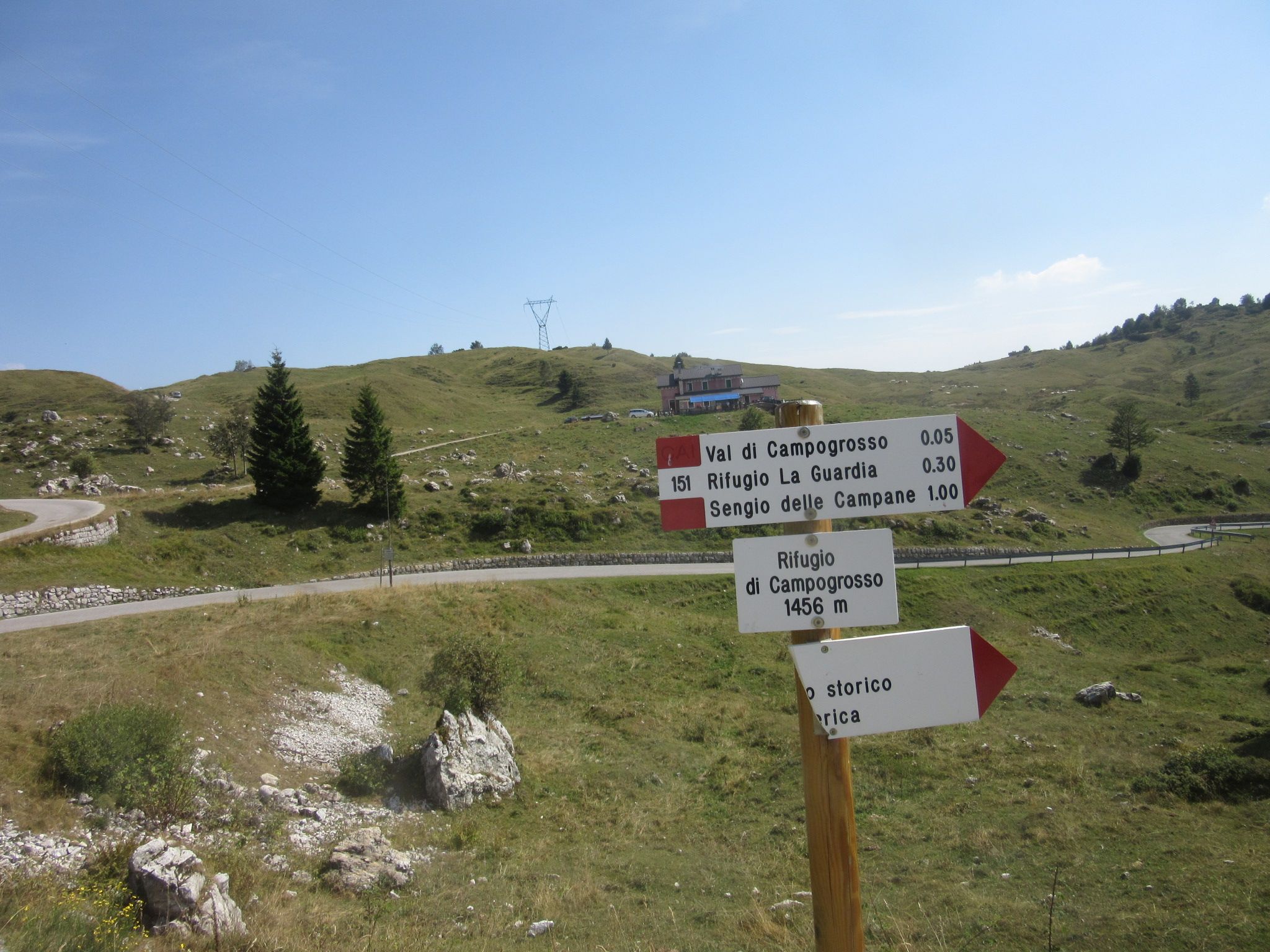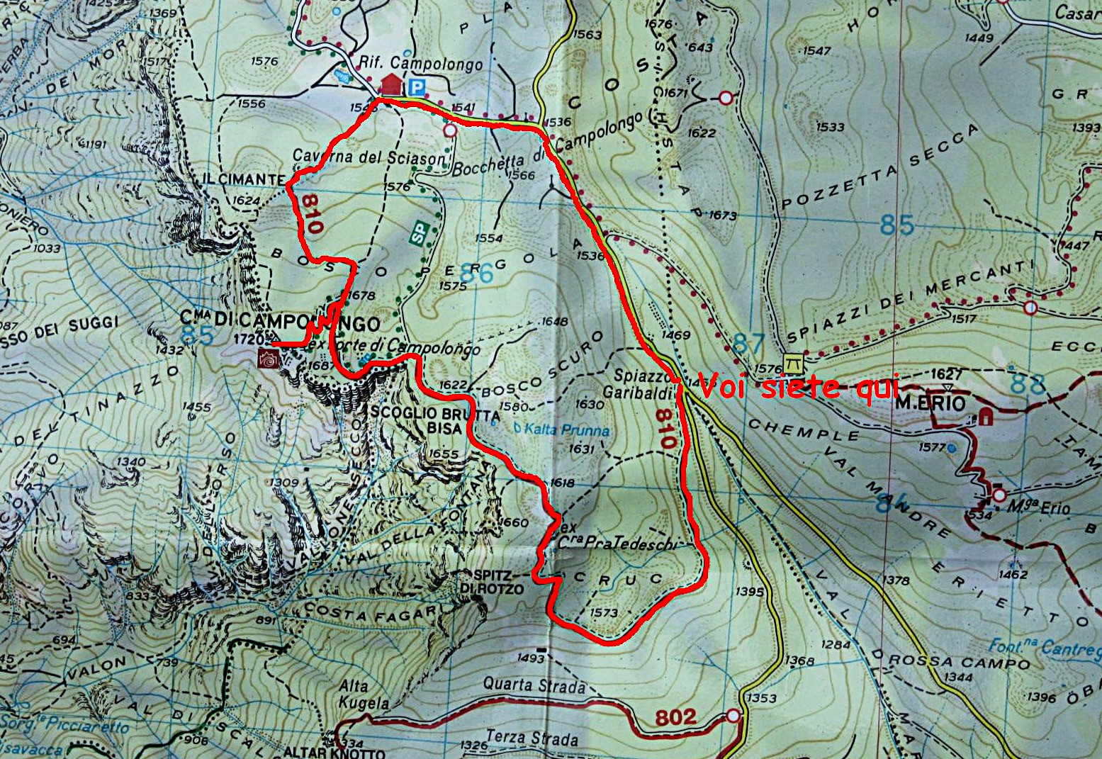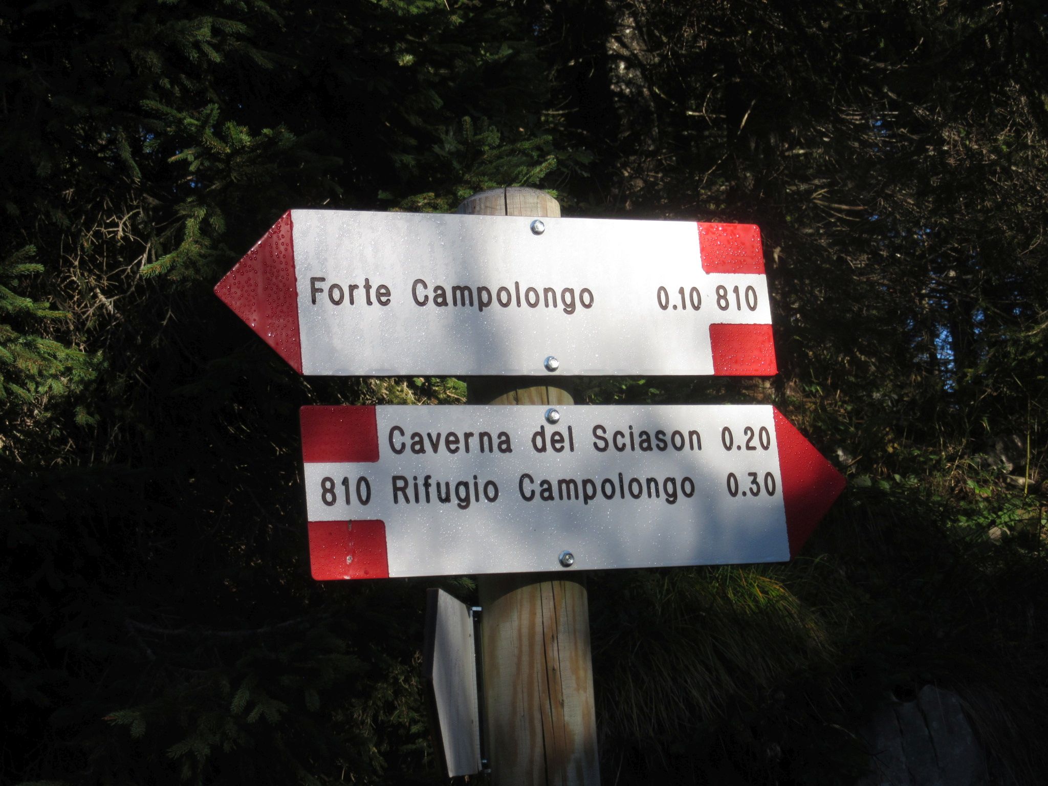 Ci sono due vie per salire questo sentiero ed al Forte Campolongo , si può salire da Cogollo del Cengio passando per Tresche conca e proseguire fino ad Albaredo per poi imboccare la Val Martello , ovvero la via che porta a l’istituto Elioterapico di Mezzaselva . Oppure salire da Pedescala passando per Castelletto e superato l’abitato di Rotzo salire per la Val Martello , ovvero la via che porta a l’istituto Elioterapico di Mezzaselva .Superato il bivio con l’istituto , si prosegue fino ad arrivare in Spiazzo Garibaldi dove inizia il sentiero 810 . Io sono partito dallo spiazzo Garibaldi e credo sia la cosa più bella da fare (ma si può anche salire e scendere dal Rifugio Campolongo se si vuole fare meno fatica in circa 1h20 ), si sale in un sottobosco unico nel suo genere con una flora e una fauna che vi farà compagnia per tutto il viaggio , la salita e praticabile a tutti ed arrivati sul crinale la visione appaga qualsiasi sforzo , sempre tempo permettendo ci si può fermare ed ammirare il panorama che varia dalla spaziosità della Val D’astico , allo Spitz di Tonezza , al Cimone , il Forte Campomolon per poi ammirare sullo sfondo il Pasubio e le Piccole dolomiti , si continua a salire su questo sentiero diventato ormai carrareccia fino ad arrivare sul Forte Campolongo , DA VISITARE perdendo il tempo che ci vuole visto la maestosita dell’opera , e quella del suo recupero , ammirando ancora di piu il suo omonimo Forte Verena . Poi la discesa verso il rifugio Campolongo anch’essa molto bella in un sottobosco incantato per passare nella Caverna del Sieson , una voragine carsica profonda 96 metri , per poi continuare in un percorso pianeggiante fino al pascolo prativo del Rifugio Campolongo , poi scendendo a fianco della strada si raggiunge lo Spiazzo Garibaldi