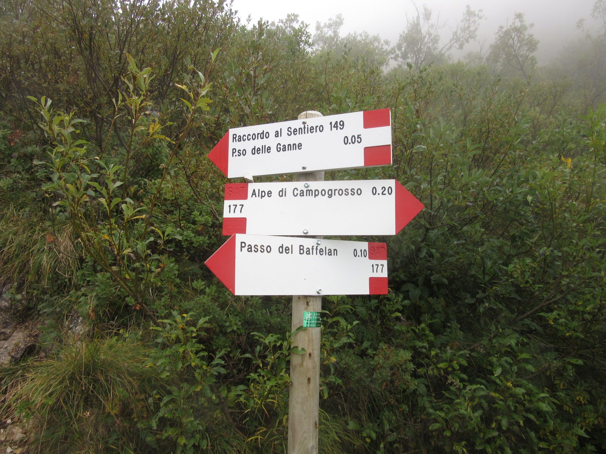 Si prende la strada statale che porta a Recoaro Terme e si prosegue verso la località Merendaore , per poi salire la carrabile fino a Campogrosso dove vicino al rifugio Giuriolo ci sono ampi posteggi per l’auto . Si prende la strada del Re che porta a Pian delle Fugazze per qualche km fino ad incontrare un tratto prativo che taglia i tornanti della strada , il sentiero parte piano passando sotto le pareti usate dai climber , ed inizia a salire con difficolta notevoli sopratutto per il passaggio su un pezzo attrezzato , per poi continuare nel boale omonimo del Baffelan , fino ad arrivare al Passo , da li si prosegue in discesa verso la via del ritorno sempre dal 177 , fino ad arrivare ad un bivio con il 170 che sale da malga Boffental ed arrivare poi a Campogrosso . Il percorso e bello ma non si deve sottovalutare la sua lunghezza , nel senso che è corto ma abbastanza ripido e impegnativo per quanto riguarda il primo tratto , mentre nel secondo tratto e rilassante con il panorama sui pascoli di malga Boffental e sulla valle opposta il Fumante , Cima Mosca , Il carega e i suoi Vaj.