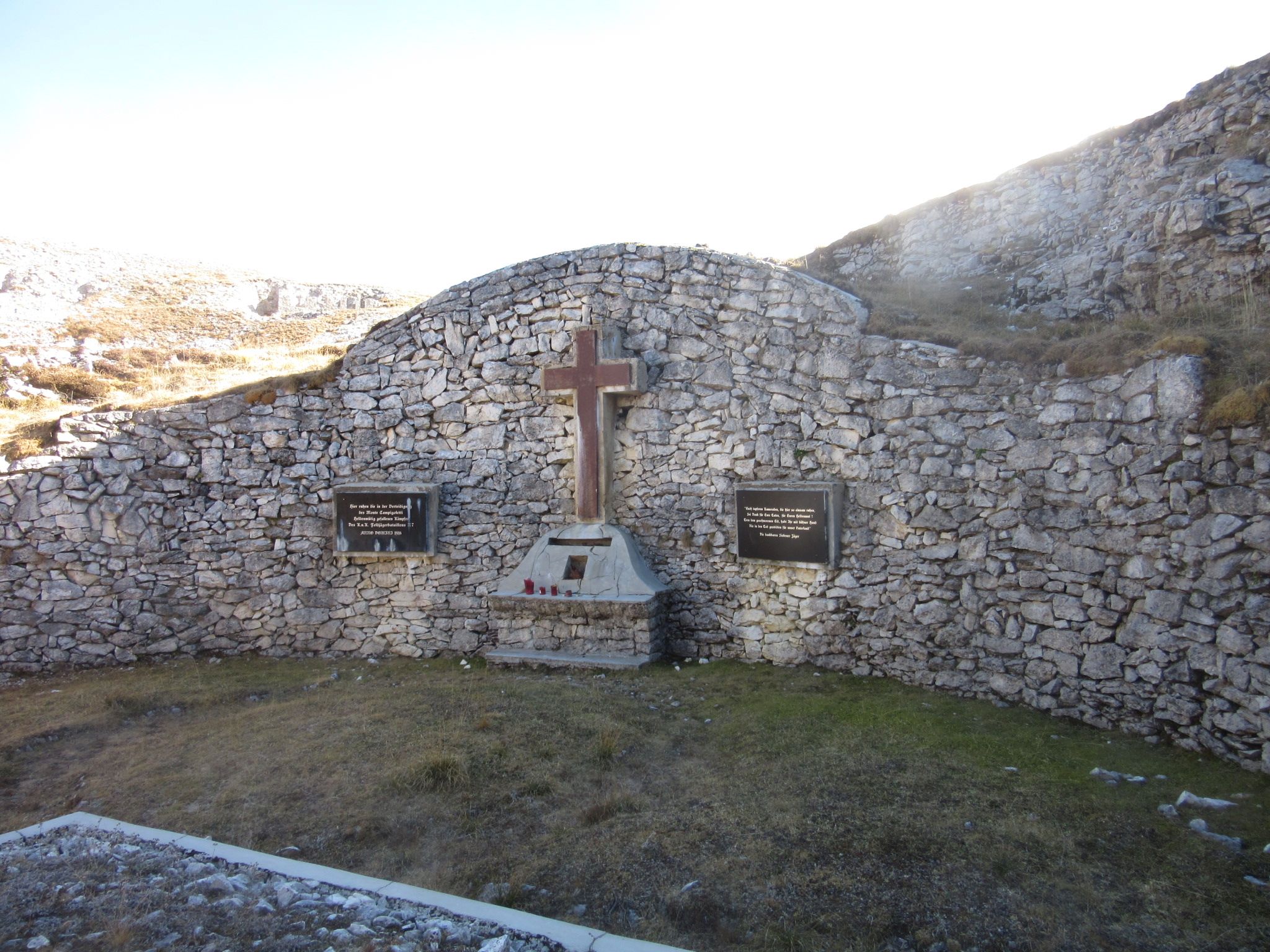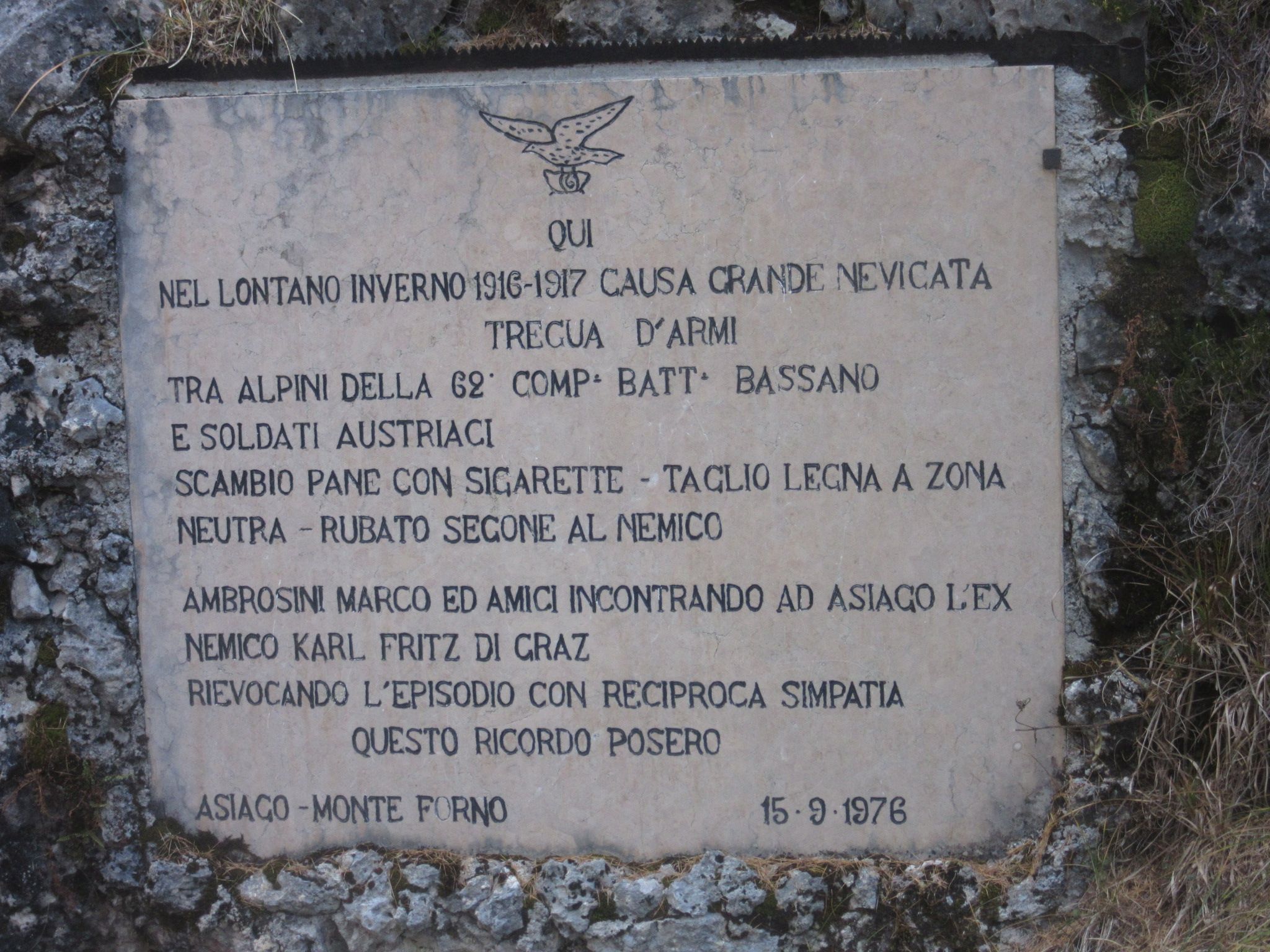 Una curiosità : Un episodio rinvenuto nell’inverno 1916-1917 durante una grande nevicata tra alpini della 62° compagnia btg Bassano soldato Marco Ambrosini e austriaco Karl Fritz di Graz, già del 27° reggimento “Re del Belgio” , si scambiarono pane , sigarette nella zona neutra durante una tregua d’armi , Ambrosini rubò il segone per la legna al nemico . I due si incontrarono ad Asiago e rievocarono l’episodio diversi anni dopo. Posando una targa con il segone cementato e visibile nella parte alta della lapide .