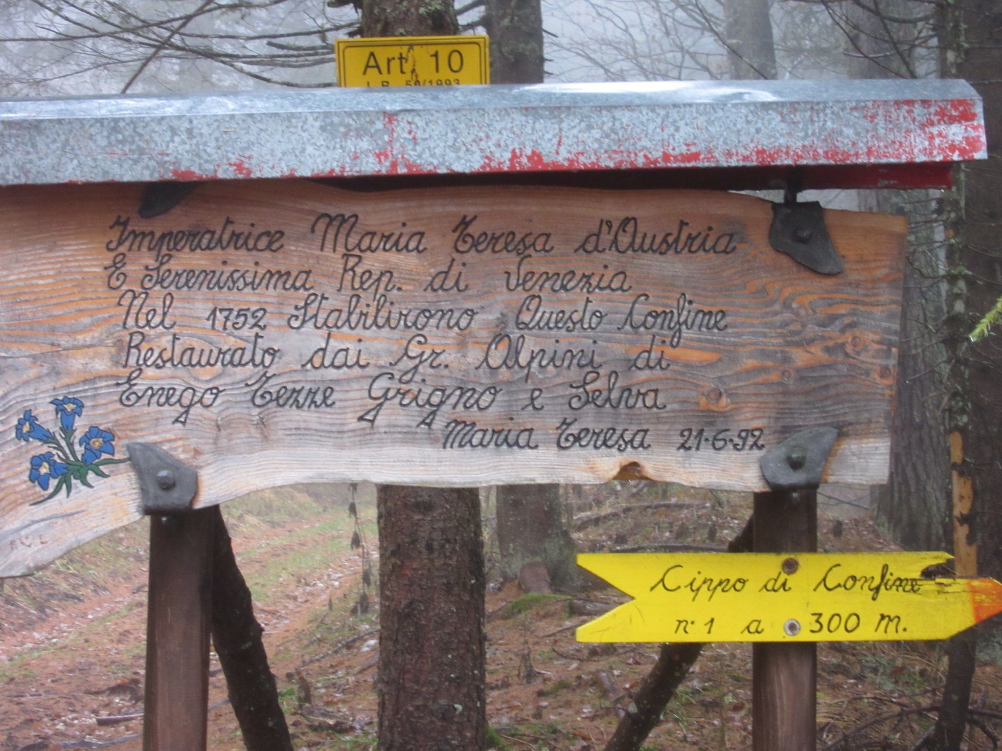 Se si vuole coprire interamente il sentiero dei cippi percorrendo il 869 sappiate che metà cippi non si vedranno , stessa cosa dicasi per il 869B non si riuscirà a coprire tutti i cippi . Pertanto io provvedo a documentare il sentiero dei cippi come tale non tenendo conto della variazione del segnavia , sarà pertanto vostra la discrezione di imboccare il giusto segnavia . Ricordo inoltre che il sentiero non risulti ben segnalato in alcune parti importanti per l’orientamento e che bisogna in ogni caso valutare bene la lunghezza di questi due sentieri . E un vero peccato perche questo sentiero dei cippi di confine eretti nel 1752 sia fantastico , con un sottobosco e terreno adibito al pascolo molto bello e molto ben tenuto , ed panorami sulla piana di Marcesina , Valmaron e la Valsugana veramente unici e fantastici .