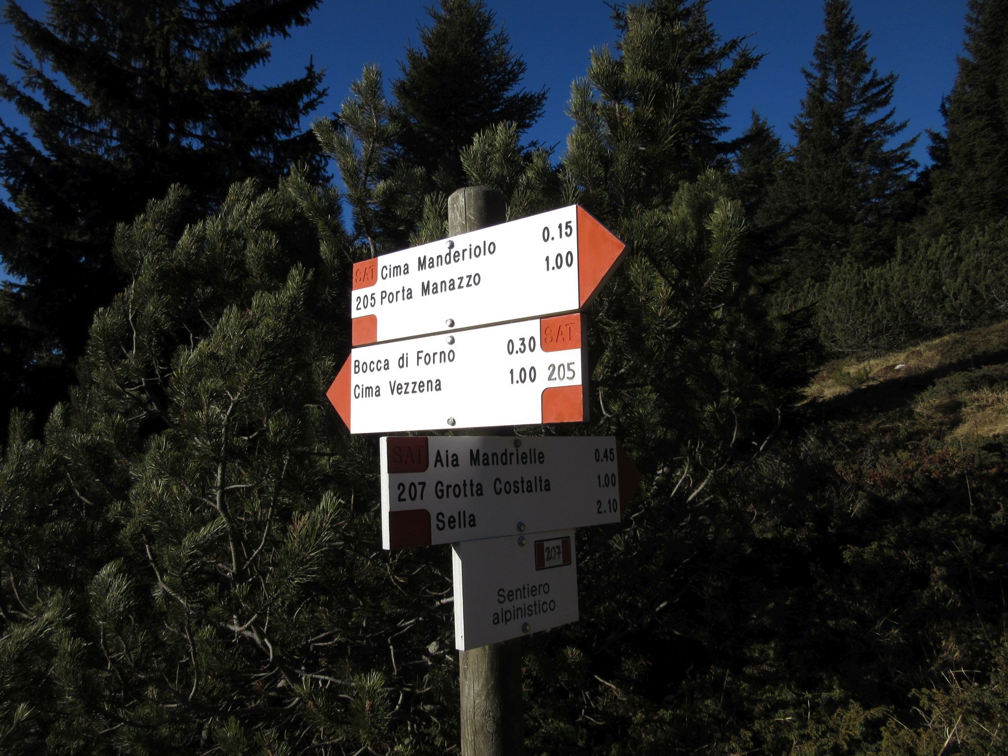 Il sentiero 205 non partirebbe da li ma da qualche km più a nord , ma risulta essere più utile partire da li salendo dopo l’albergo prima verso il forte Busa Verle (vedi il post Busa Verle) da dove come narrava Fritz Weber parti il primo colpo di cannone verso il forte Vezzena perche avrebbero visto alcuni fanti italiani salire verso il forte. Si sale il sentiero 205 su un terreno ripido e divenuto oramai boschivo verso il forte Vezzena situato ad una quota molto più alta , il sentiero poi esce dal bosco e sale ripido su fondo roccioso e strapiombante verso il lago di Levico e Caldonazzo donando dei scenari fantastici ed incredibile , il sentiero e sicuro e non presenta difficoltà senonchè la salita che poi spiana leggermente quando si incrocia la mulattiera , per poi vedere il Forte nella sua grandezza ( vedi post Forte Spitz Vezzena – Werk Vezzena ) il sentiero poi prosegue con saliscendi passando per Bocca di Forno , risalendo verso cima Mandriolo per poi arrivare fino a Porta Manazzo , con una visuale verso Malga Larici .