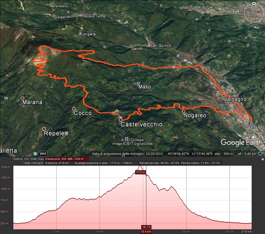Itinerario : Valdagno – Giani – Visonà- Castelvecchio – Cima marana – Baita vecia – Val del Boia