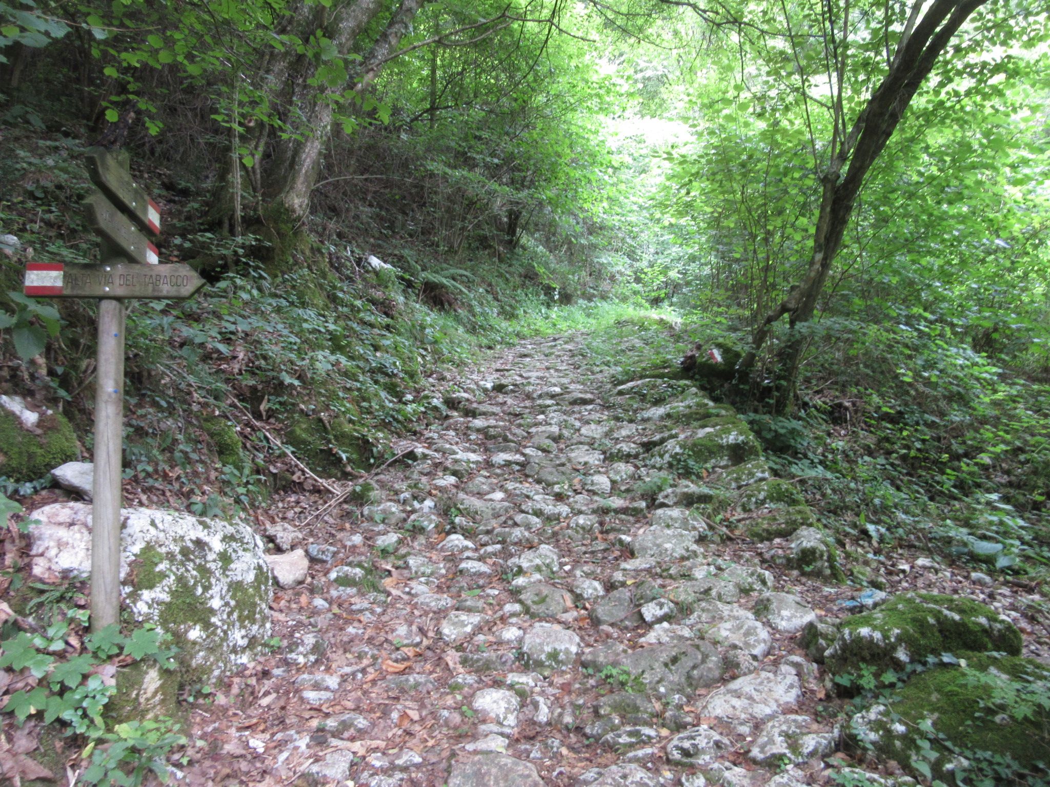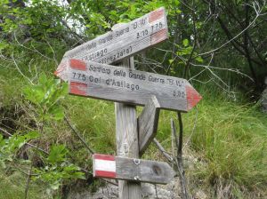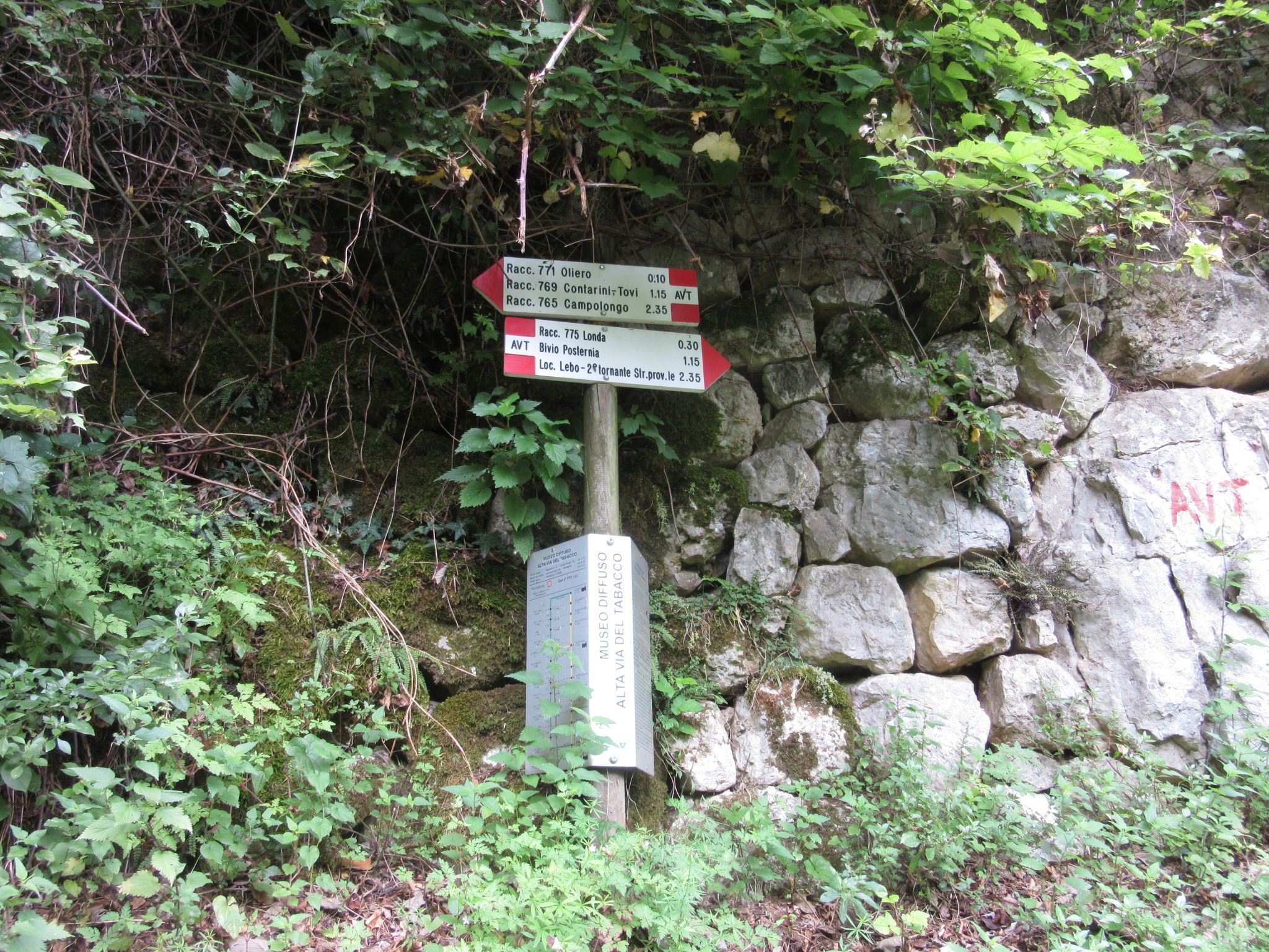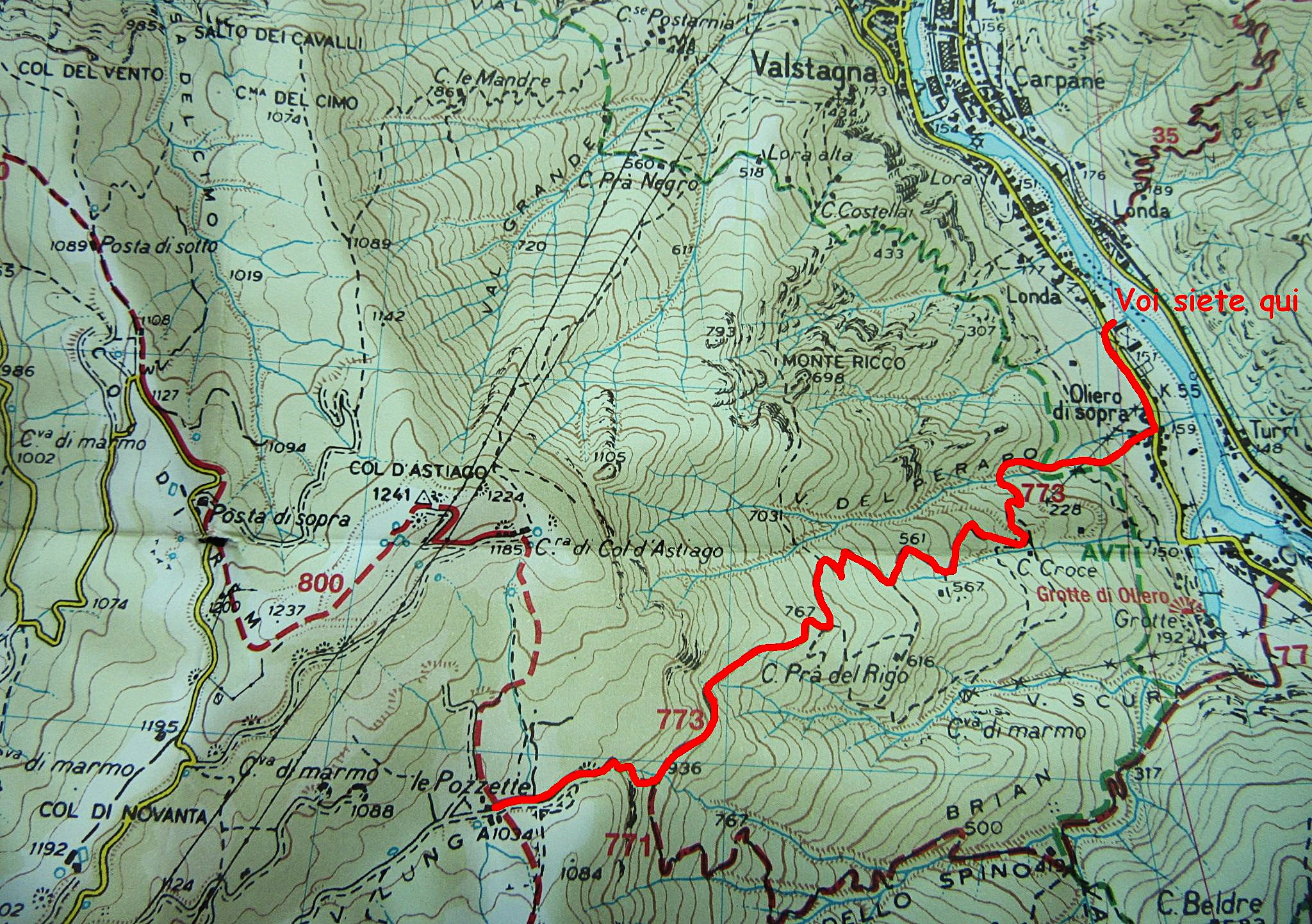 Dopo aver imboccato la Valsugana da Bassano del Grappa si prosegue a sinistra del Brenta , oppure si percorre la superstrada per Trento fino ad arrivare ad un ponte per raggiungere le Grotte di Oliero , superata l’entrata delle Grotte e arrivati al cimitero di Oliero in località Londa , si lascia l’auto e si prosegue a piedi superando la casa di riposo e si entra in un cortile di una casa segnalato attraverso il segnavia bianco rosso , si passa sotto un portico e si inizia una fantastica risalita attraverso i terrazzamenti ( masiere ) adibiti alla coltivazione del Tabacco , su supera una postazione di artiglieria e si entra nel sentiero dell’alta via del Tabacco , che viene percorso in parte , il sentiero e molto piacevole da percorrere anche se in alcuni tratti e ripido , molte sono le postazioni di avvistamento che permettono una visione panoramica del paese di Valstagna e della medesima valle , usciti dall’alta via del tabacco si incontrano diverse postazioni , si sale sulle cenge esposte, ma il sentiero è largo e buono, si attraversa l’impluvio della Valle Mille Covoli, quindi ai ricoveri del terrazzo roccioso, con grotte e trincee, della Grottona da dove si gode della più bella panoramica sulla Valbrenta, dalla forra di Cismon a Bassano del Grappa. Questo sentiero nel suo complesso e molto molto bello come del resto buona parte dei sentieri della Valstagna , anche se viene definito impegnativo io trovo che sia adatto a buona parte delle persone a cui piace la montagna , e d’obbligo una visita alla fantastica Malga Pozzette , che rientra nella parte di discesa del percorso per rientrare fino ad Oliero percorrendo prima il sentiero 800 e poi imboccando la fantastica mulattiera adibita alla salita del bestiame all’alpeggio sentiero 773