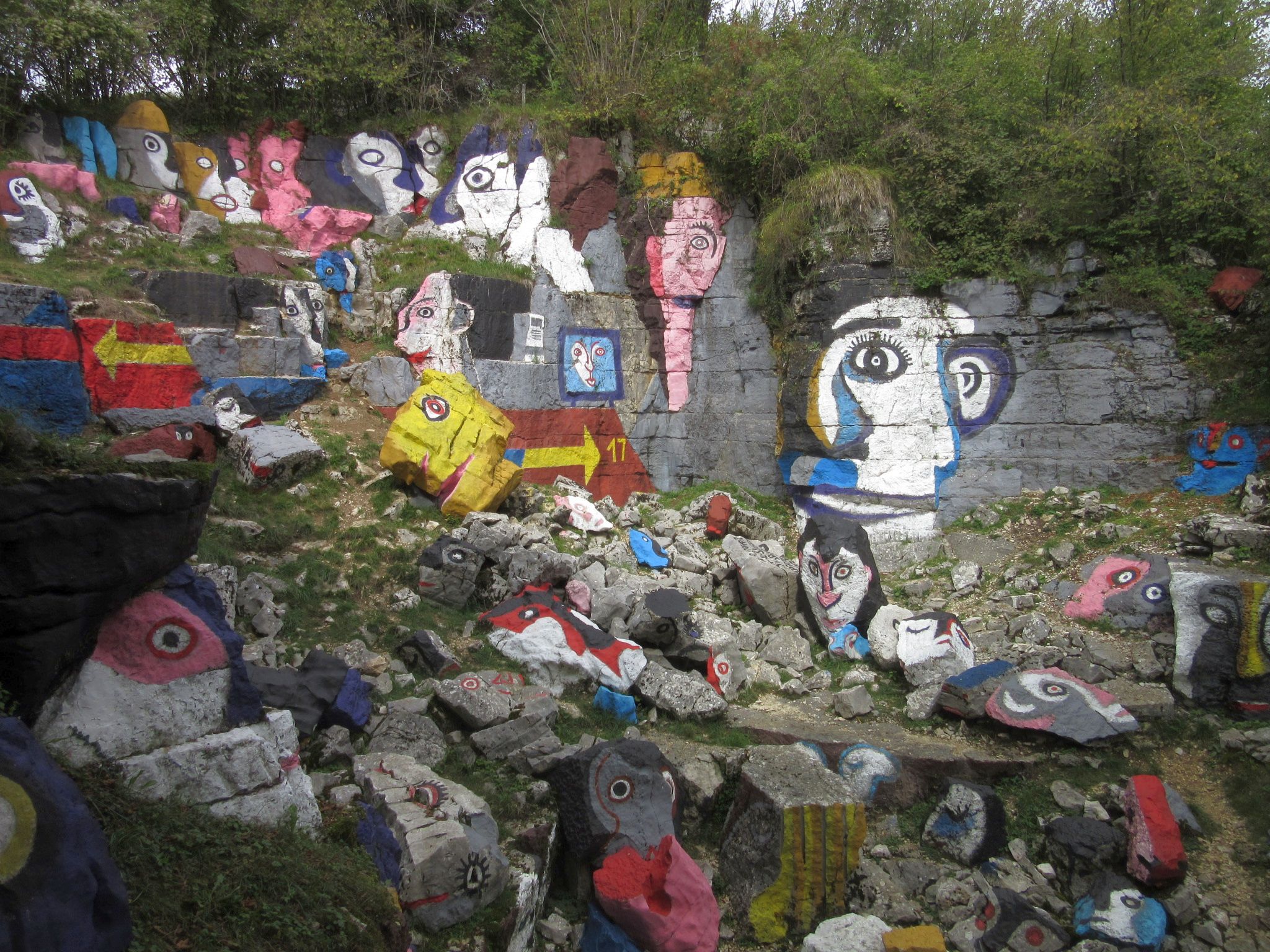 Un colpo d’occhio che ti catapulta dal brutto creato, alla bellezza ricreata: “La cava , ingoia tutto anche il peggio di noi. Scesi lungo il costone verde della montagna a strapiombo sulla pianura antistante, il verde degli alberi incornicia il mosaico di colori sgargianti della “Cava Dipinta”, che ritraggono le forme più disparate. Simboli e archetipi, tutti ritratti su pareti e massi dalle forme antropomorfe.Rocce che l’artista oggi non esita a definire come dei “compagni di viaggio. Sono i miei guardiani”.
