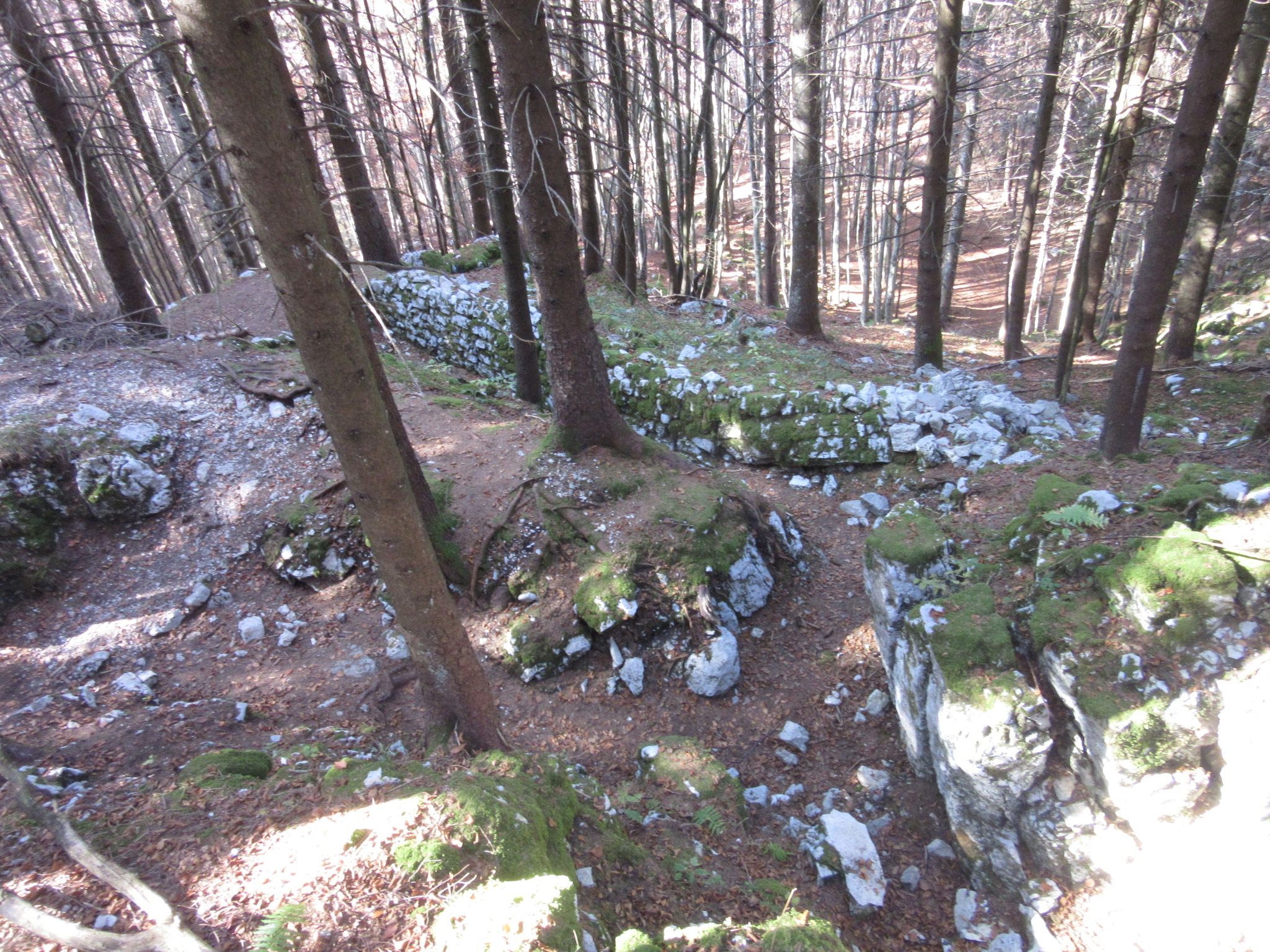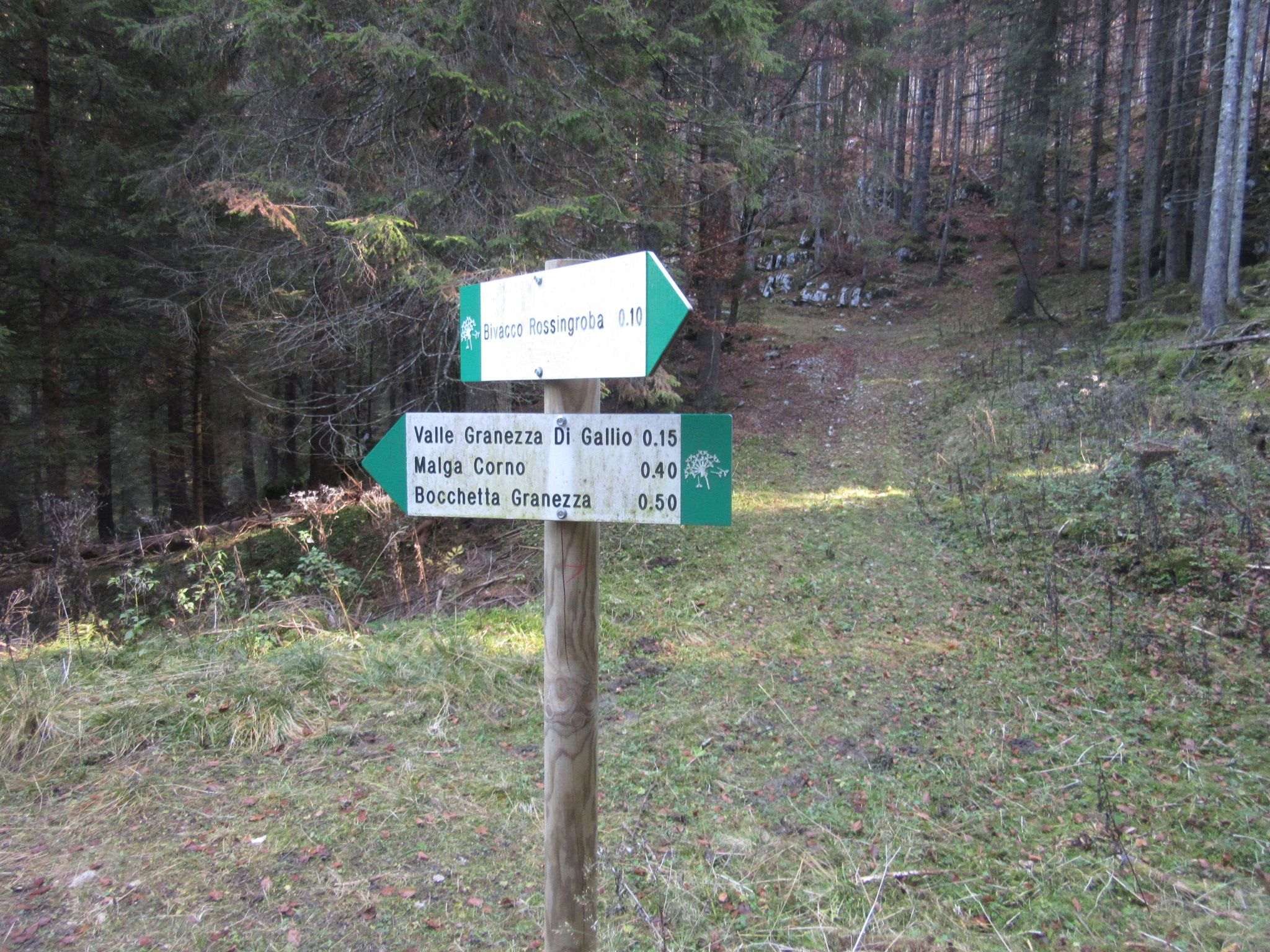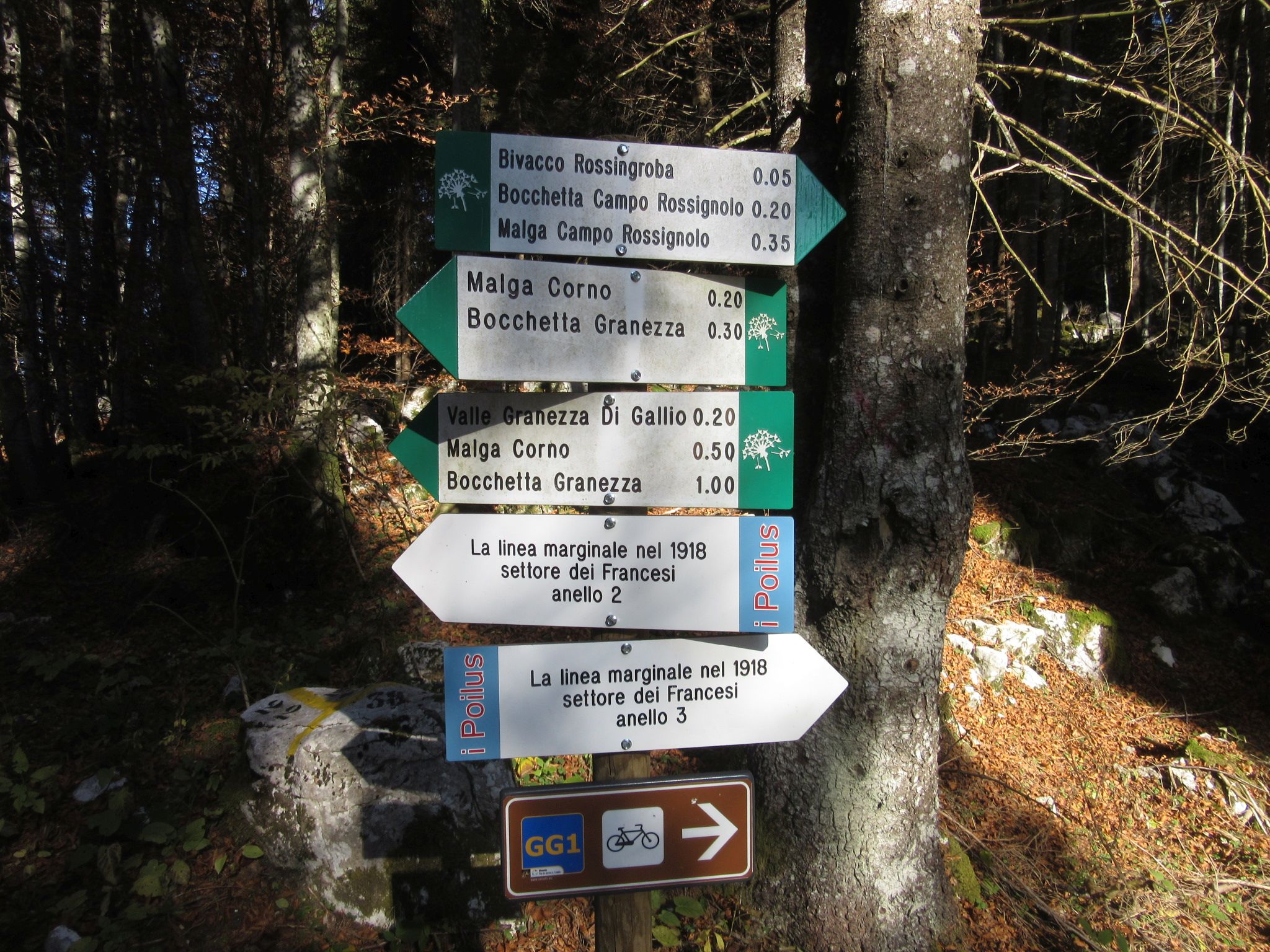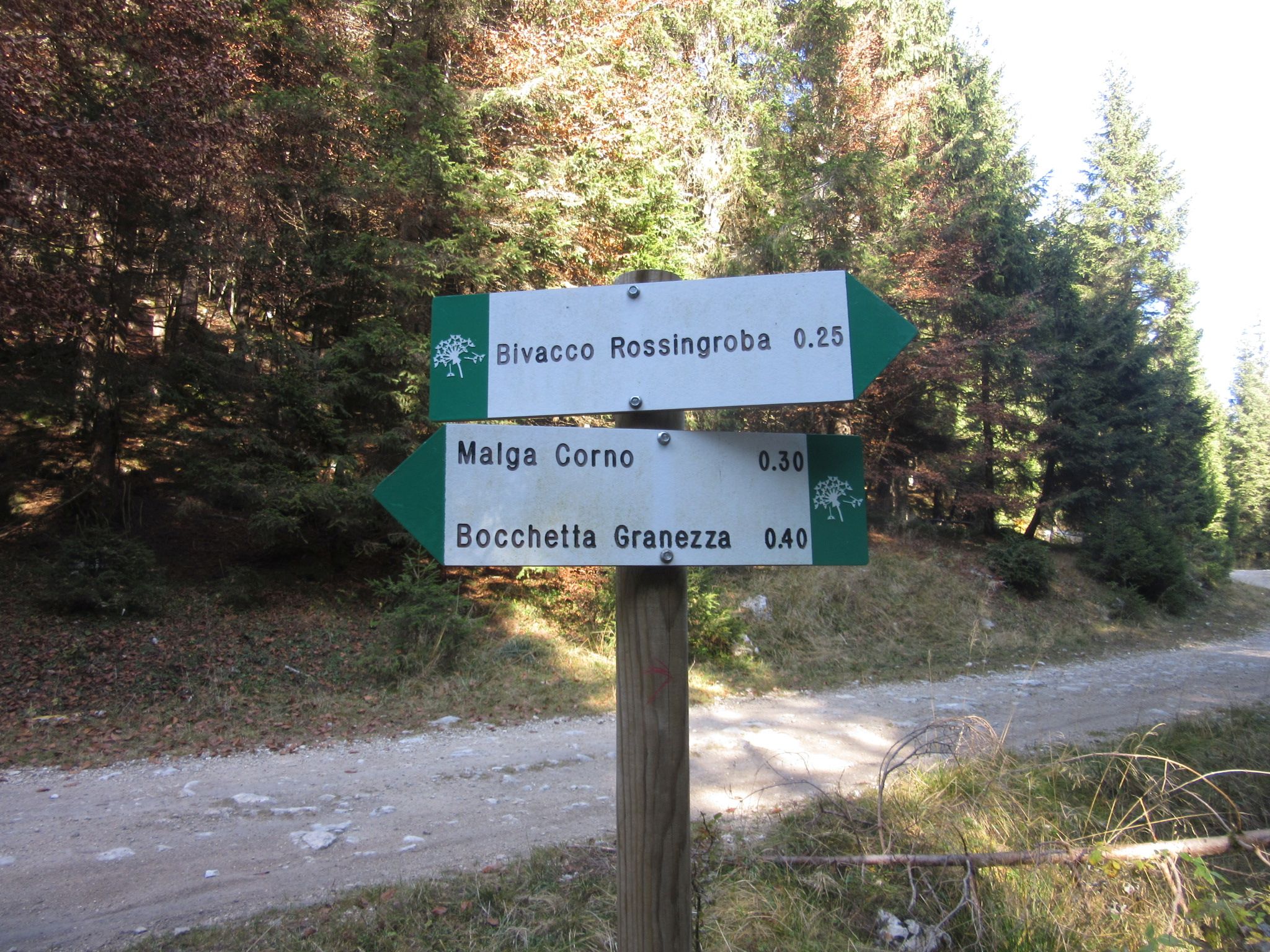 Dopo aver raggiunto in auto il Monte Corno di Lusiana , si lascia l’auto nel posteggio di Bocchetta Granezza , e da li si parte a piedi , in una delle due direzioni , io ho preso quella che sale a destra verso il monumento del Monte Corno . Prima si sale a Malga Monte Corno attraverso una stradina sterrata molto panoramica inizialmente in quanto guarda verso la pianura , per poi superare Malga Campo Ovest in lontananza e poi al bivio si scende a Malga Campo Est tenuta la malga a destra e seguendo il crinale fino all’entrata di un bosco dove si può notare il passaggio di una carrareccia boschiva , mantenendo la sinistra si scende nel bosco e si mantiene la rotabile , massima attenzione in questo tratto poco segnalato , si scende fino ad incrociare il segnavia 886 per un centinaio di metri fino ad arrivare a Bocchetta Camporossignolo , da li proseguendo per la strada sterrata si arriva a Malga camporossignolo mantenendo la malga a destra si arriva ad un bivio che sale sulla sinistra e che porta attraverso un nuovo tratto boschivo fino al Bivacco Rossingroba , molto bello , da li si continua fino ad raggiungere la valle granezza di Gallio che a circa 200 metri dall’entrata nei ampi pascoli della Valle sulla sinistra sale il sentiero che porta al Labirinto del Monte Corno tutto boschivo fino ad arrivare nel tratto del trincerone sulla dorsale opposta a Monte Corno , il trincerone finisce con una trincea ricostruita secondo le notizie e le ricostruzioni storiche della famosissima Feritoia n°14 del Monte Zebio. Per poi arrivare al cimitero inglese di Granezza , donato il suolo all’Inghilterra per le perdite subite dagli alleati in questa prima guerra Mondiale .