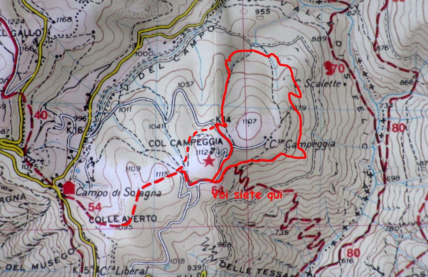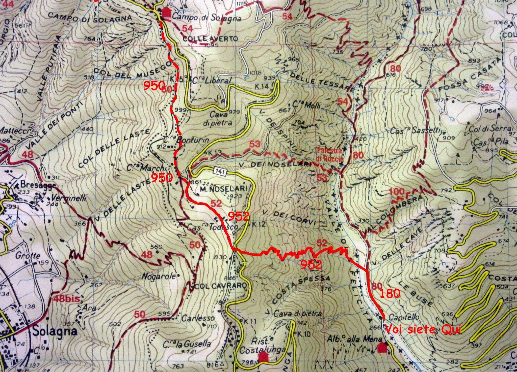 La prima parte del tracciato e dentro alla valle e si segue la numerazione 180 , poi si arriva ad un bivio dove a sinistra si imbocca il 952 Il sentiero è stato recentemente colpito da un incendio pare doloso , che ha bruciato parte del crinale stesso , questo sentiero porta direttamente a Camposolagna ed e molto bello anche se abbastanza pendente e richiede un impegno fisico buono , non presenta difficoltà alpinistiche e propone scenari molto belli nella parte rocciosa in quanto si riesce ad ammirare la stupenda valle di Santa Felicita , non è molto lungo ma a me e piaciuto molto , e molto praticato e con il 953 oppure il 954 chiude il circuito in un anello , che va a coprire parte della valle , arrivati in vetta sul piano si imbocca il 950 che porta direttamente attraverso una mulattiera a Camposolagna , molto bello anche il monumento e la chiesetta situata a circa 300 metri sotto al bivio del Pian dei Noselari . Arrivati attraverso la mulattiera del sentiero 950 si può scendere dal 954 situato poco prima dello stabile che si trova lungo la strada a Camposolagna ovvero la vecchia Osteria , oppure per il 953 , tornando indietro per il pian dei Noselari