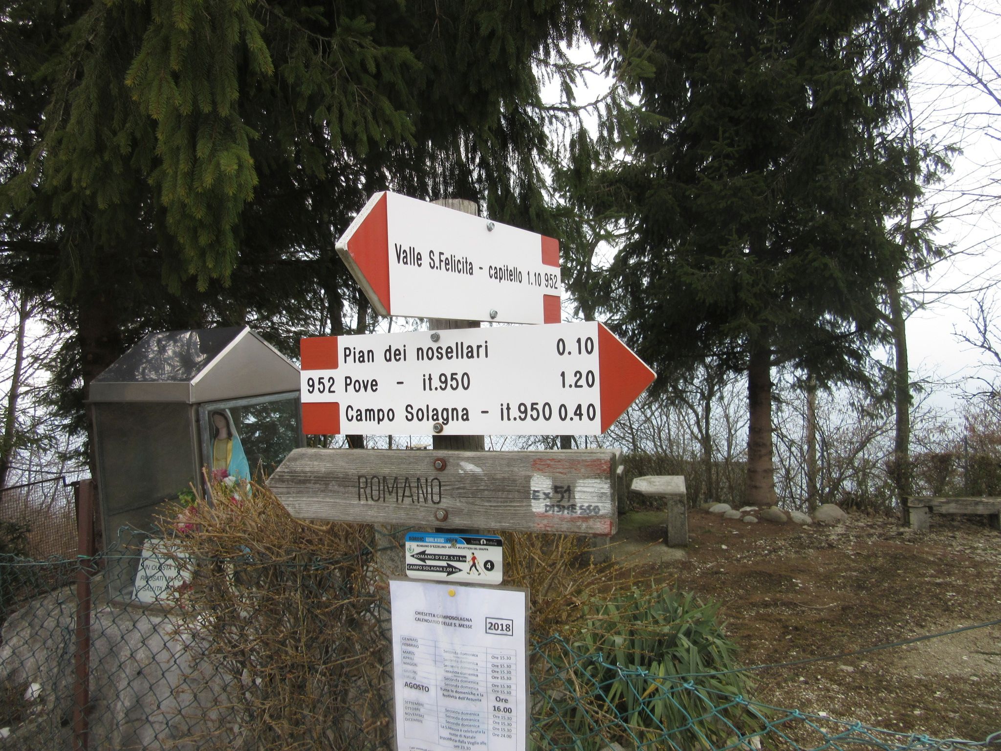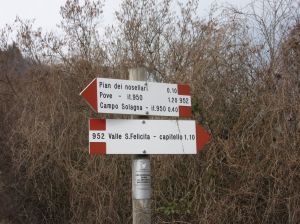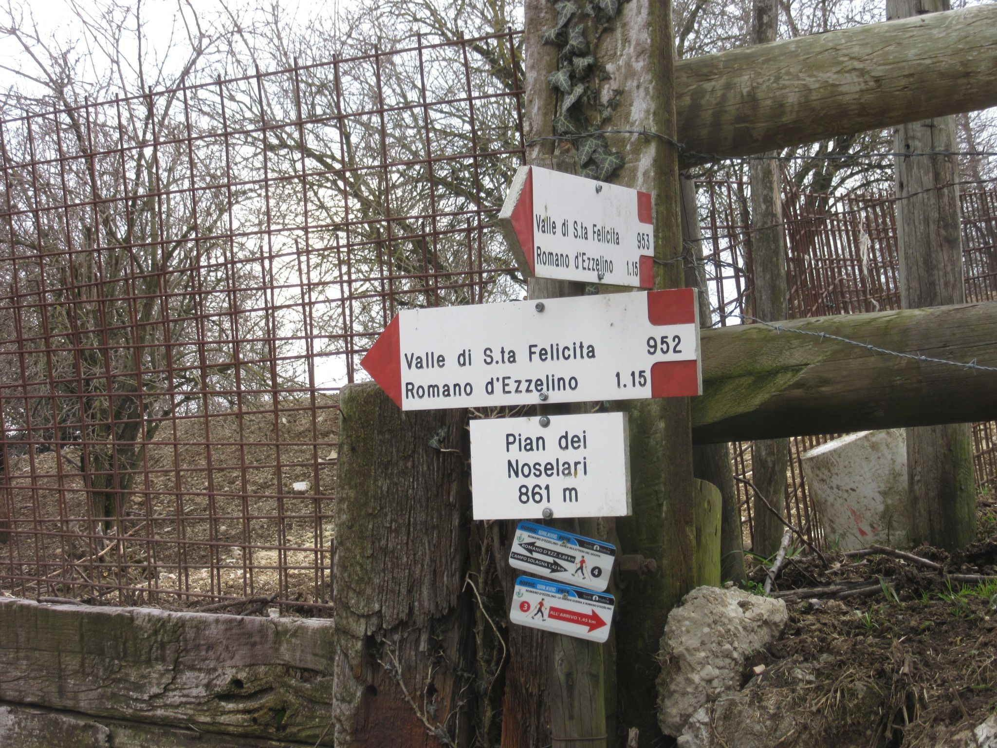 Arrivati in auto a Romano d’ezzelino si prende verso Semonzo e poi si seguono le indicazioni per l’antica abbazia di Santa Felicità oppure nella parte opposta si trova l’albergo alla Mena . Attenzione che in alcune cartine la numerazione potrebbe essere diversa le cartine riportano 52 ma la numerazione dei segnavia e 952 . La Valle Santa Felicita è una delle valli più importanti del Massiccio del Grappa. Profonda e selvaggia, Valle Santa Felicita sbocca tra Romano d’Ezzelino e Semonzo a quota 200 metri , dal punto di vista escursionistico, è molto bella , si entra nella valle che presenta numerose pareti di roccia utilizzate come palestre , i sentieri che la risalgono sono principalmente 2 il 100 Campo Croce e il 180 Cima Grappa , io oggi mi occuperò del 952 che porta a Camposolagna passando per il Pian dei Noselari .
