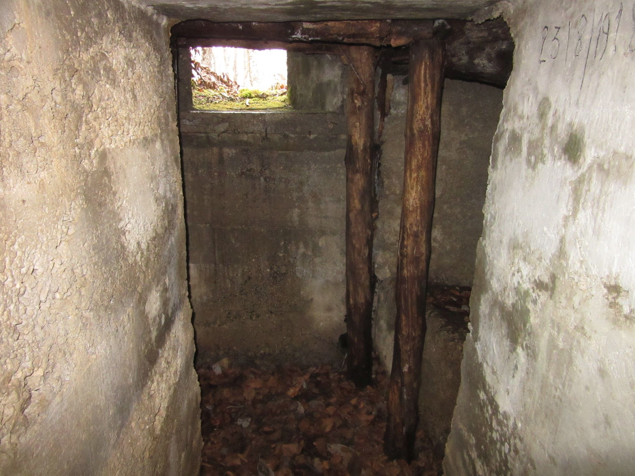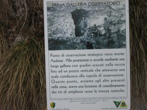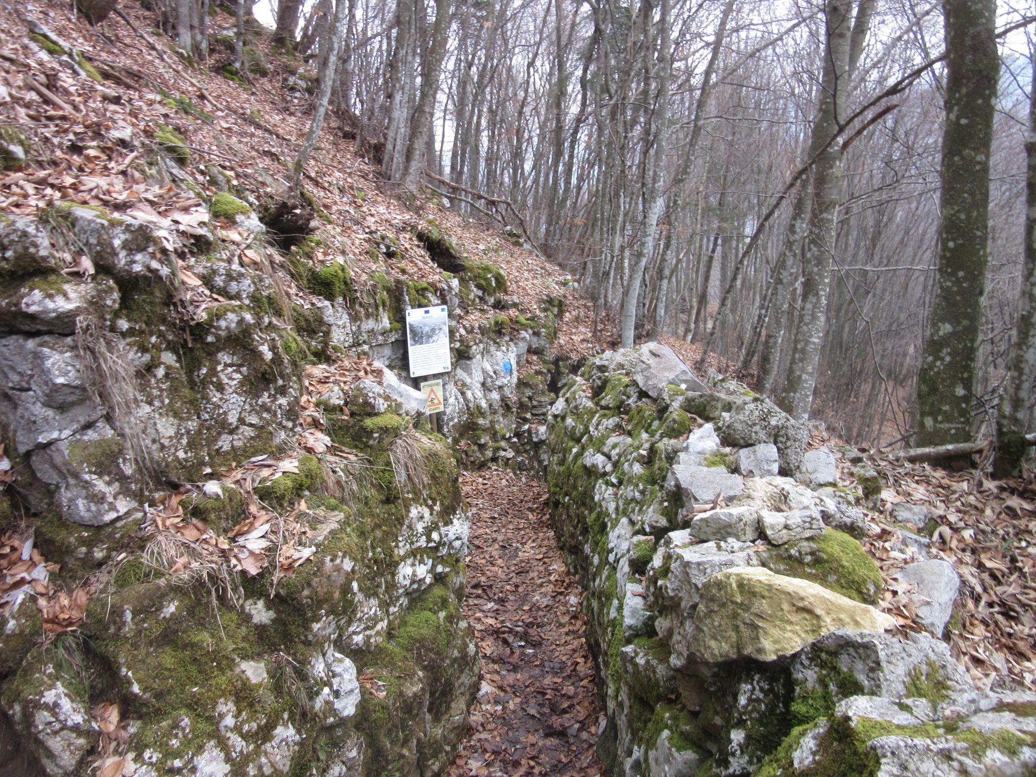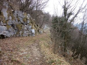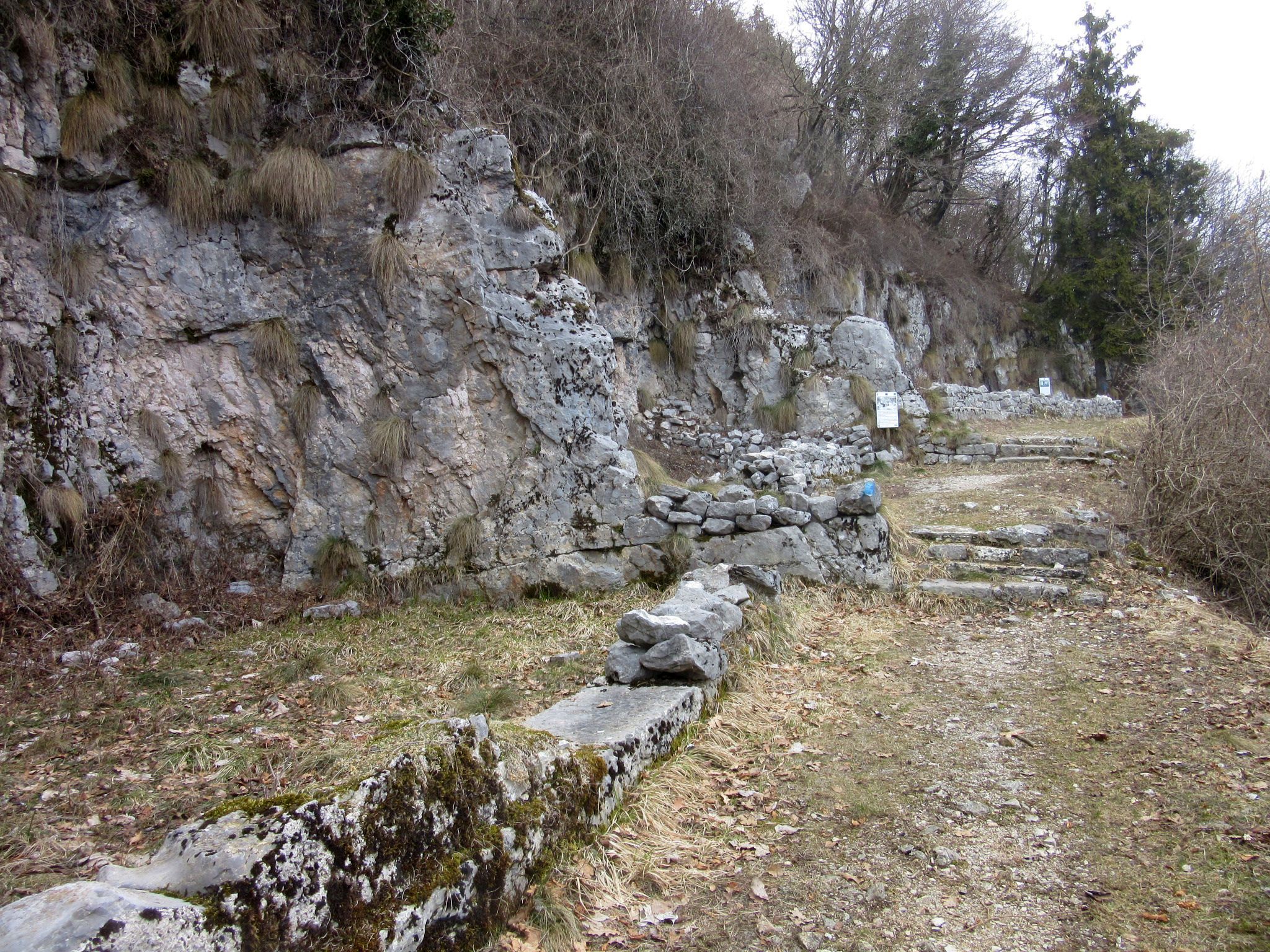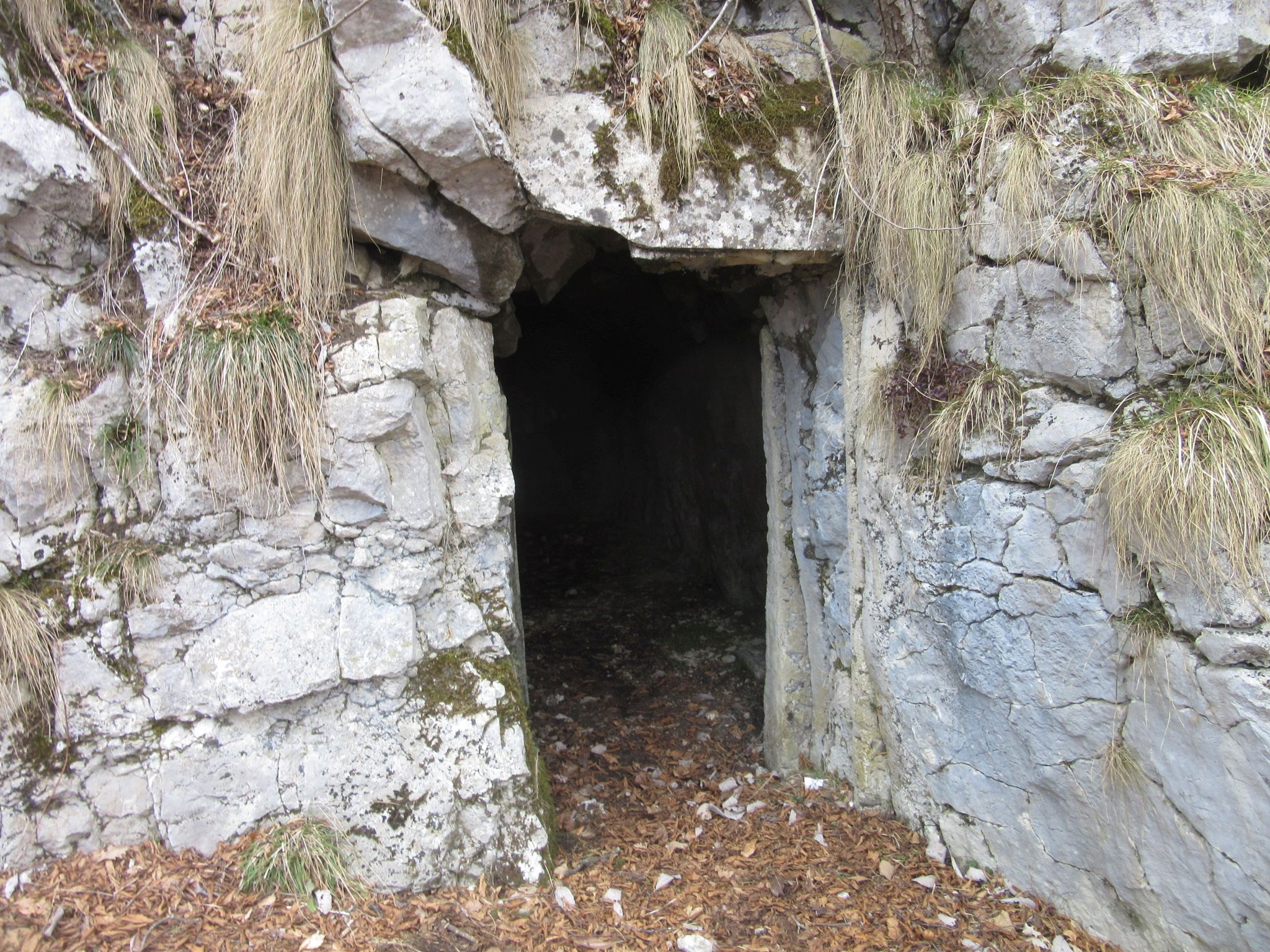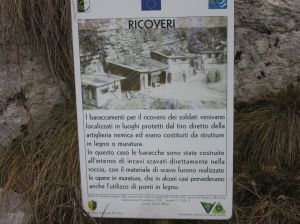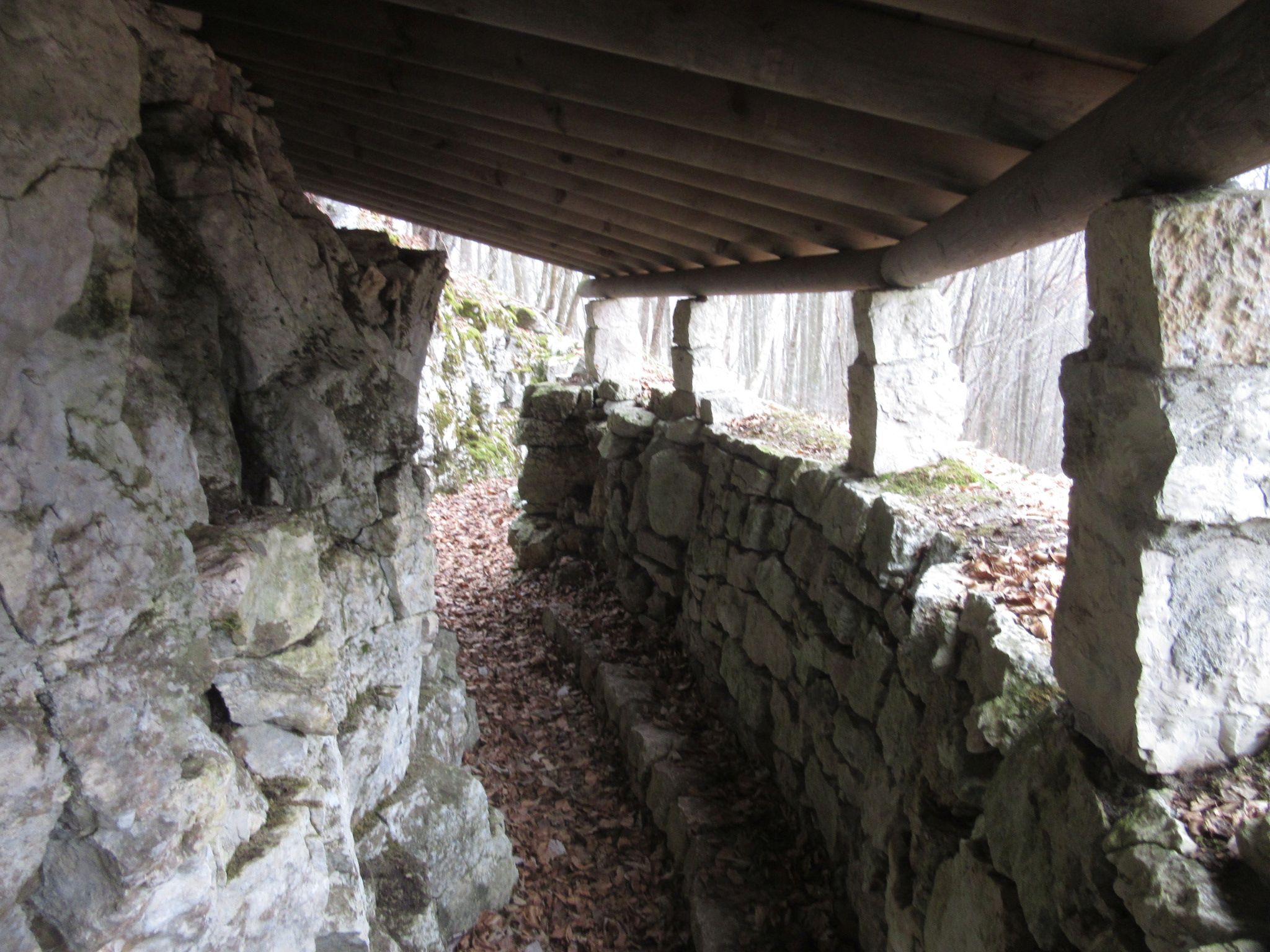 Sul terreno risultano tuttora evidenti i resti degli acquartieramenti ricavati contro roccia negli slarghi della strada militare ed ancor meglio i rifugi incavernati. Dopo aver girato la curva davanti la valle e presa la direzione nord, si incontrano gli slarghi dove erano presenti baraccamenti e ricoveri in pietra e le prime delle nove gallerie che completavano il sistema. Dopo una paio di gallerie a ferro di cavallo, e al termine degli acquartieramenti esterni (baracche e ricoveri), parte una galleria in salita e lunga 35 metri, scavata nella roccia di rosso ammonitico, e dotata di una lunga scalinata incisa nella roccia che conduce ad un pozzo di risalita (osservatorio) posto altre il versante. La scalinata è dotata di un corrimano di corda metallica ed il pozzo si può risalire con una scala di ferro. Un sentiero nel bosco in leggera discesa ci porta, tenendo sempre la destra, al sentiero principale che avevamo lasciato all’ingresso. Si percorre ora una scalinata in discesa e lasciando alla sinistra due ulteriori ingressi di gallerie di modesta importanza, sotto ad una poderosa roccia strapiombante troviamo l’ingresso di una galleria, riconoscibile dai resti di una garrita in calcestruzzo. La galleria, la più articolata e lunga una settantina di metri, fu prevista per la protezione delle truppe durante i bombardamenti. Dopo l’ingresso sotto roccia, si snoda con una serie di allargamenti per gli acquartieramenti. Pregevole è la fattura del muro in pietra, posto all’interno e a destra del corridoio principale, e perfettamente conservato. Curiosi anche i sacchi di cemento pietrificati, con la forma della schiena del mulo, all’ingresso dell’arteria franata a sinistra.
