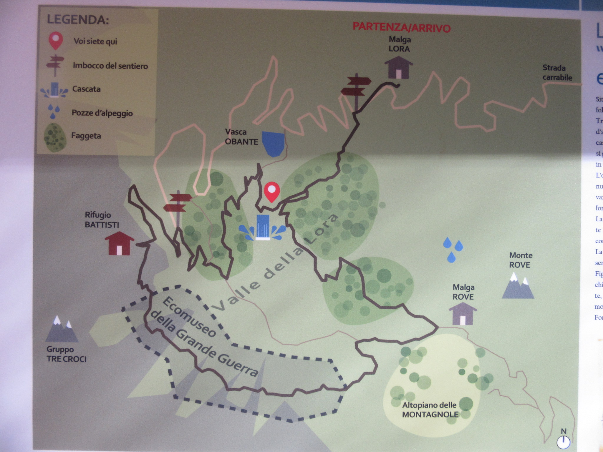 Si tratta di un itinerario facile per tutti, ma molto bello, con diversi tipi di ambienti e terreni, ideale anche per l’inverno con le ciaspole. Si parte da Malga Lora 922 m, in Località Zalica, si sale fino alla prima curva della strada asfaltata proprio sotto alla Trattoria Obante, superando la sbarra di accesso, il sentiero sale lieve, privo di difficoltà su una mulattiera che porta verso Malga Rove 1170 m, superata la malga si sale attraverso il n.120, che porta al Rifugio Cesare Battisti 1265 m, passando prima sul bivio con il n.121 a quota 1240 m. del Passo Ristele 1641m, proseguendo su questo percorso si incrocia anche il bivio con la Trincea di Sarantonio e alle pendici del Monte Zevola 1976 m, sotto il Vajo della Fratta Grande e il Vajo dell’acqua, giunti al Rifugio Cesare Battisti si scende fino ad imboccare di nuovo il sentiero che scende nel bosco e verso le tre cascate che raccolgono acqua per la Vasca dell’Obante 1028 m. della centrale posta poco sotto la Località Zalica, per poi ridiscendere fino a Malga Lora.